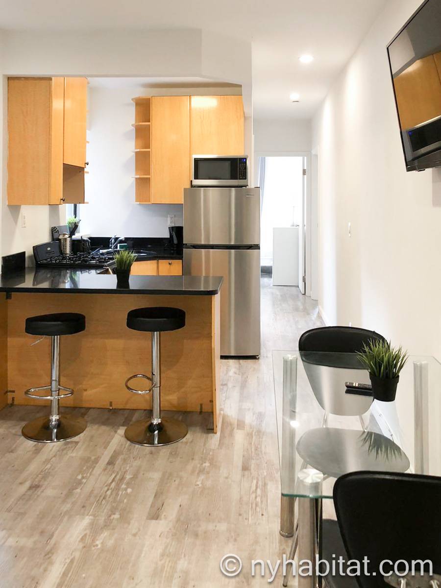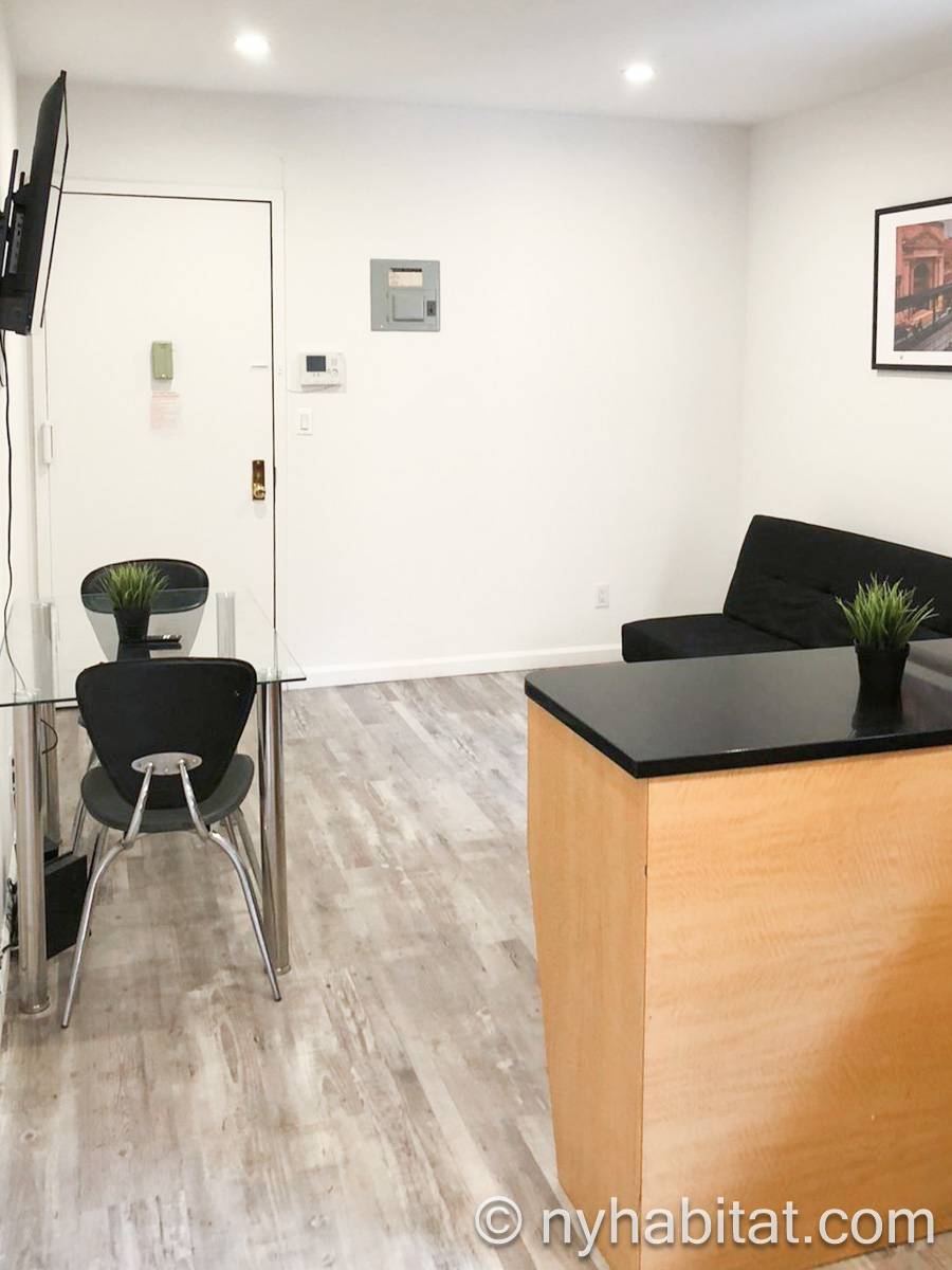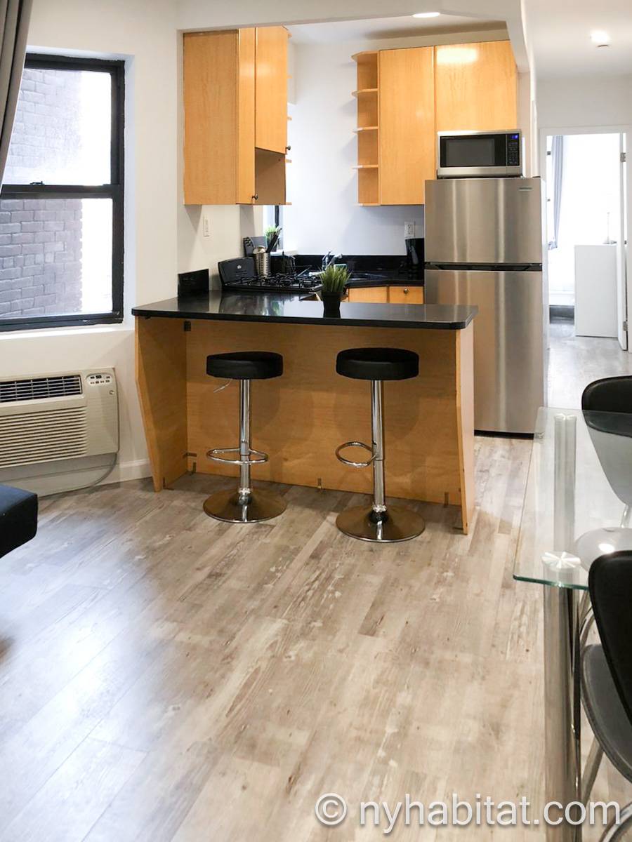 This two-bedroom, one bathroom furnished apartment is located in the neighborhood of Midtown West in Manhattan, New York City. Situated between West 51st Street and 9th Avenue, this apartment rental will bring you to the fourth floor (same as the third floor in Europe) of an elevator building. The building has laundry facilities.