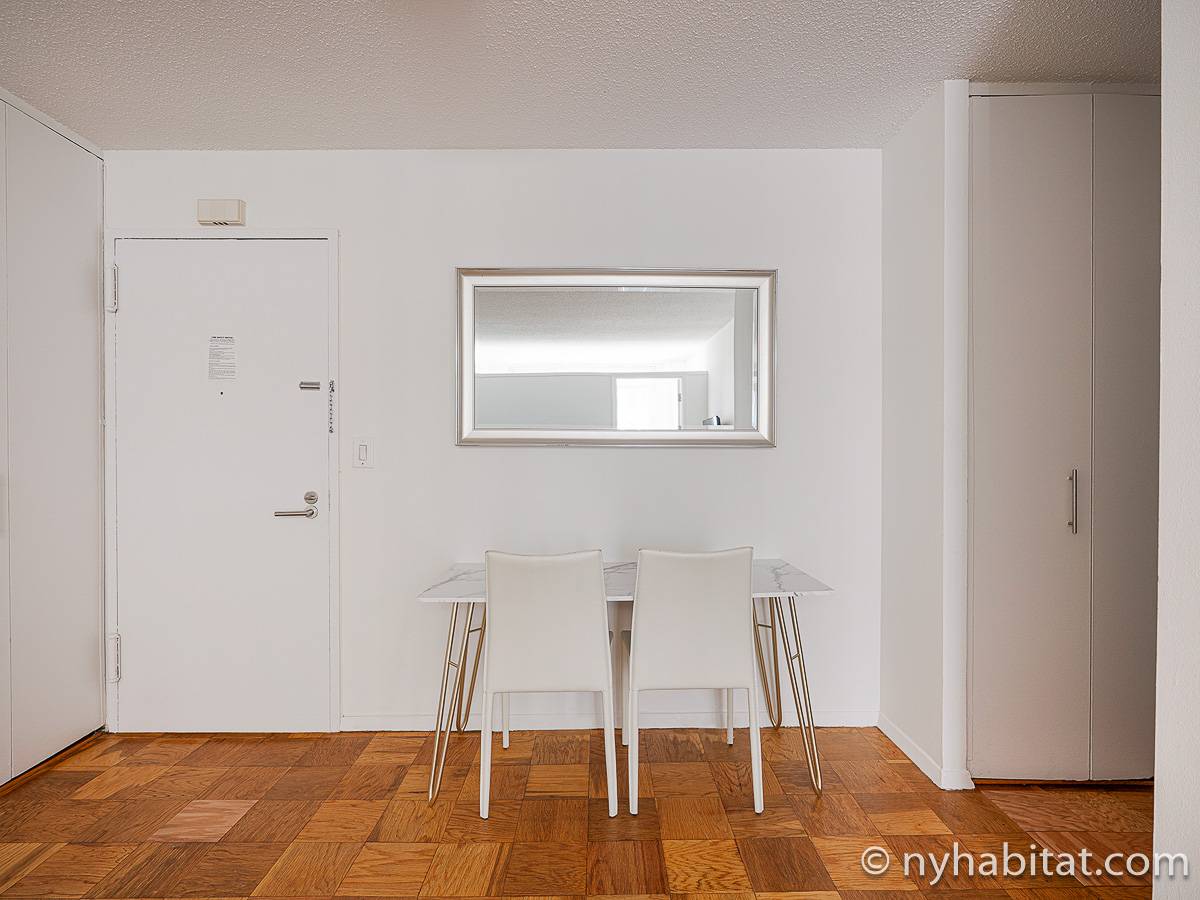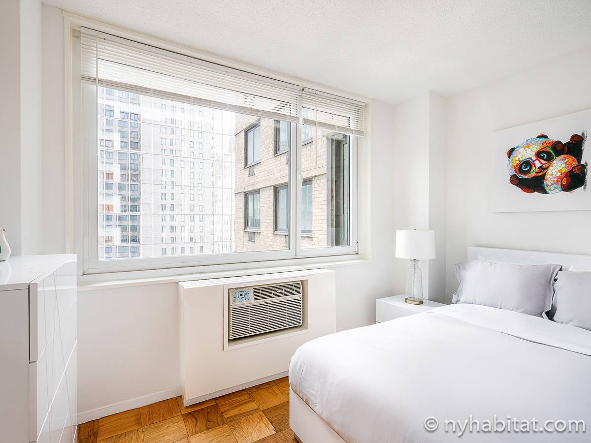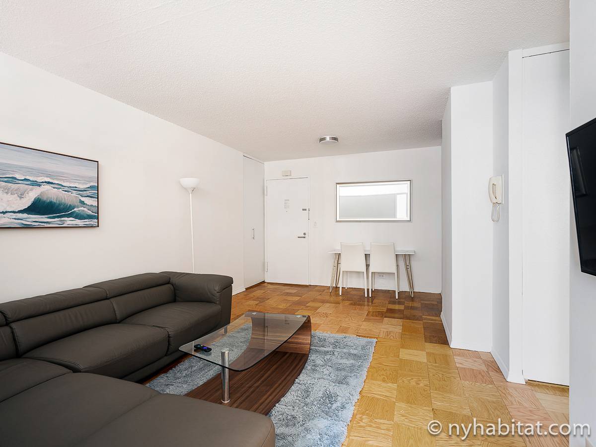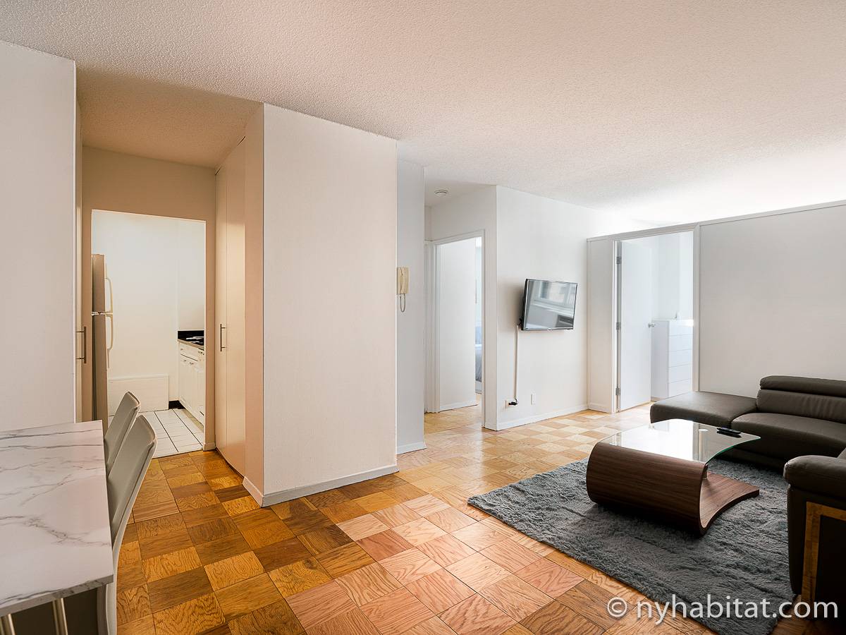 This fully furnished apartment is a two-bedroom, one-bathroom available in New York City! Situated on the corner of West 55th Street and Broadway in Midtown West, Manhattan you may find yourself enjoying views from the 17th-floor (same as the 16th floor in Europe). The high-rise building has an elevator, gym, garage, rooftop deck, and doorman.