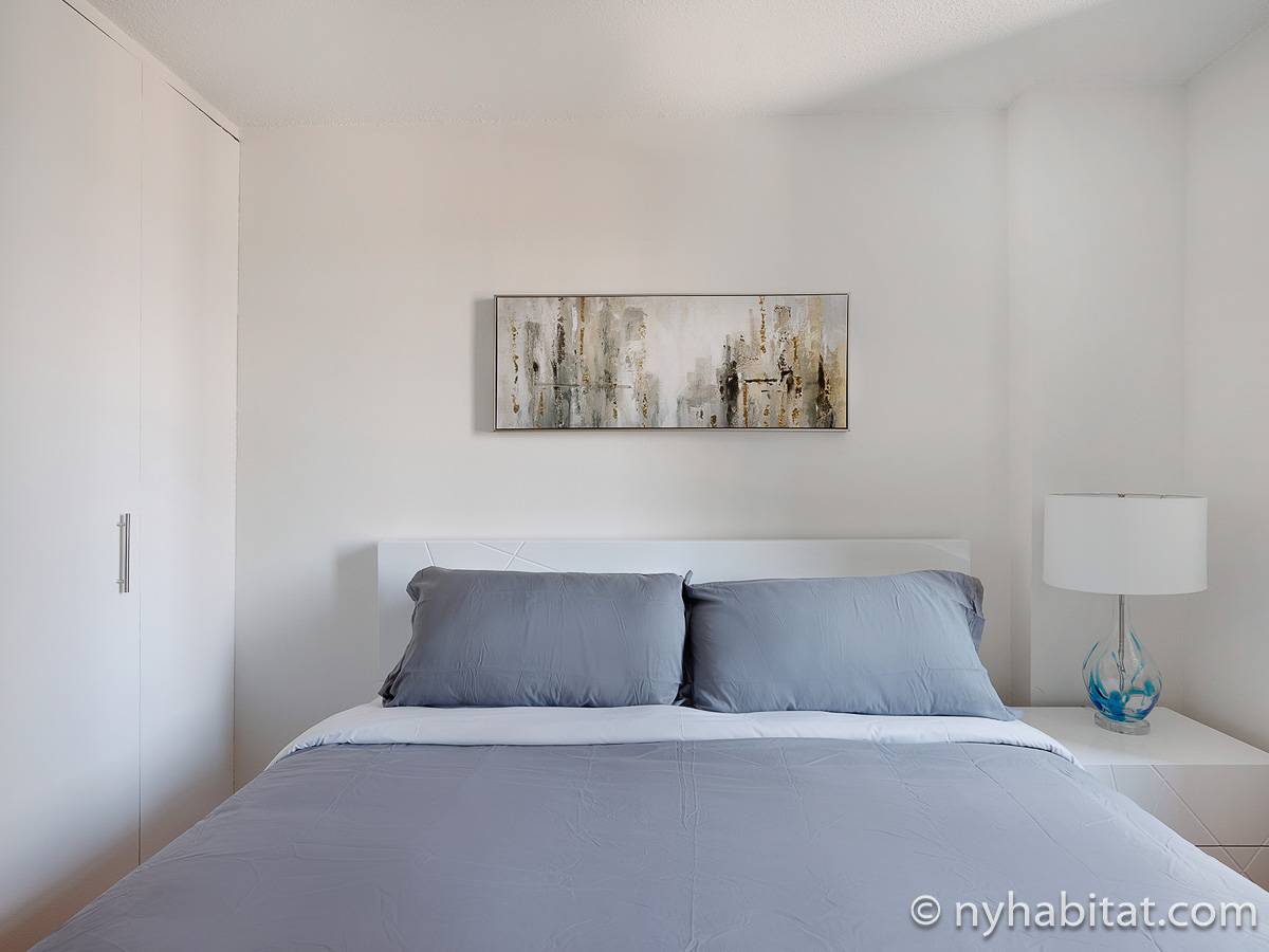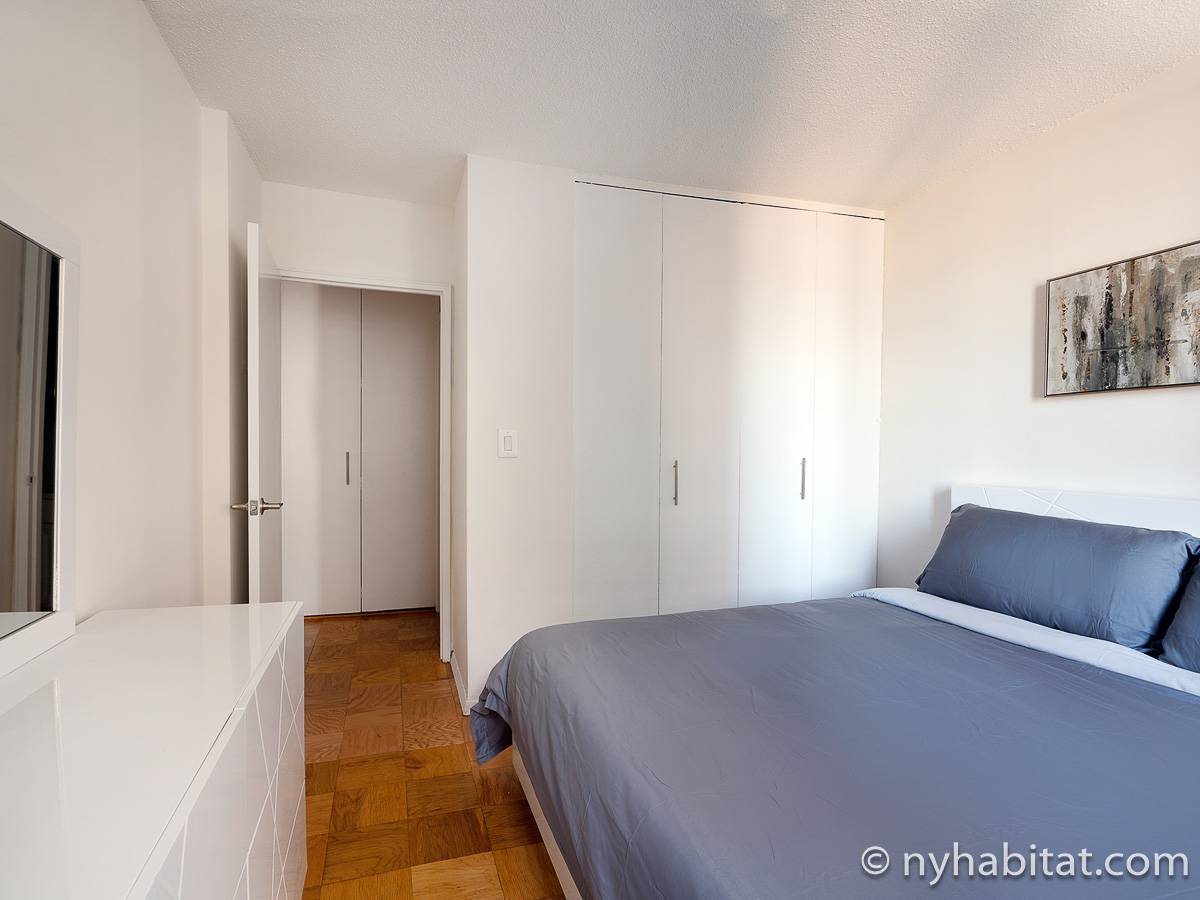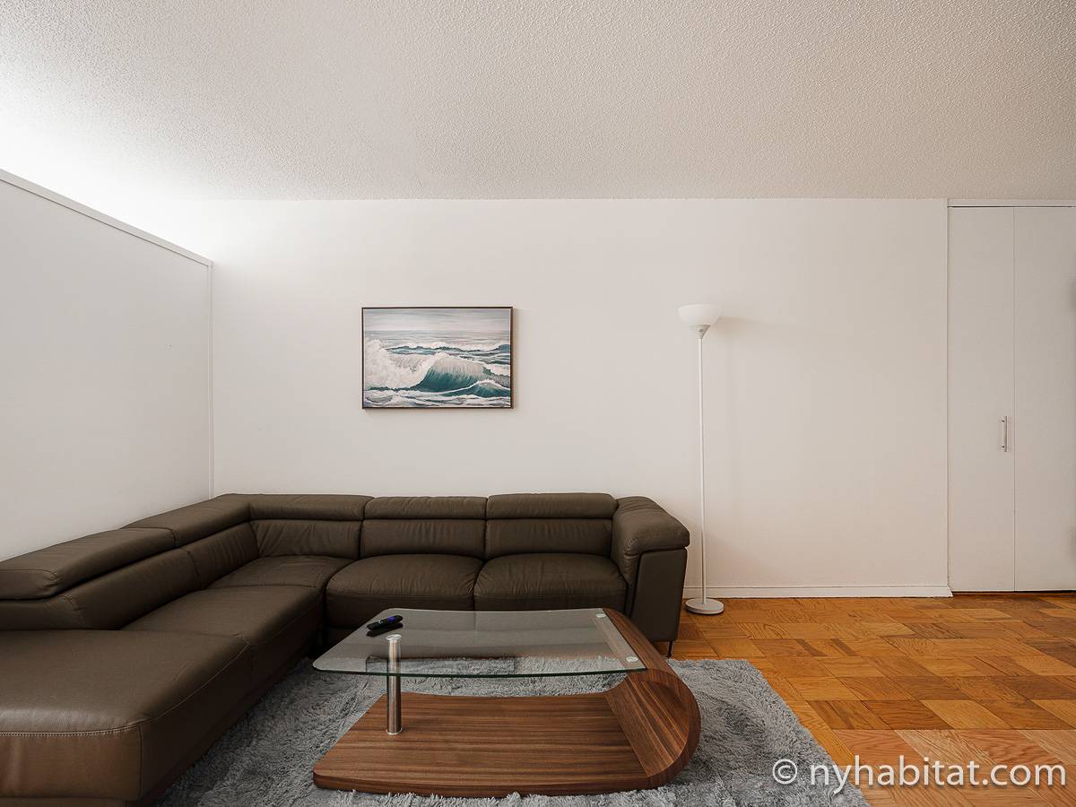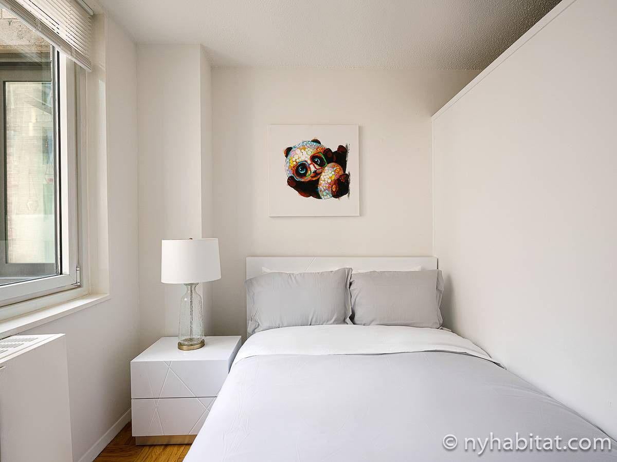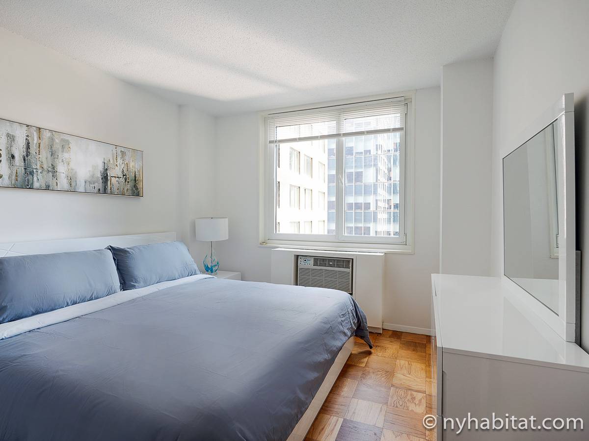 This fully furnished apartment is a two-bedroom, one-bathroom available in New York City! Situated on the corner of West 55th Street and Broadway in Midtown West, Manhattan you may find yourself enjoying views from the 17th-floor (same as the 16th floor in Europe). The high-rise building has an elevator, gym, garage, rooftop deck, and doorman.