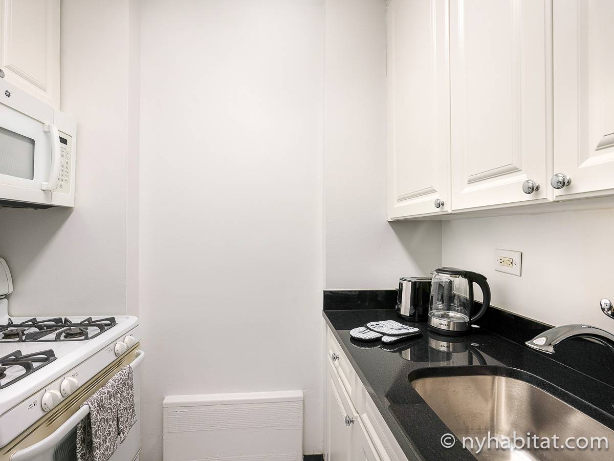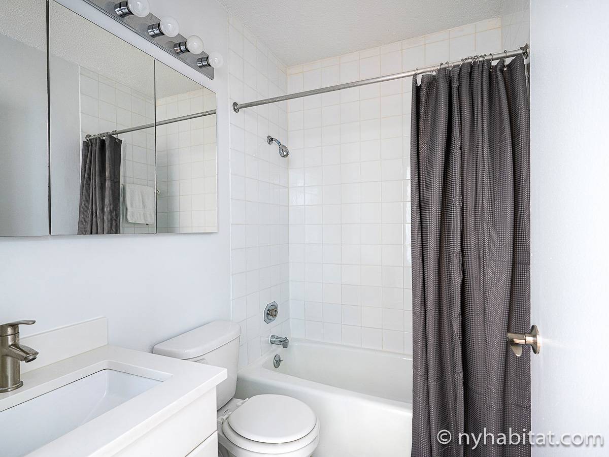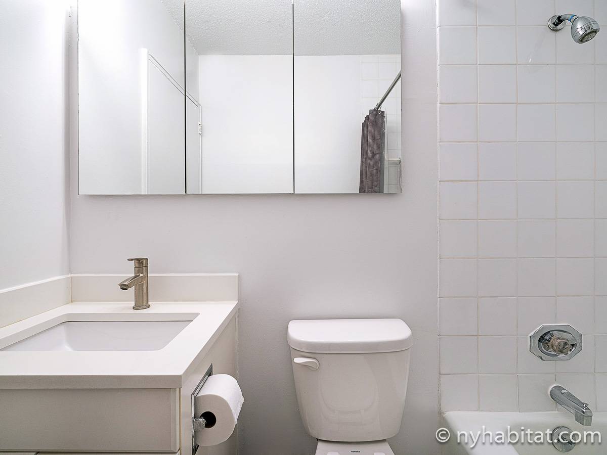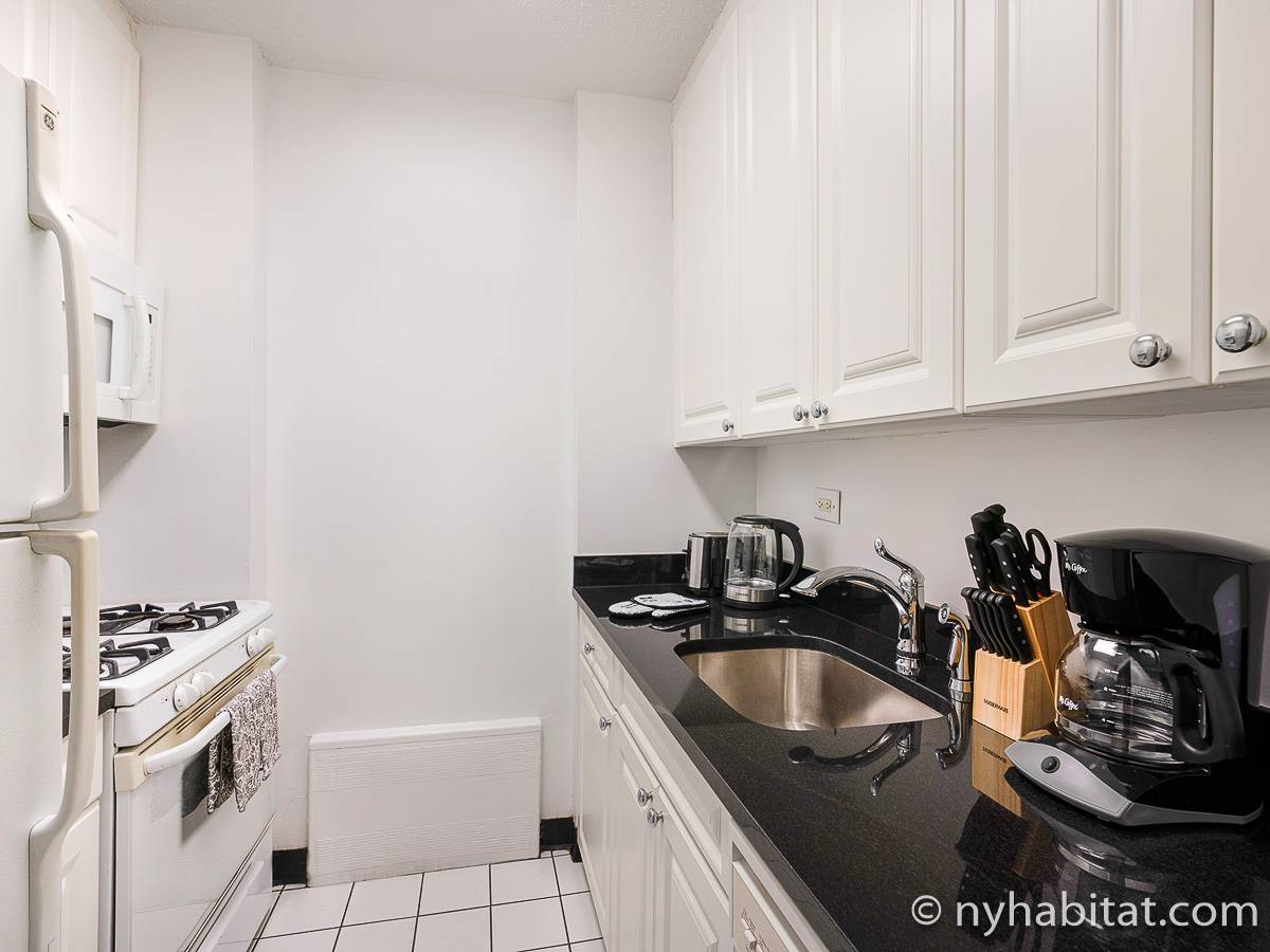 This fully furnished apartment is a two-bedroom, one-bathroom available in New York City! Situated on the corner of West 55th Street and Broadway in Midtown West, Manhattan you may find yourself enjoying views from the 17th-floor (same as the 16th floor in Europe). The high-rise building has an elevator, gym, garage, rooftop deck, and doorman.