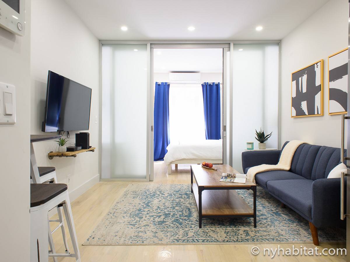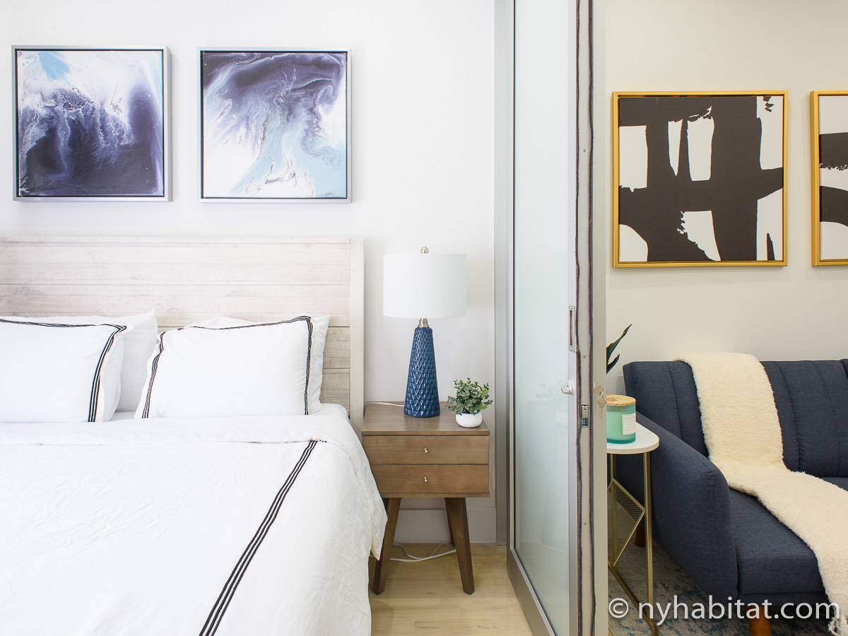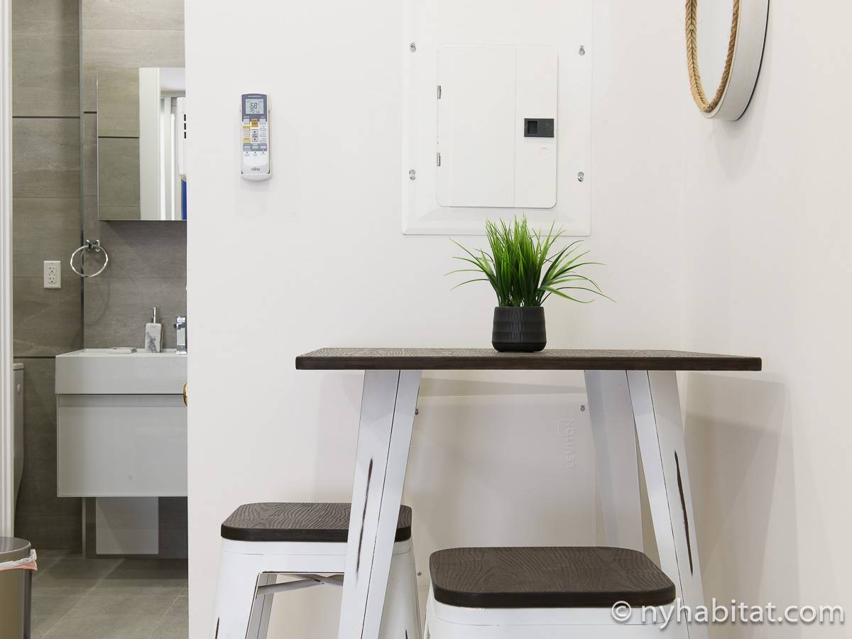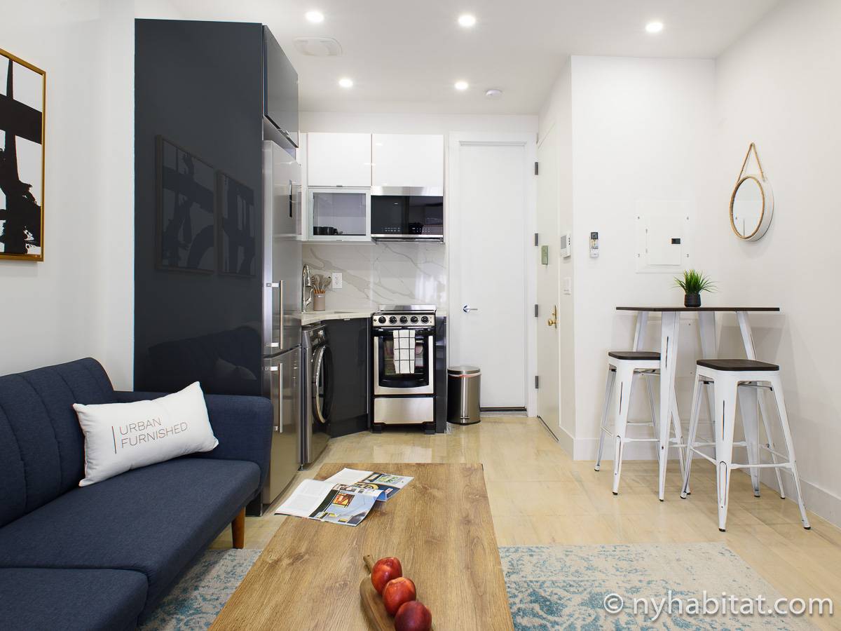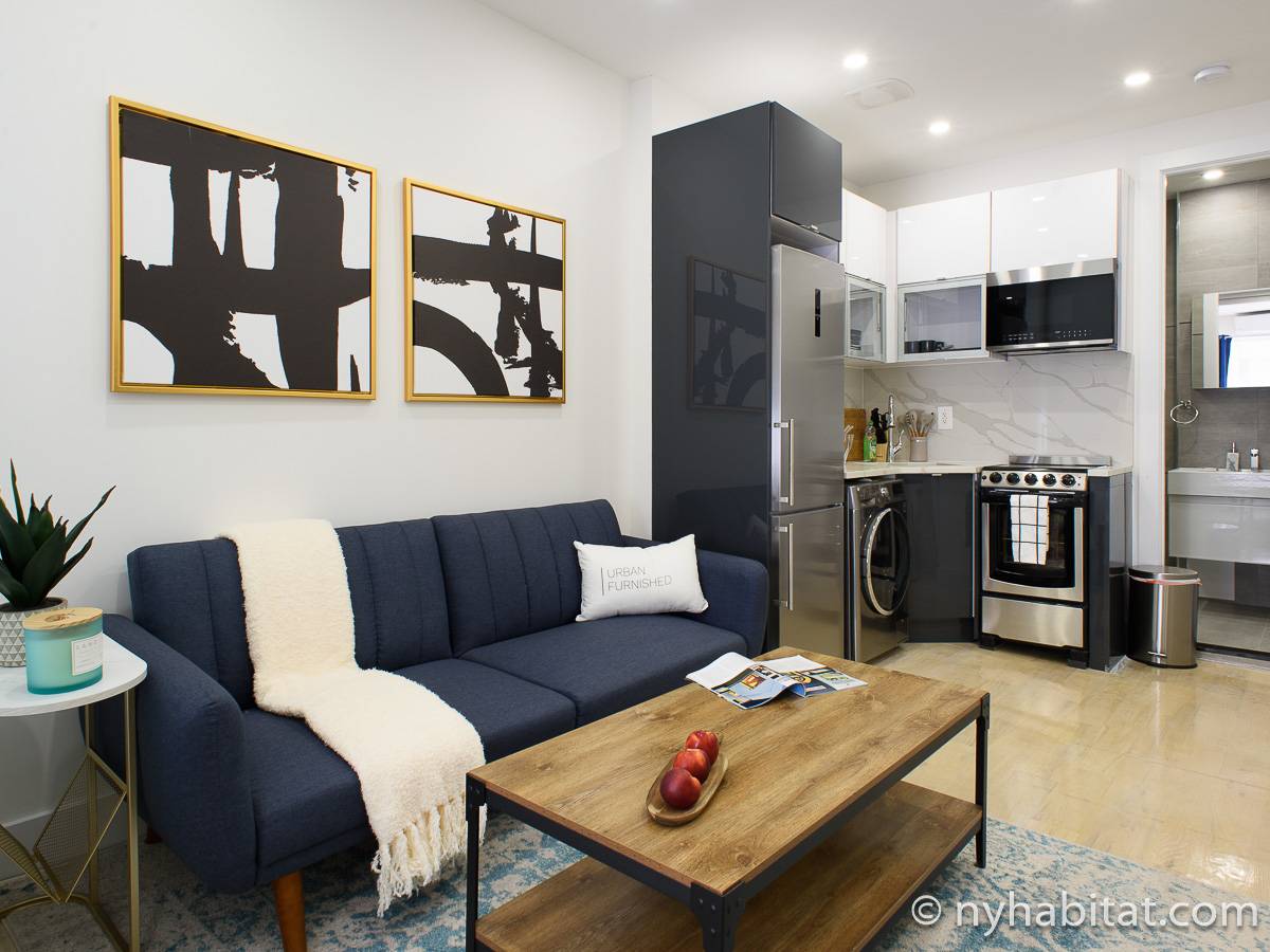 Air conditioning, a sofa, a dining table, a washing machine and a dryer are all included with the rental. Other useful appliances like a coffee maker, refrigerator, stove and microwave are also included. This apartment comes with all the essentials to make your stay in New York go smoothly. The apartment has a unified layout, with frosted glass to separate the bedroom from the open living room and kitchen area. The bedroom has a double-size bed. The bathroom has stone-like tile.