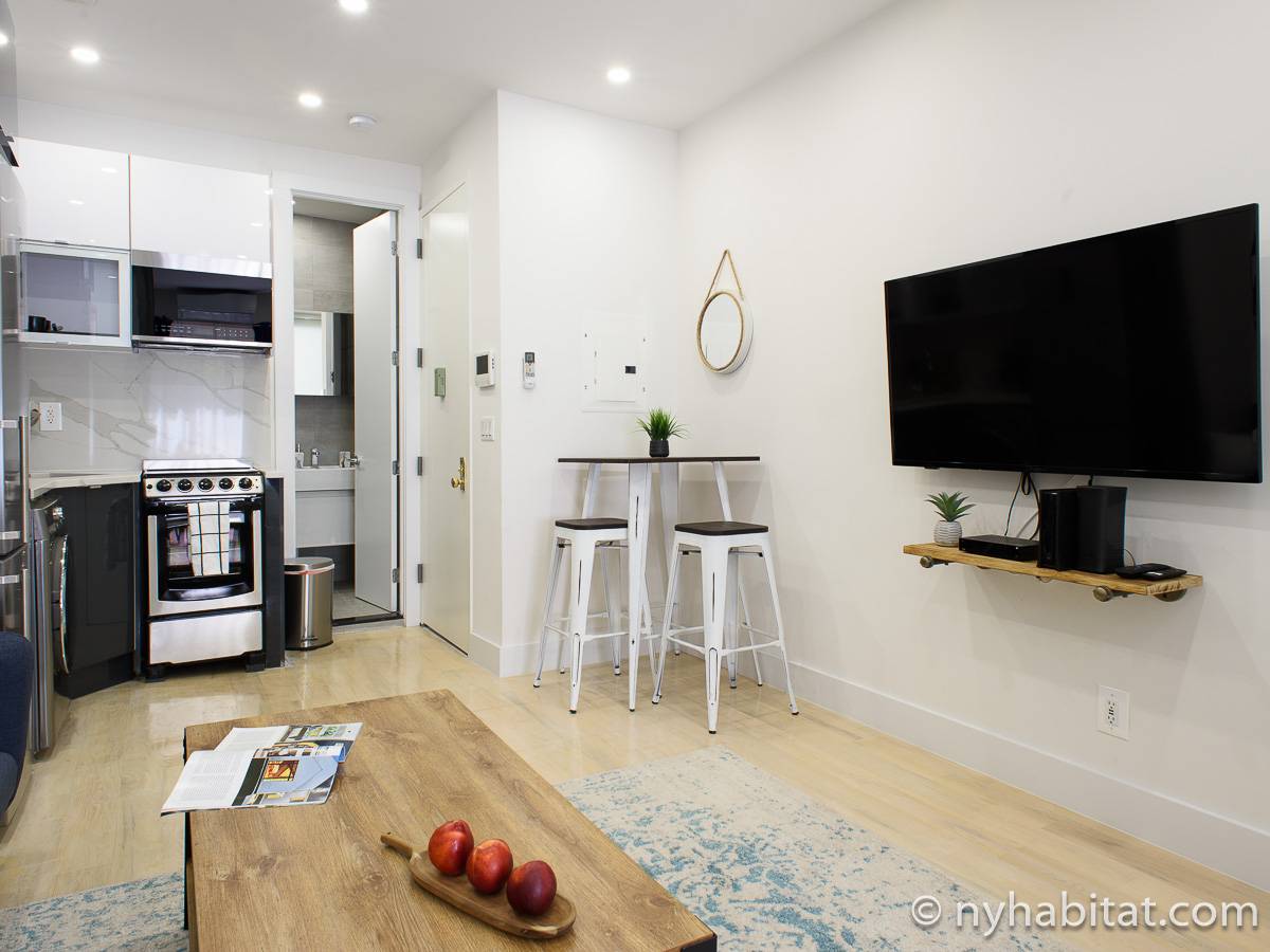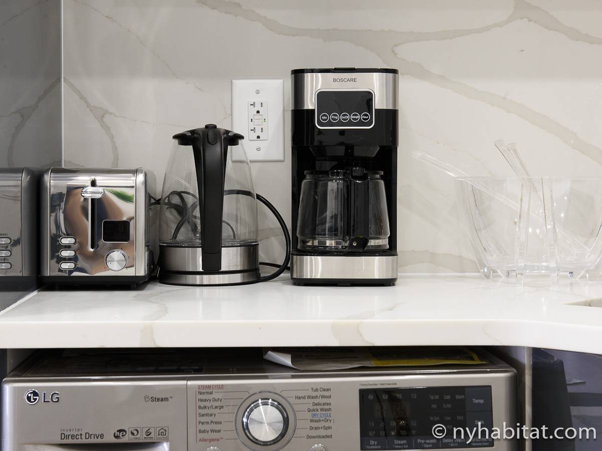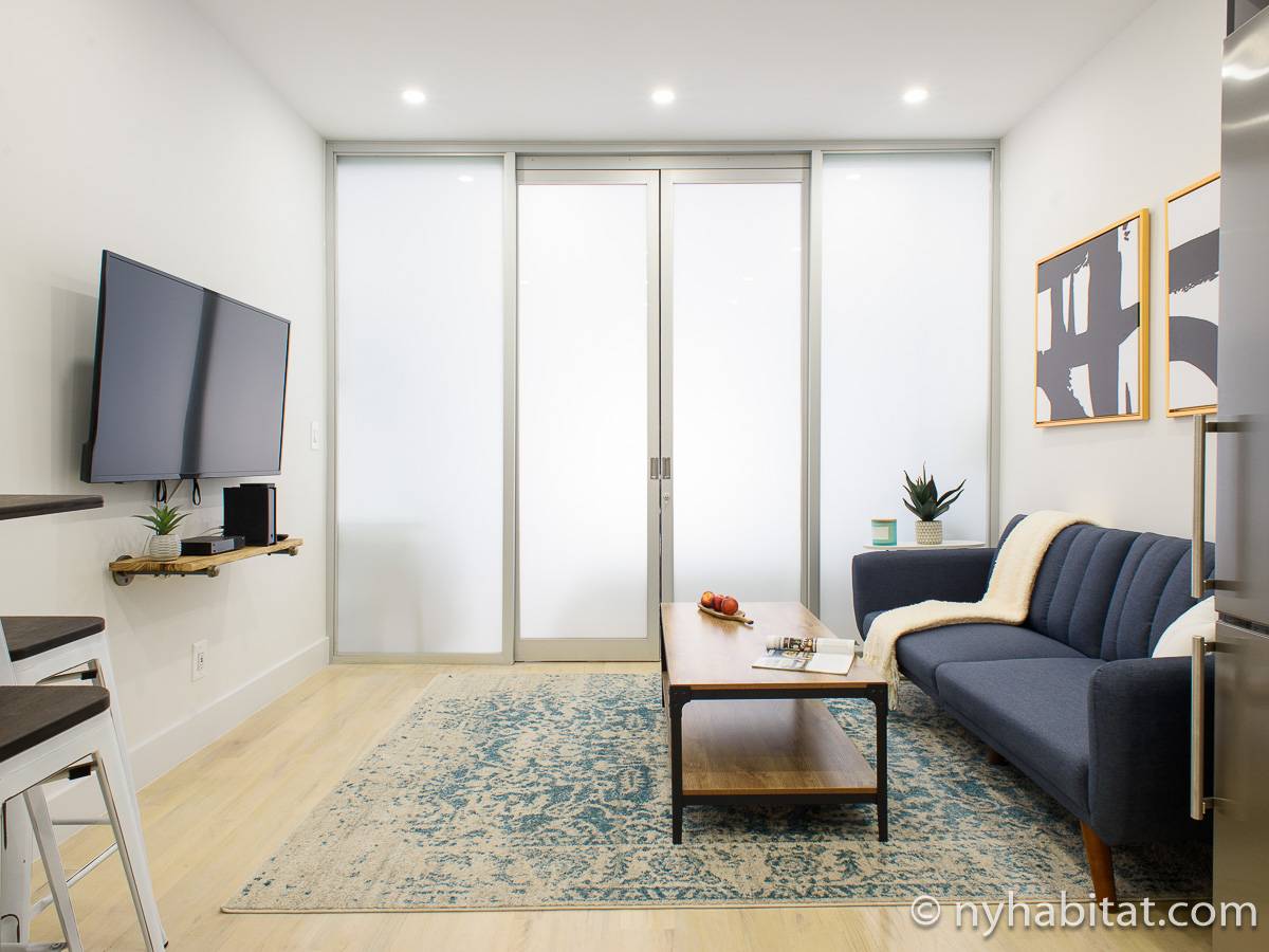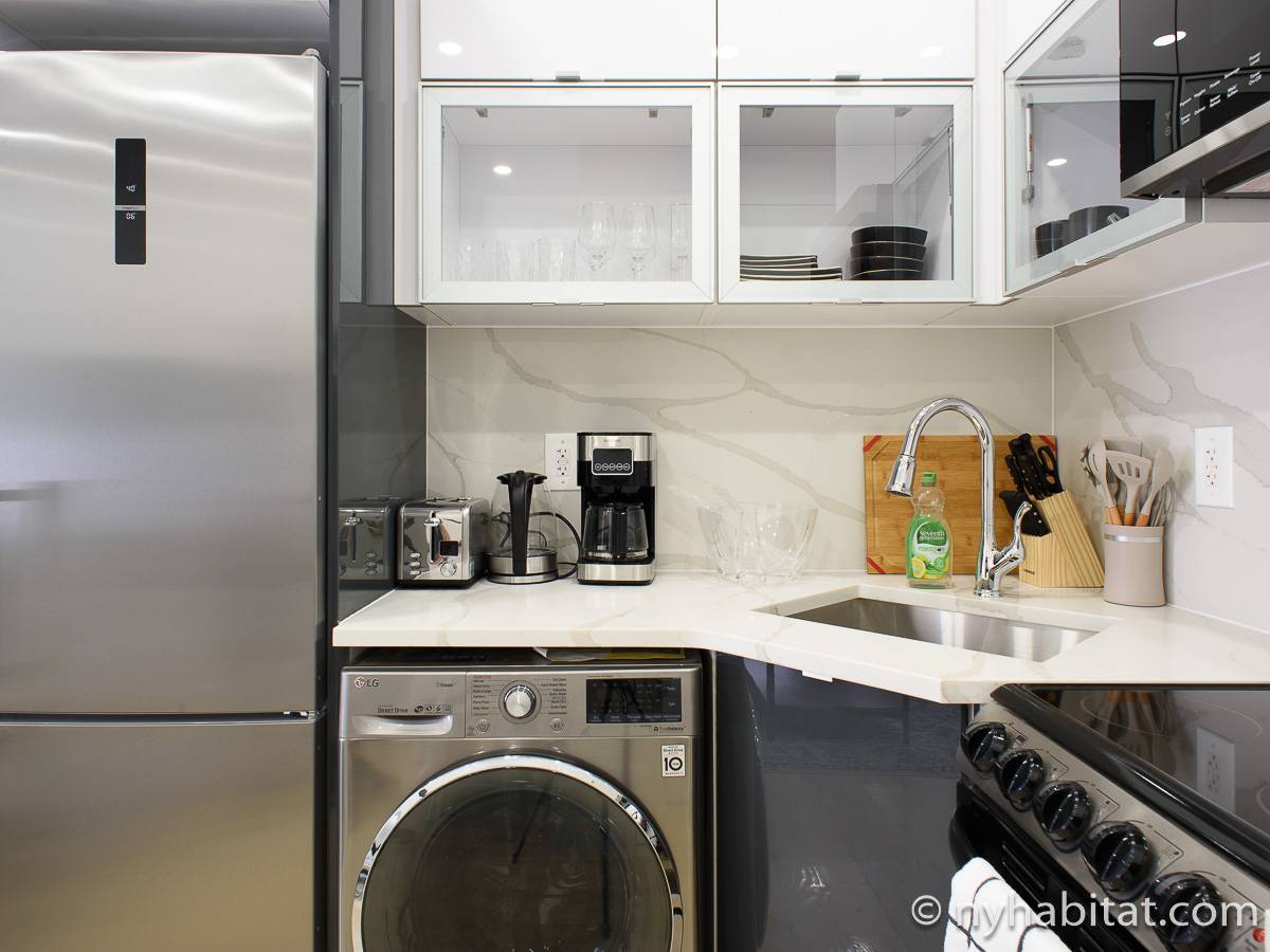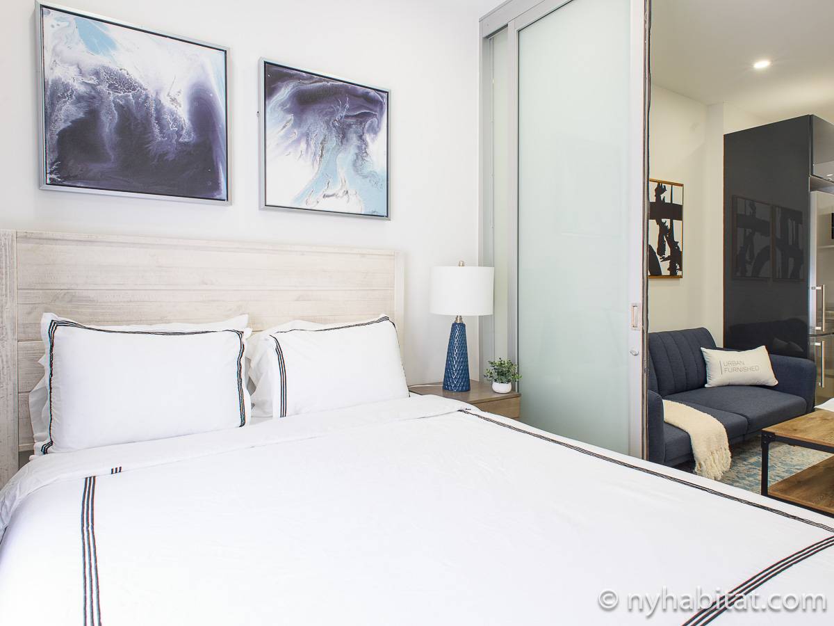 Air conditioning, a sofa, a dining table, a washing machine and a dryer are all included with the rental. Other useful appliances like a coffee maker, refrigerator, stove and microwave are also included. This apartment comes with all the essentials to make your stay in New York go smoothly. The apartment has a unified layout, with frosted glass to separate the bedroom from the open living room and kitchen area. The bedroom has a double-size bed. The bathroom has stone-like tile.