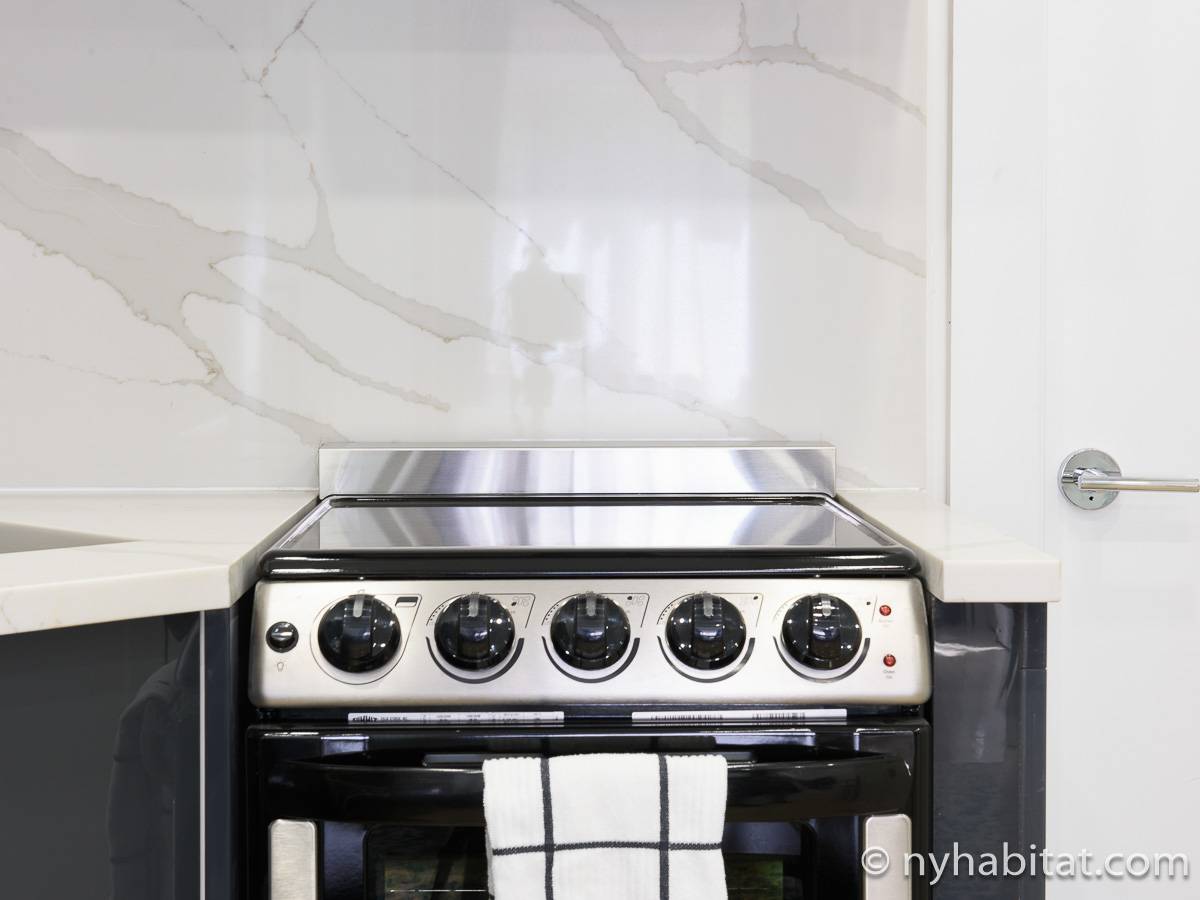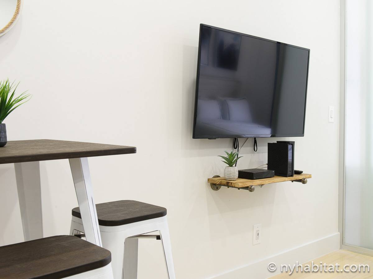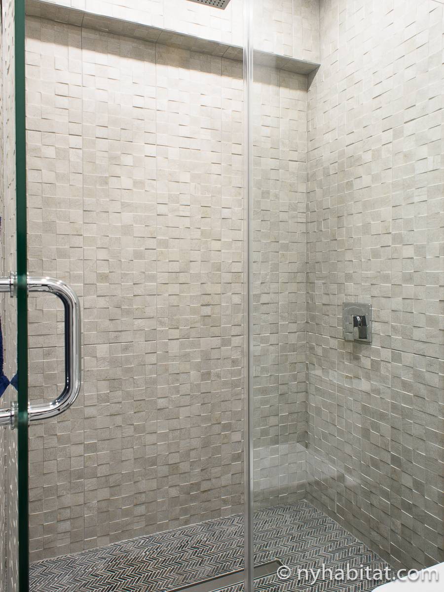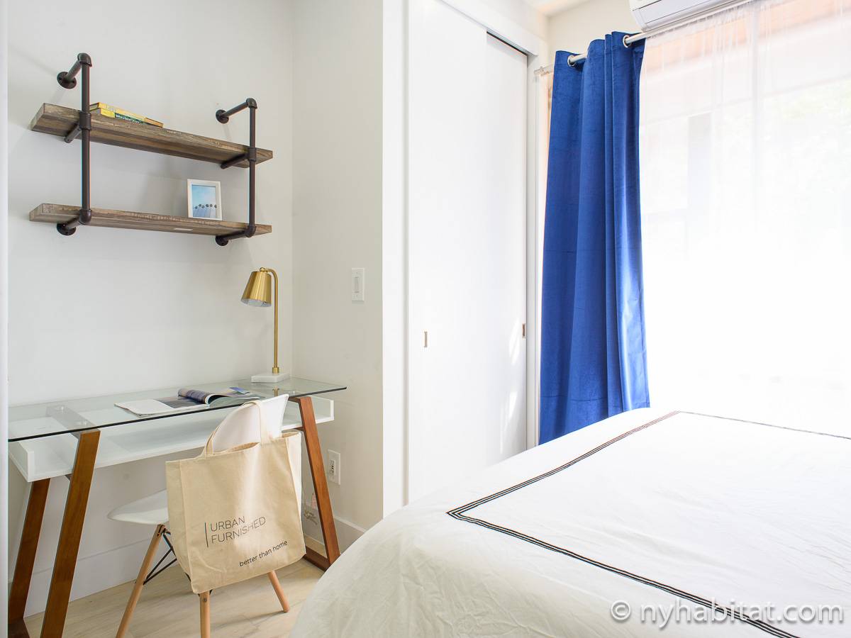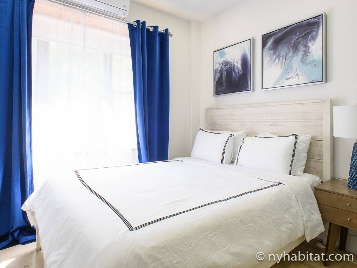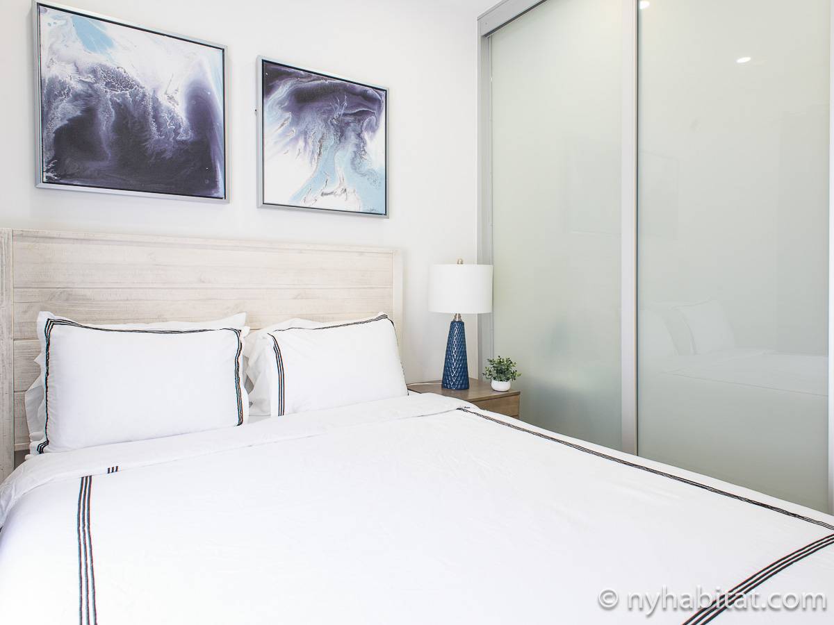 Air conditioning, a sofa, a dining table, a washing machine and a dryer are all included with the rental. Other useful appliances like a coffee maker, refrigerator, stove and microwave are also included. This apartment comes with all the essentials to make your stay in New York go smoothly. The apartment has a unified layout, with frosted glass to separate the bedroom from the open living room and kitchen area. The bedroom has a double-size bed. The bathroom has stone-like tile.