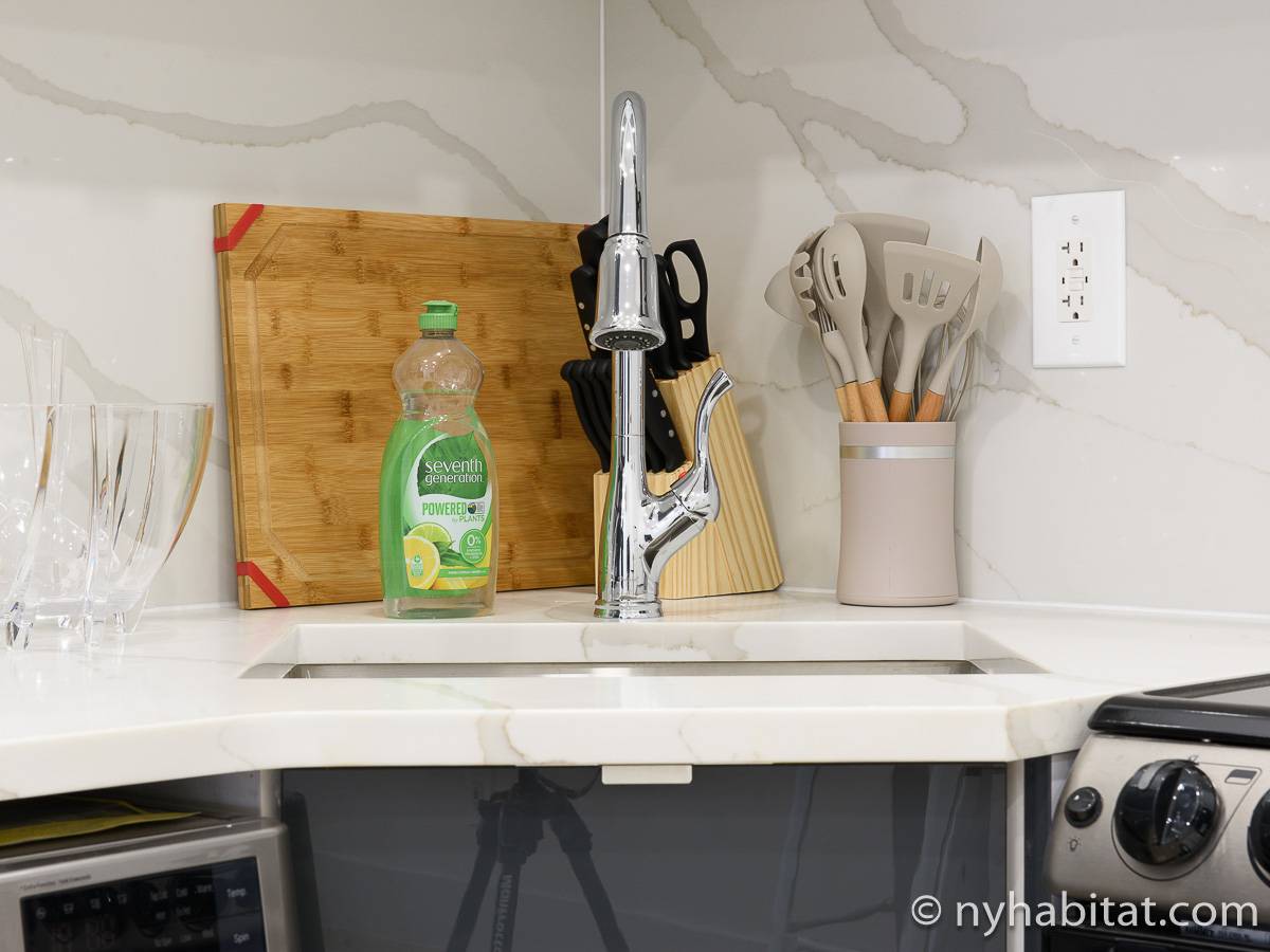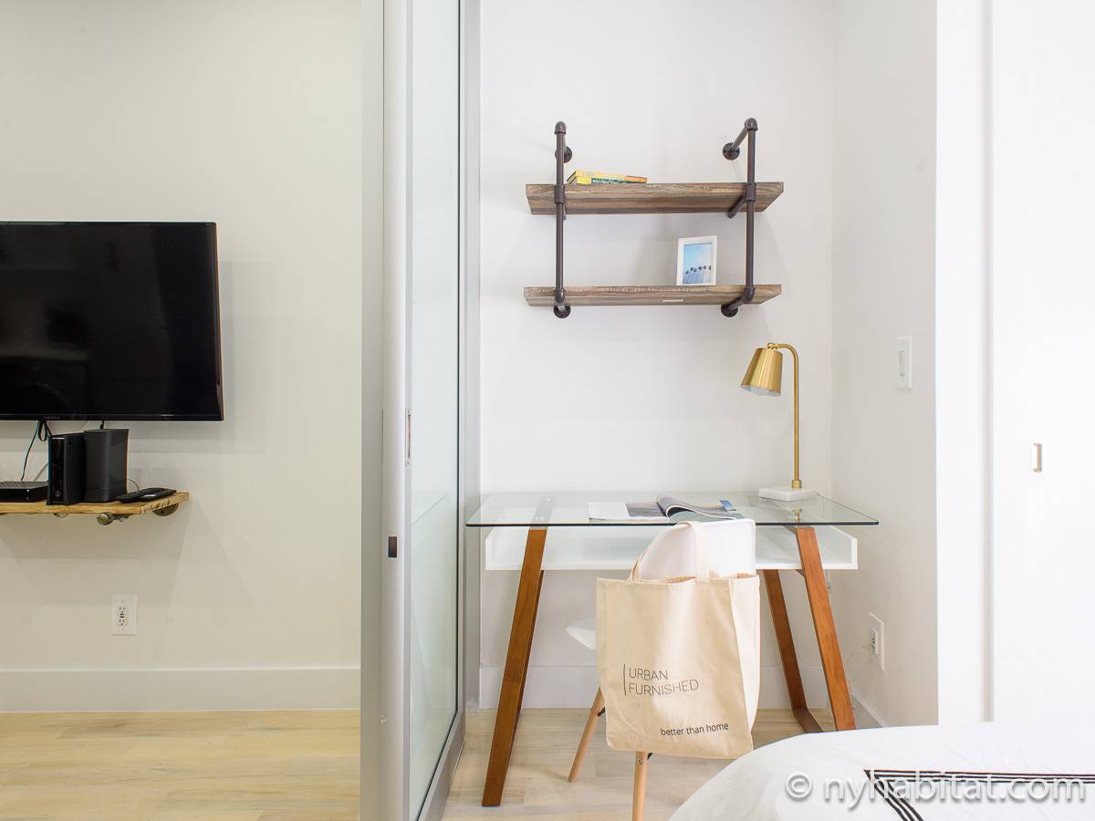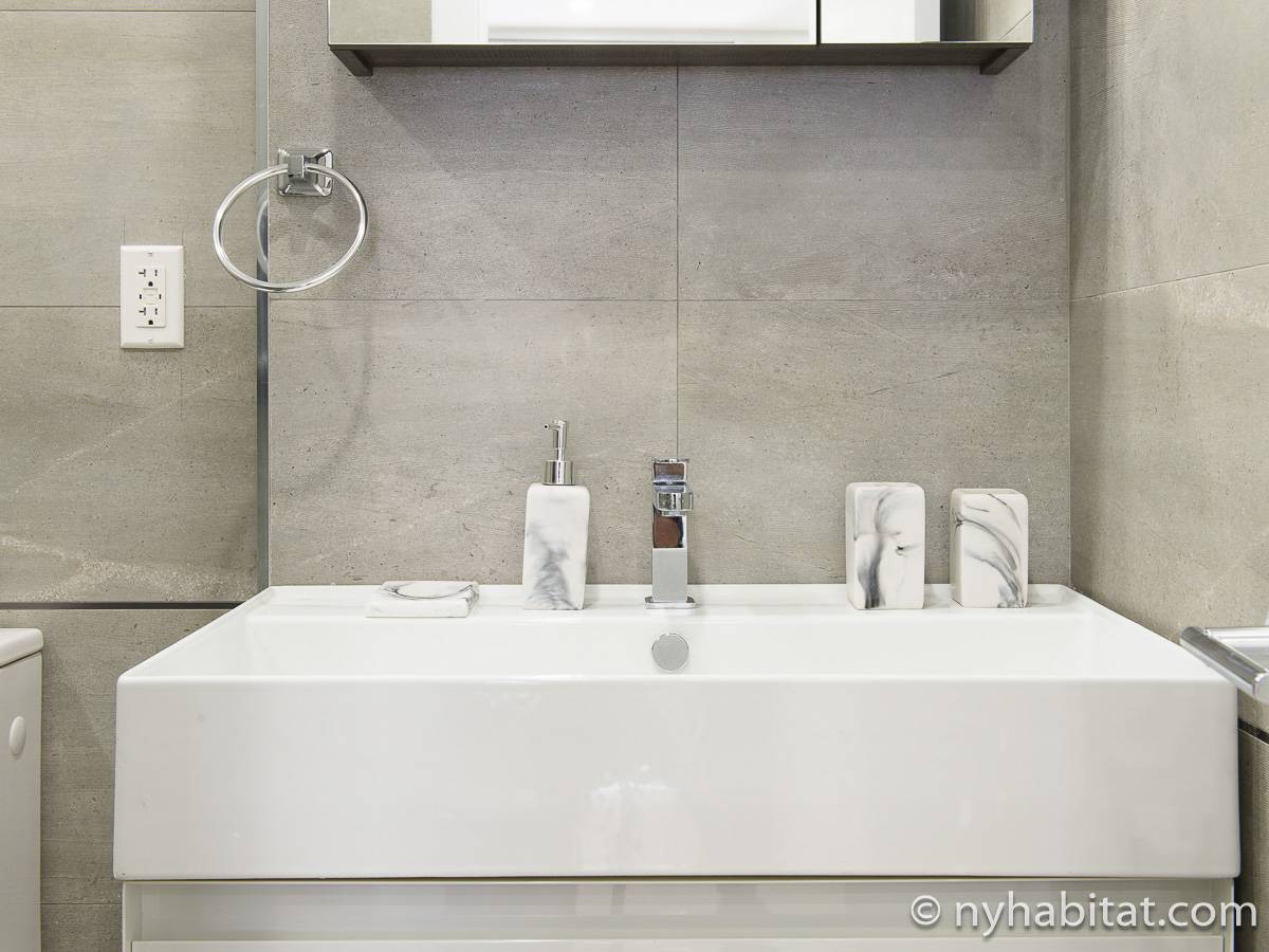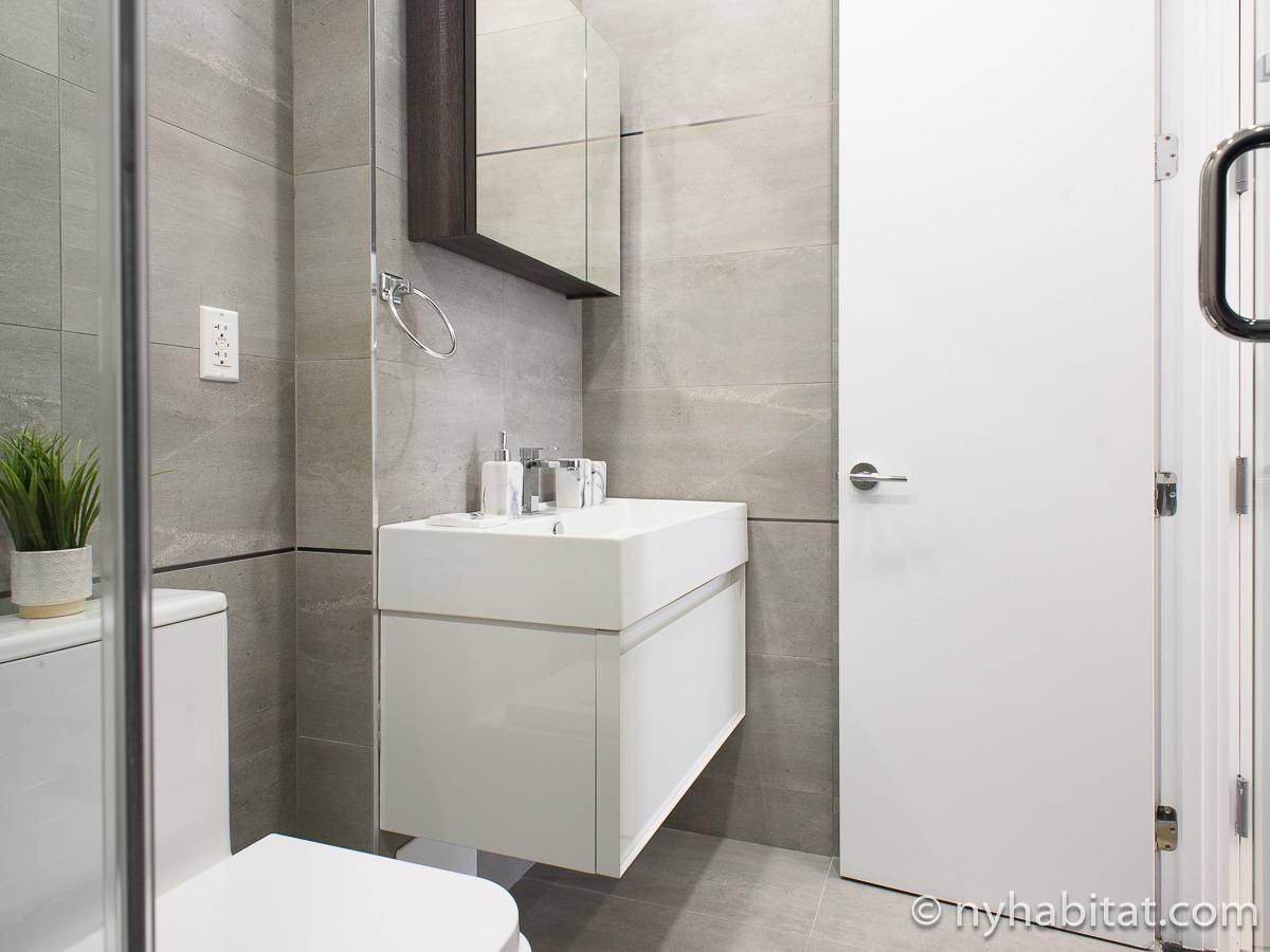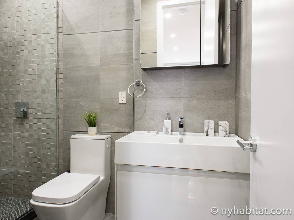 Air conditioning, a sofa, a dining table, a washing machine and a dryer are all included with the rental. Other useful appliances like a coffee maker, refrigerator, stove and microwave are also included. This apartment comes with all the essentials to make your stay in New York go smoothly. The apartment has a unified layout, with frosted glass to separate the bedroom from the open living room and kitchen area. The bedroom has a double-size bed. The bathroom has stone-like tile.