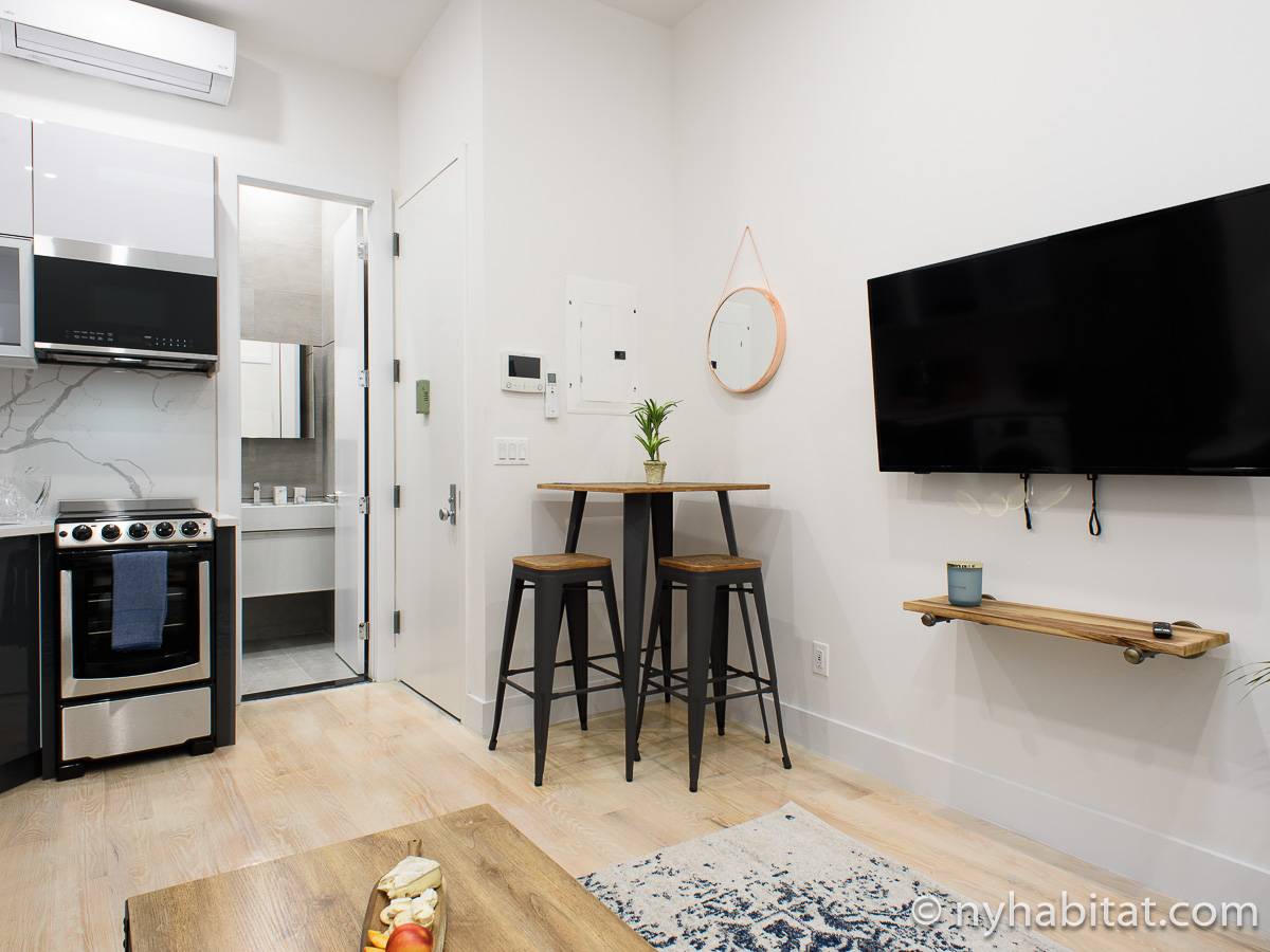 Sand-colored hardwood flooring and an open kitchen lend a breezy aesthetic to this furnished rental. In the living room, recessed lighting compliments the design. And in the bathroom, a rock-like tile pattern functions as a bold accent. The living room houses air conditioning, a TV and a dining table. The kitchen of the apartment features an oven, a fridge, and a microwave. The kitchen also has a washing machine and dryer. The bathroom houses a glass-door shower. The bedroom includes air conditioning, and a double-size bed.