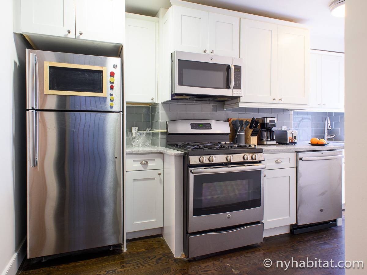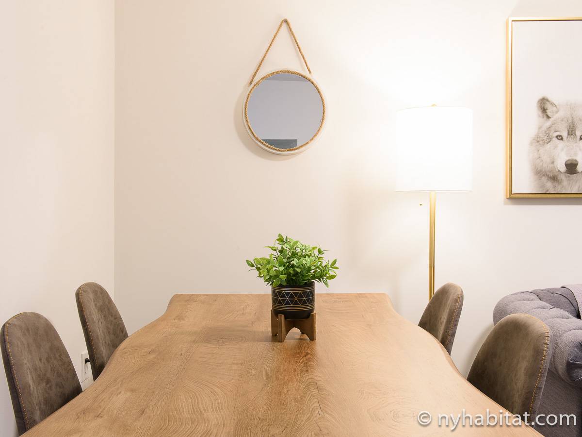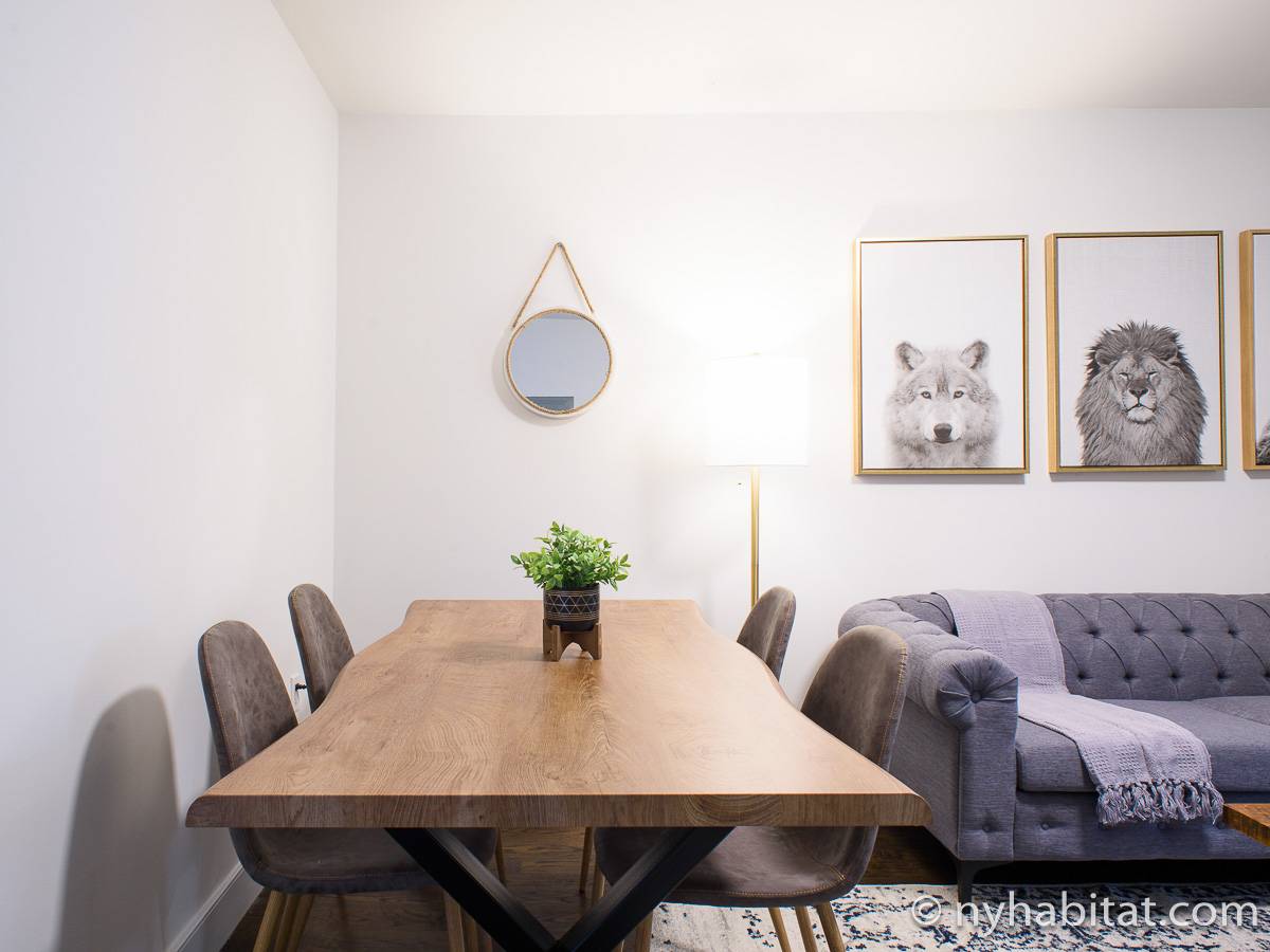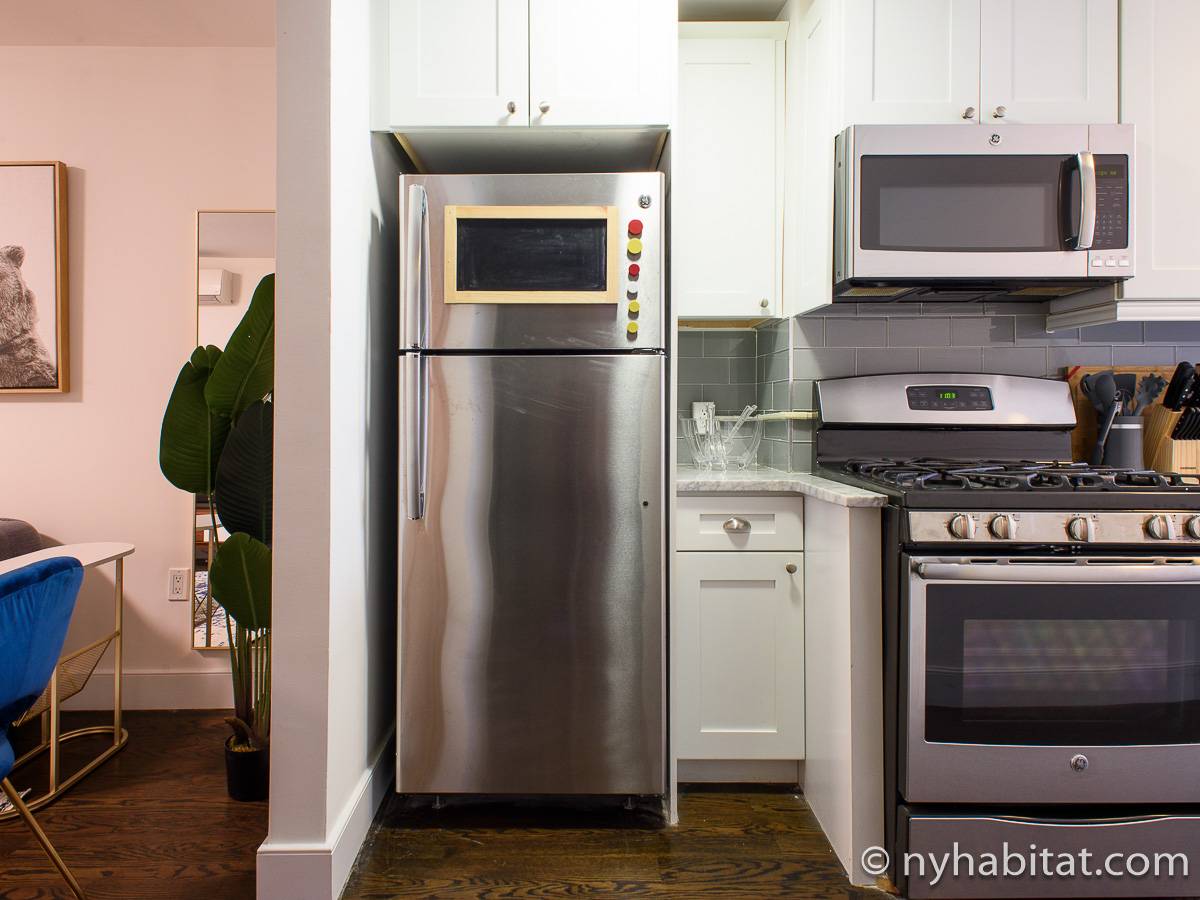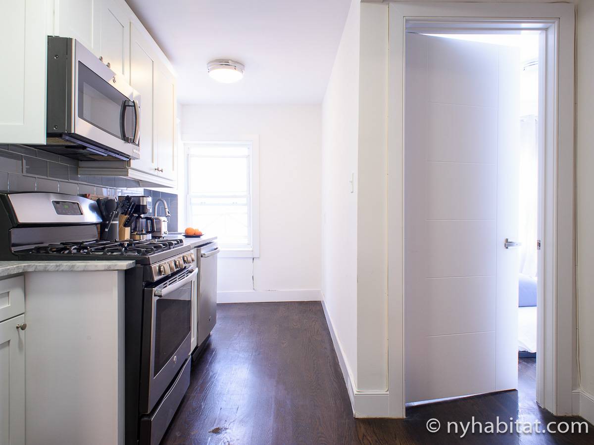 In the neighborhood of Midtown West, also known as Hell’s Kitchen or Clinton, is a 3-bedroom 1-bathroom furnished apartment for rent. This Manhattan apartment is located near the corner of 9th Avenue and West 39th Street. At 1,100 square feet (around 102 m2), this apartment is in a no-elevator New York building.