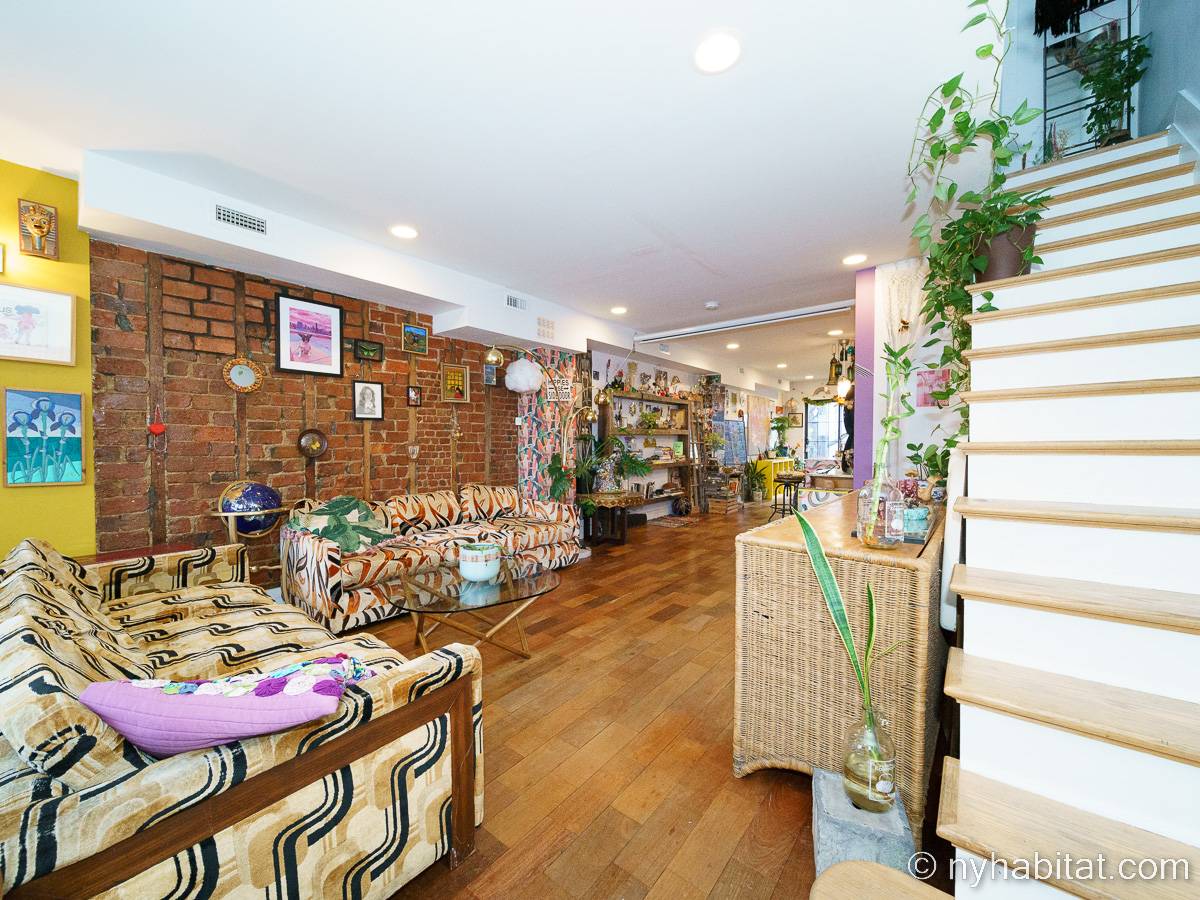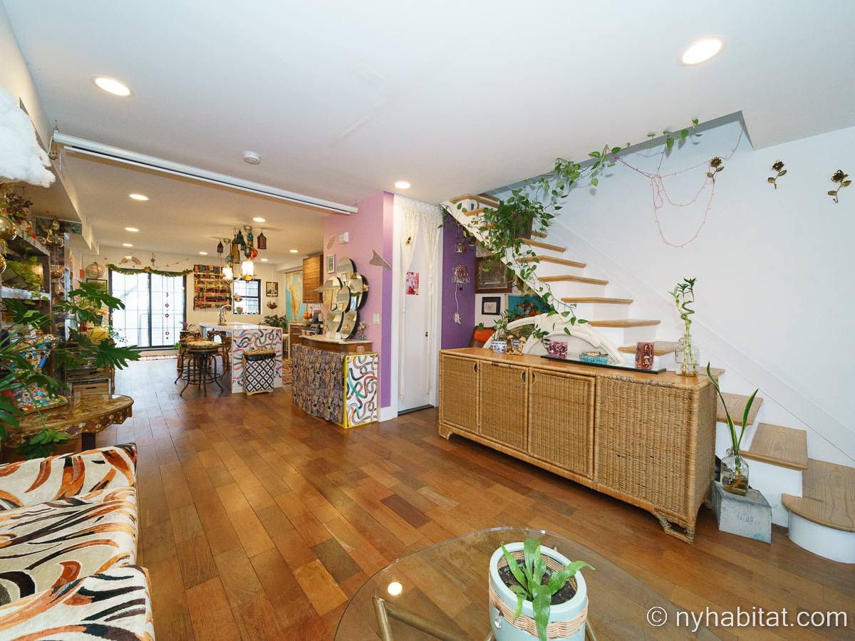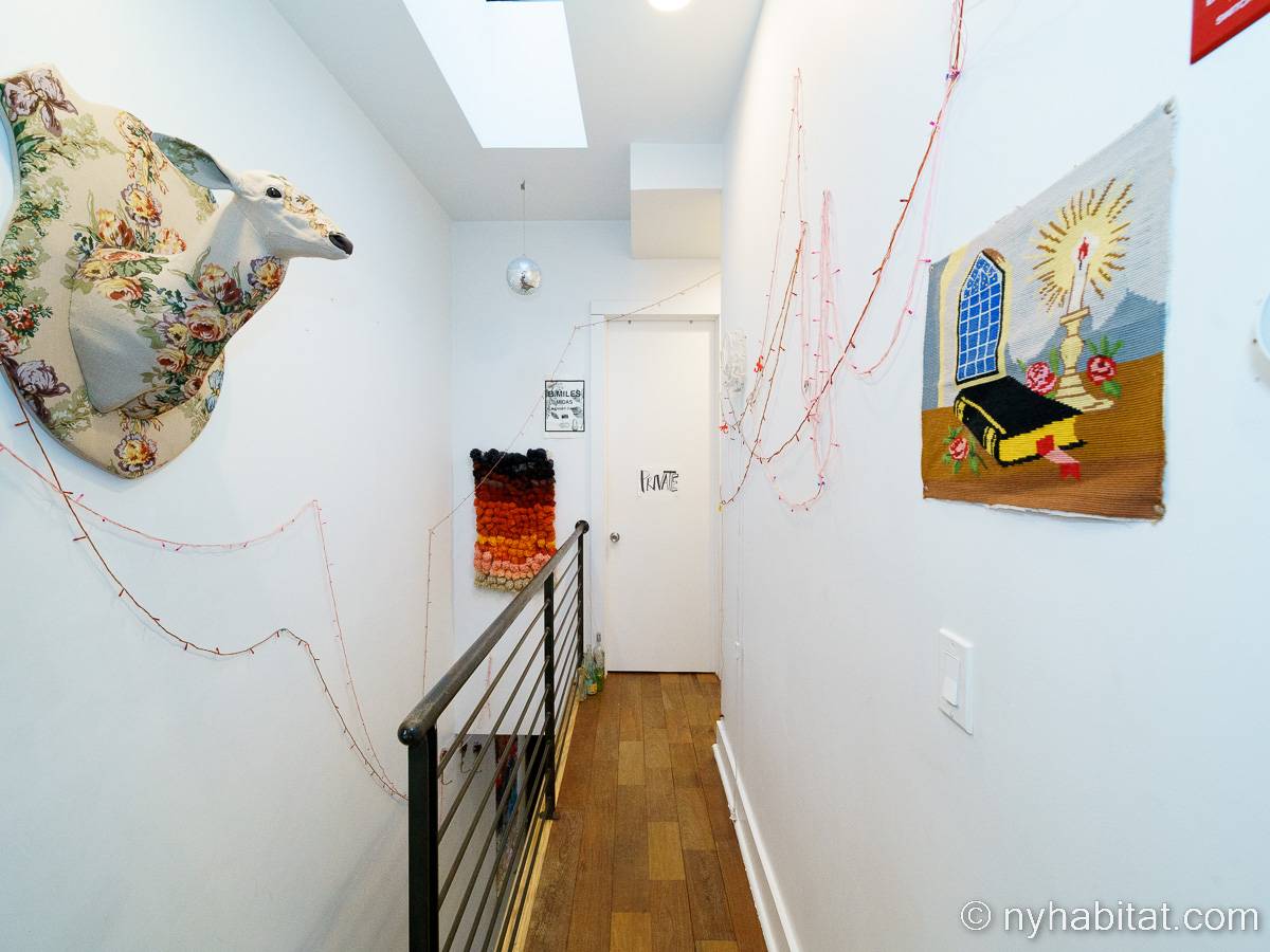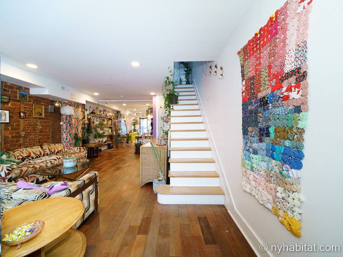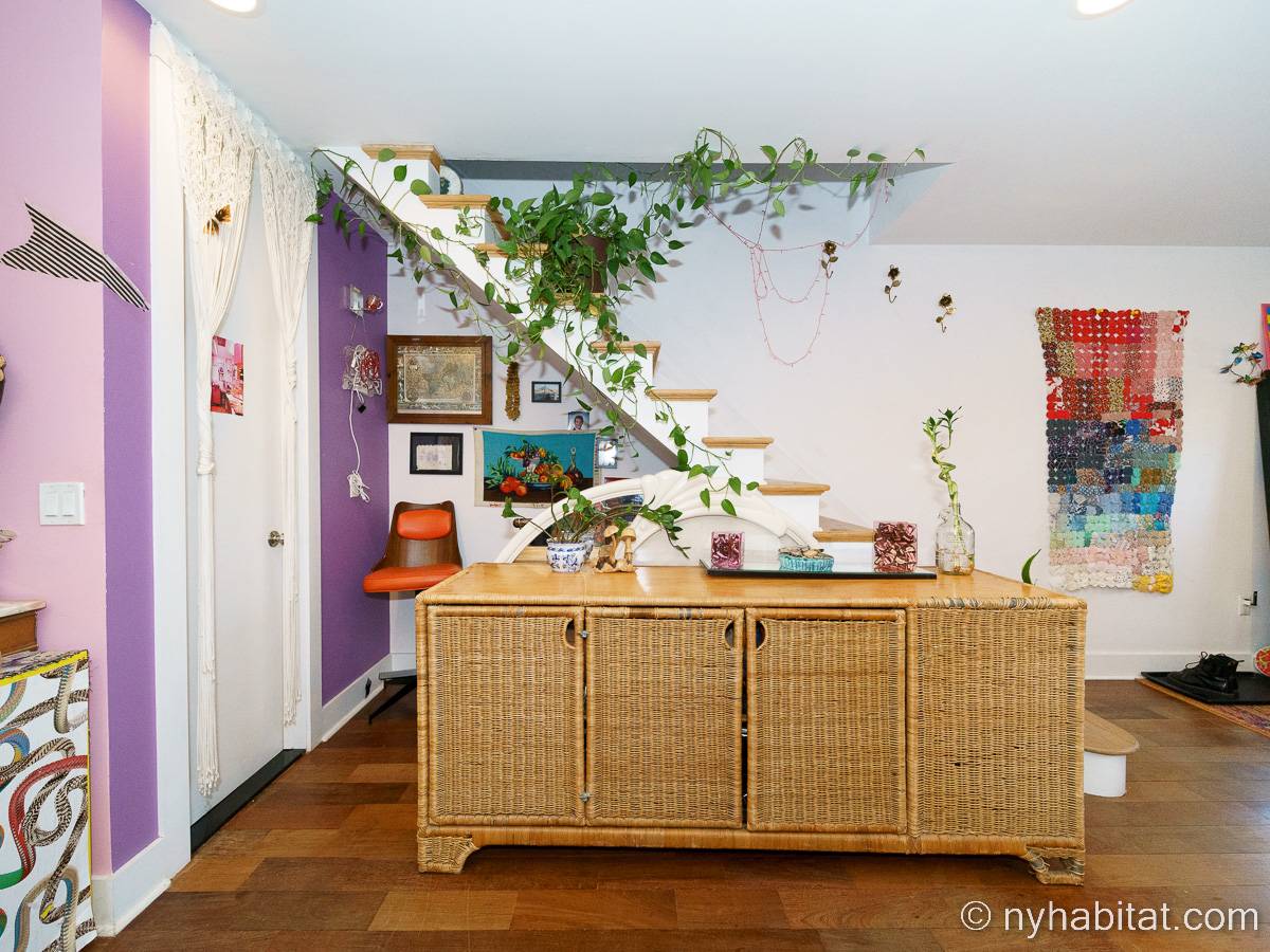 This rental is a furnished duplex apartment near Bushwick Avenue and Chauncey Street in Brooklyn, New York. It has two bedrooms, two bathrooms and an additional separate toilet. It is on the second and third floor (equivalent to the first and second floor in Europe) of a three-floor townhouse in Ocean Hill Brownsville.
