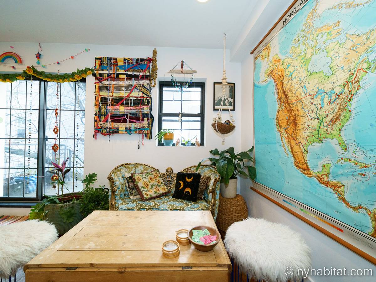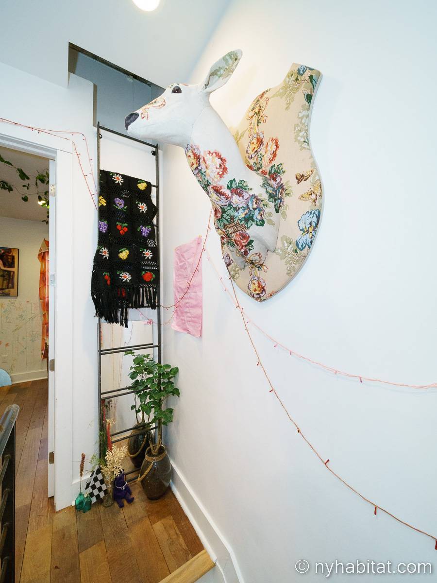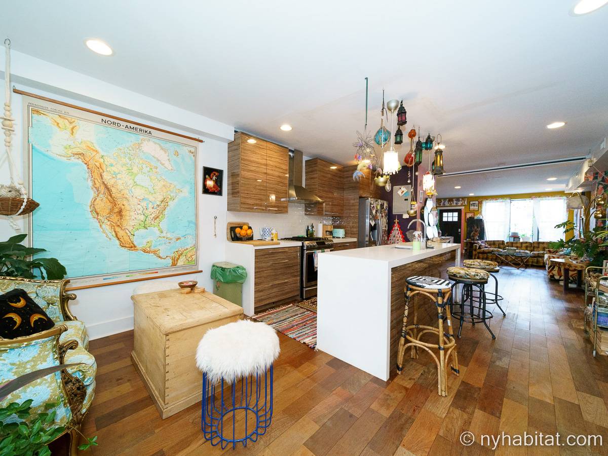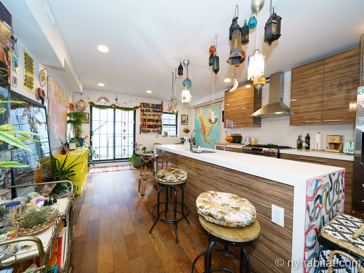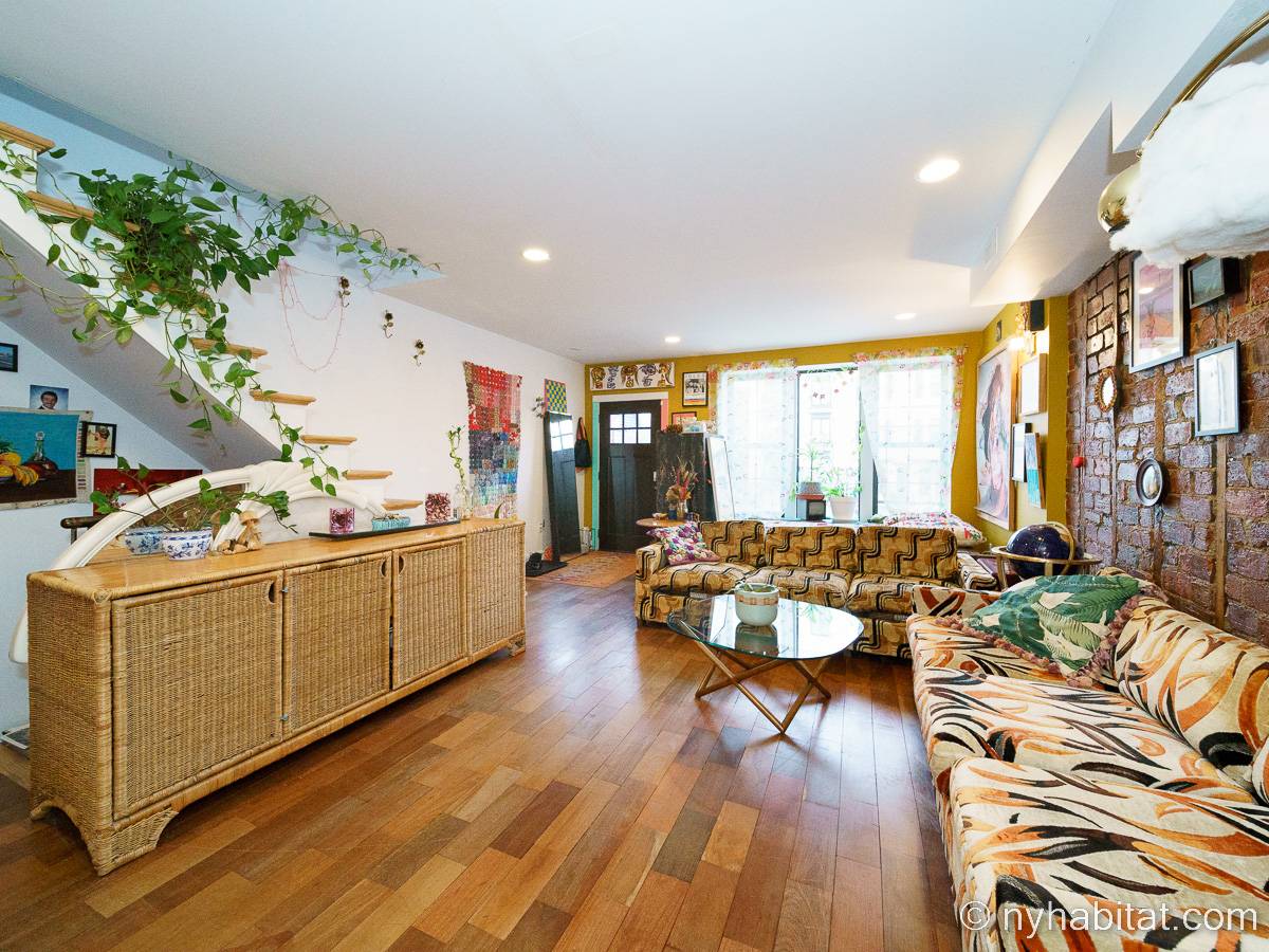 This rental is a furnished duplex apartment near Bushwick Avenue and Chauncey Street in Brooklyn, New York. It has two bedrooms, two bathrooms and an additional separate toilet. It is on the second and third floor (equivalent to the first and second floor in Europe) of a three-floor townhouse in Ocean Hill Brownsville.