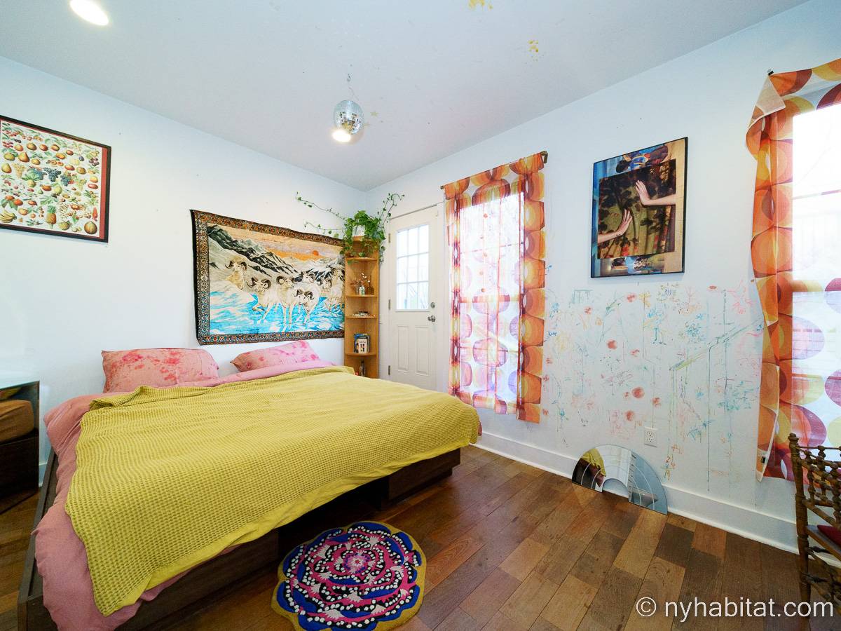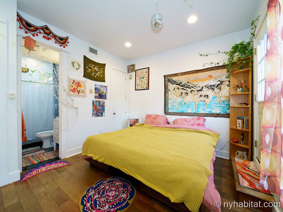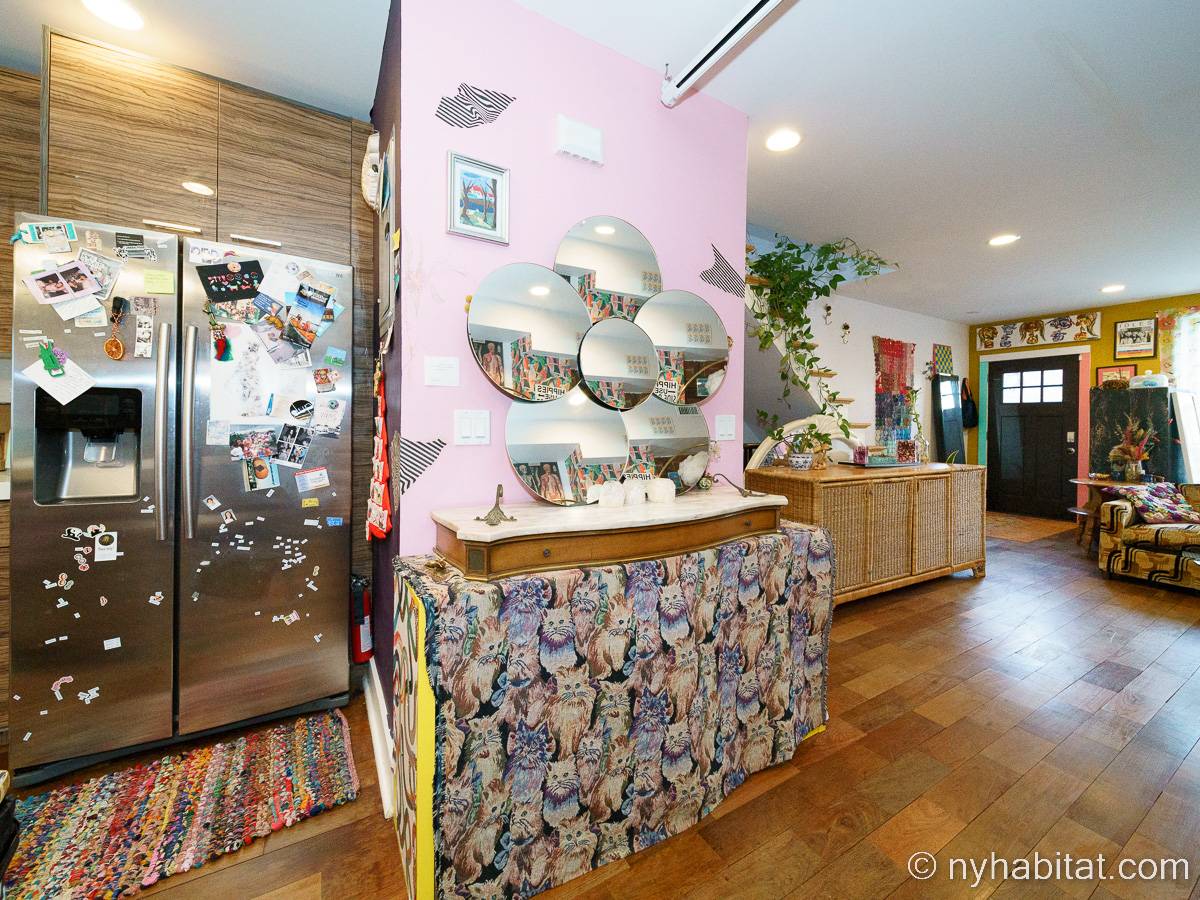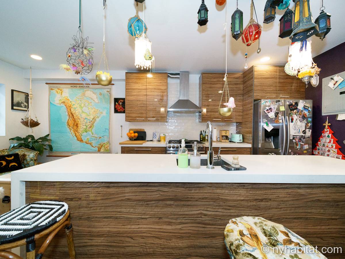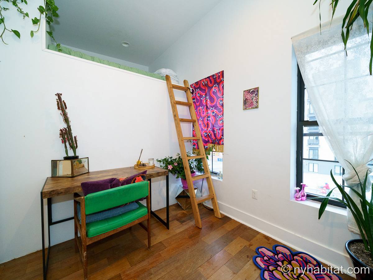 This rental is a furnished duplex apartment near Bushwick Avenue and Chauncey Street in Brooklyn, New York. It has two bedrooms, two bathrooms and an additional separate toilet. It is on the second and third floor (equivalent to the first and second floor in Europe) of a three-floor townhouse in Ocean Hill Brownsville.