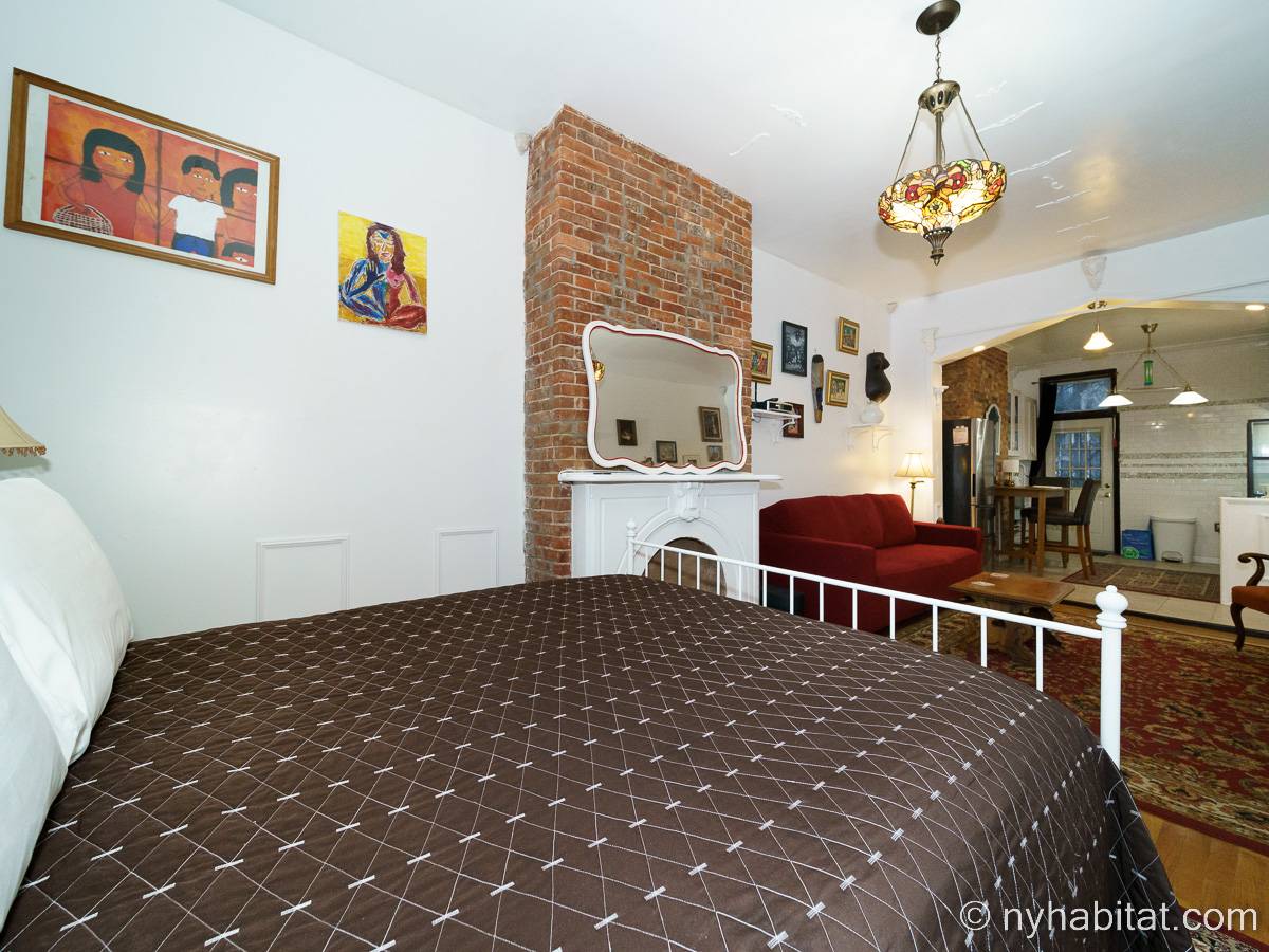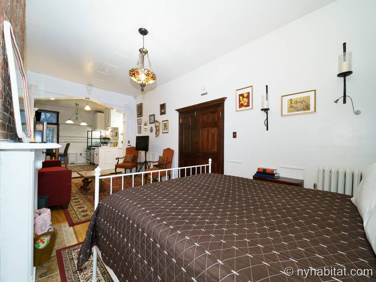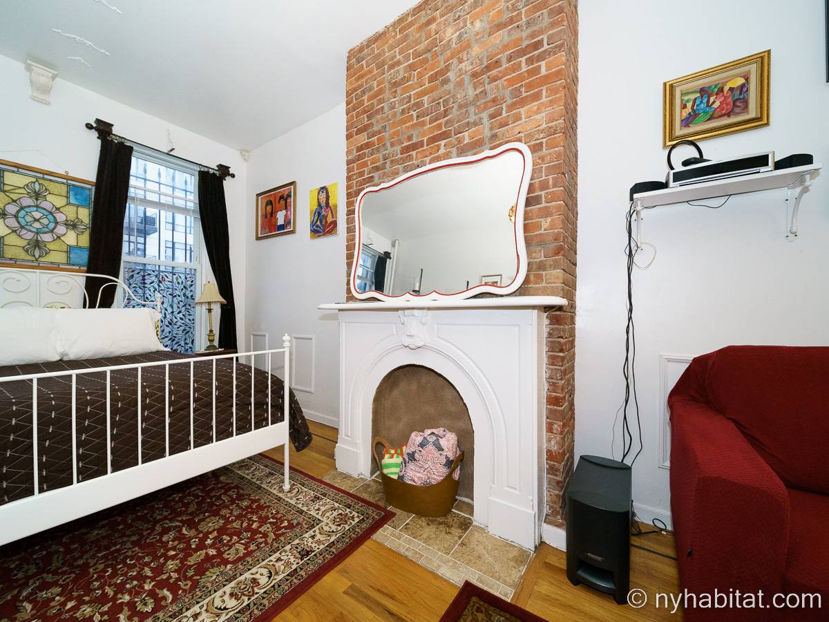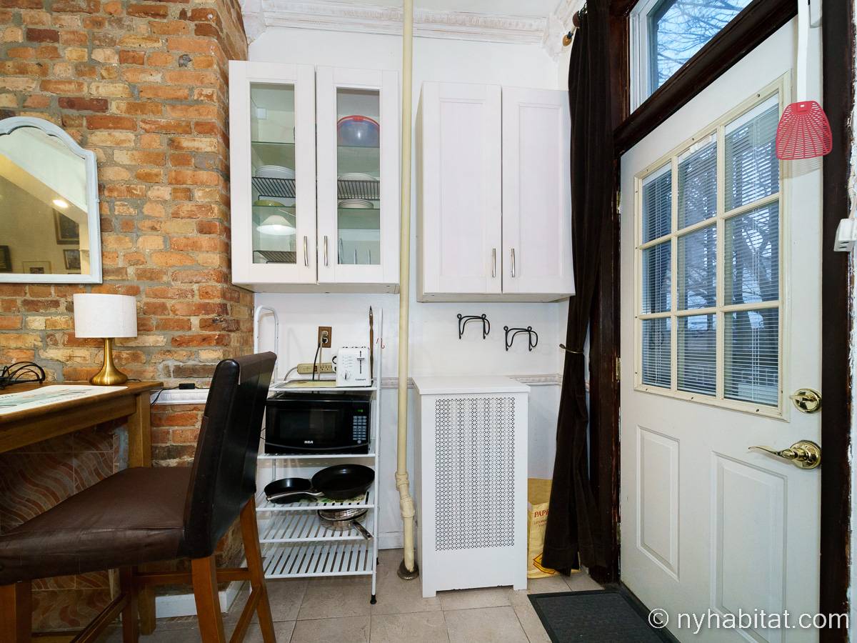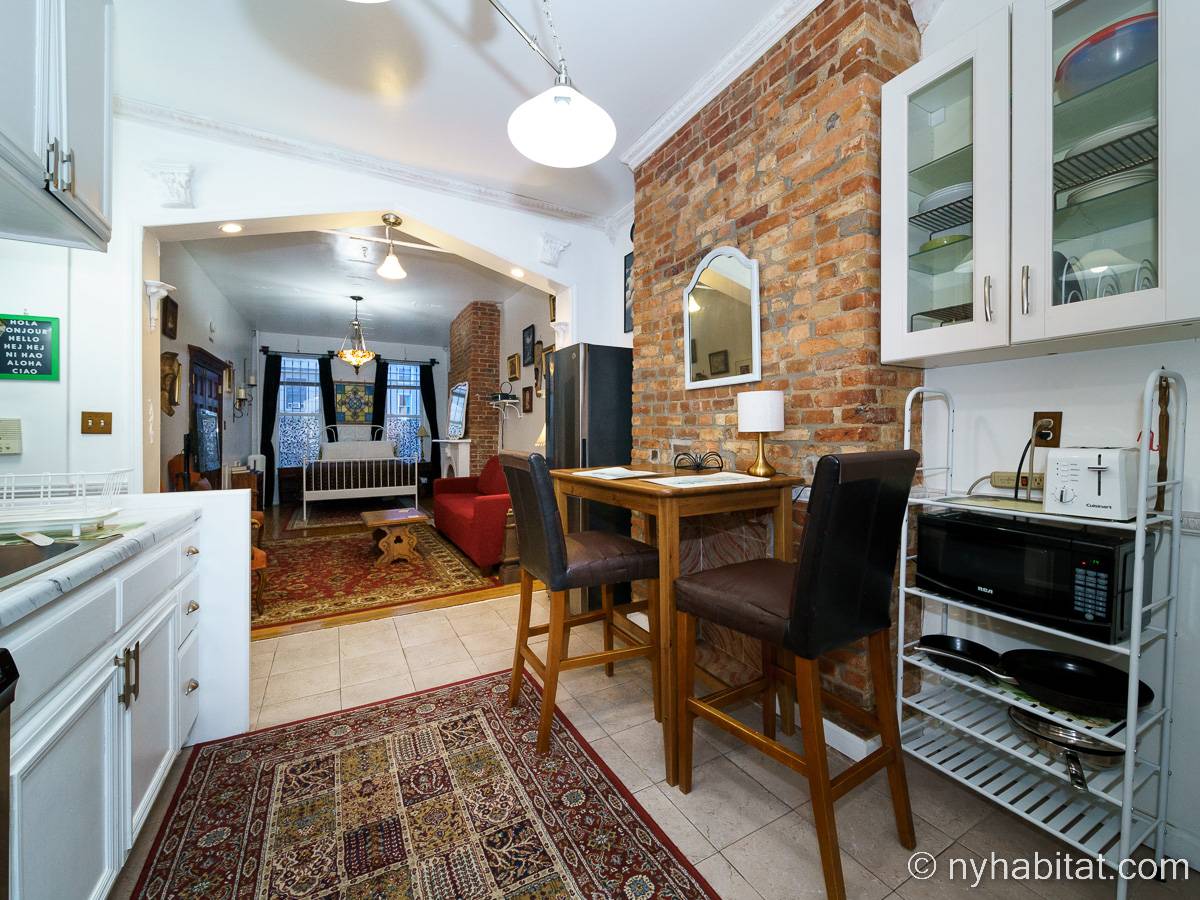 Between Lafayette Avenue and Nostrand Avenue is this furnished studio rental in Clinton Hill, Brooklyn, New York. The apartment sits on the second floor (equivalent to the first floor in Europe). Please note there is no elevator.