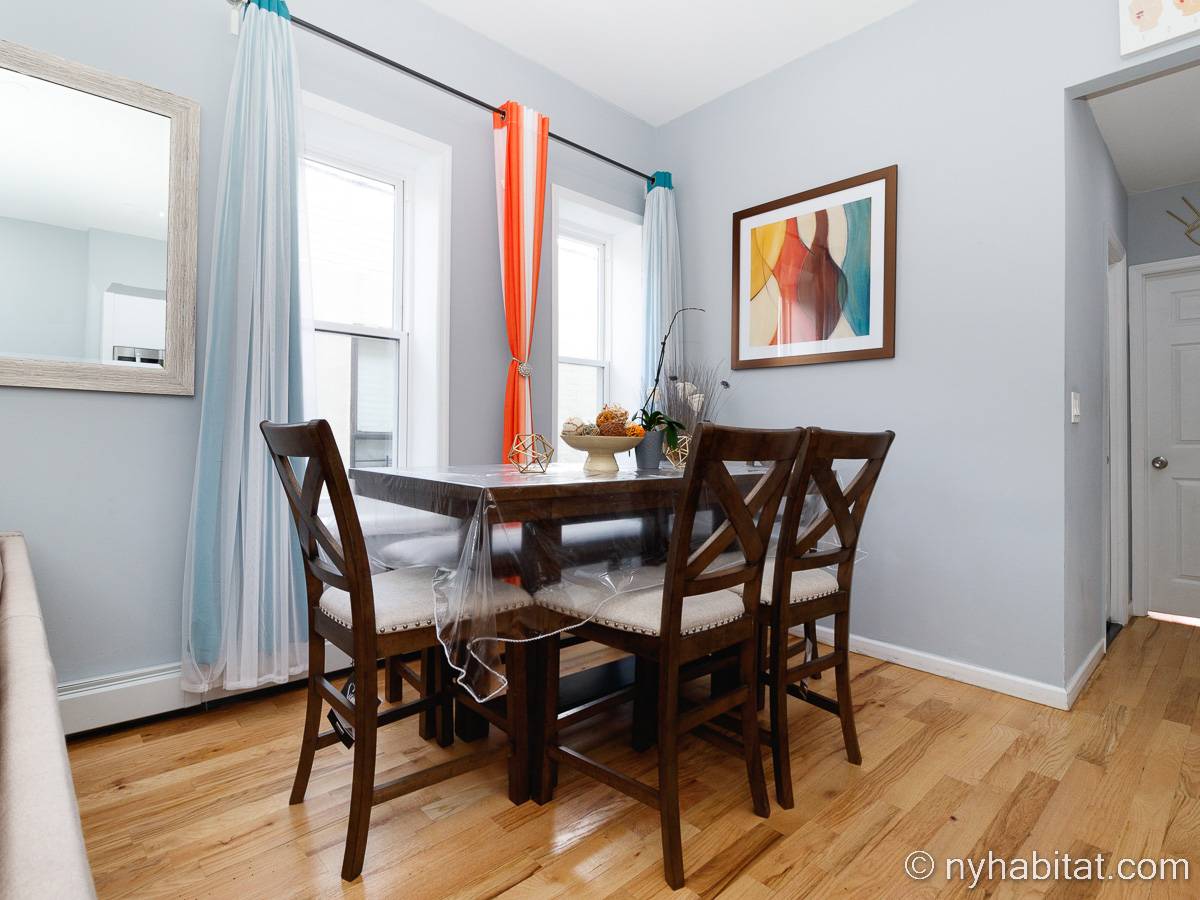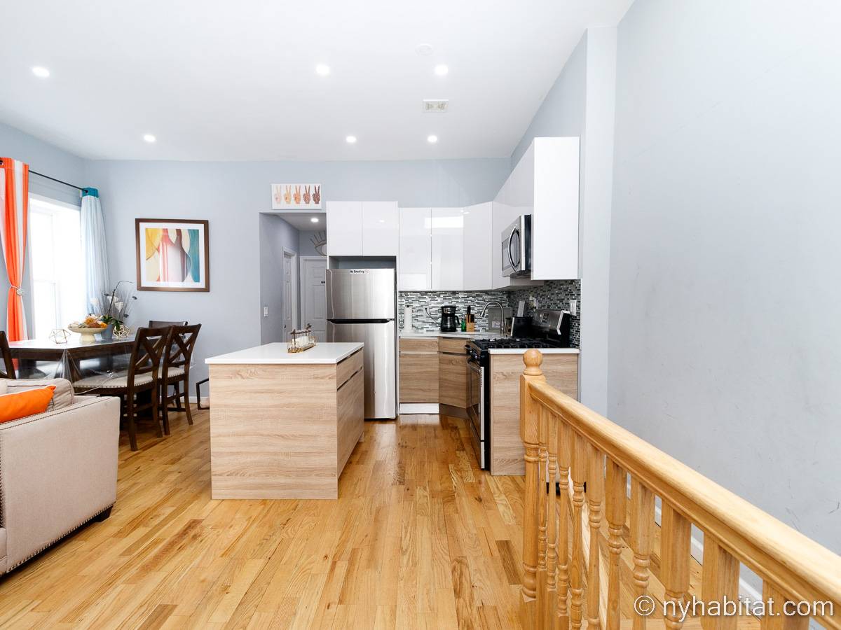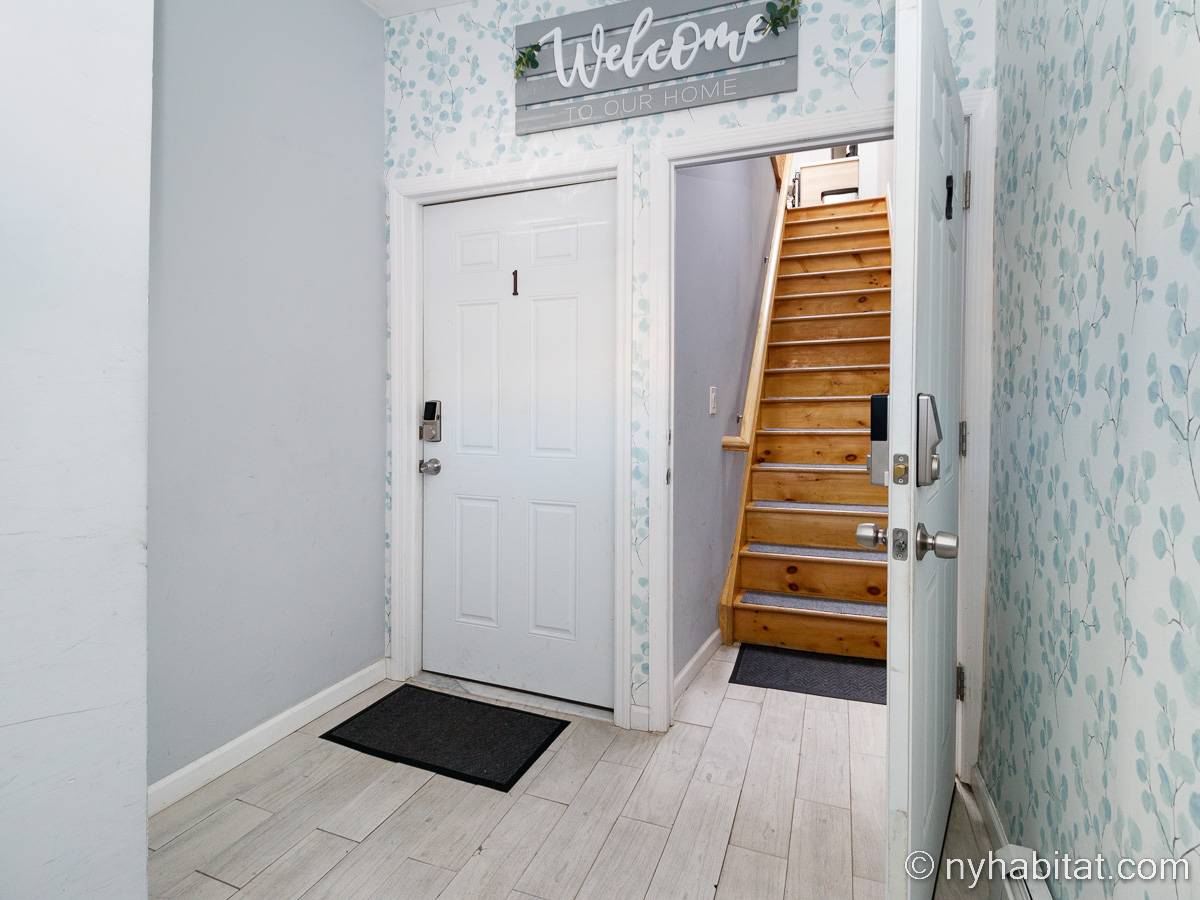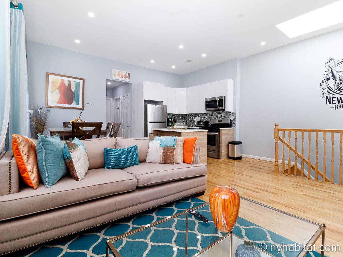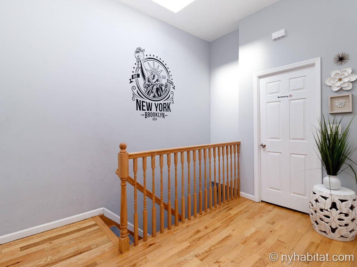 This is a furnished apartment on the second floor (equivalent to the first floor in Europe) of a townhouse in Brooklyn, New York. It consists of four bedrooms and two bathrooms. It is a 900-square-foot space (around 84 m2) near Newport Street and Van Sinderen Avenue.