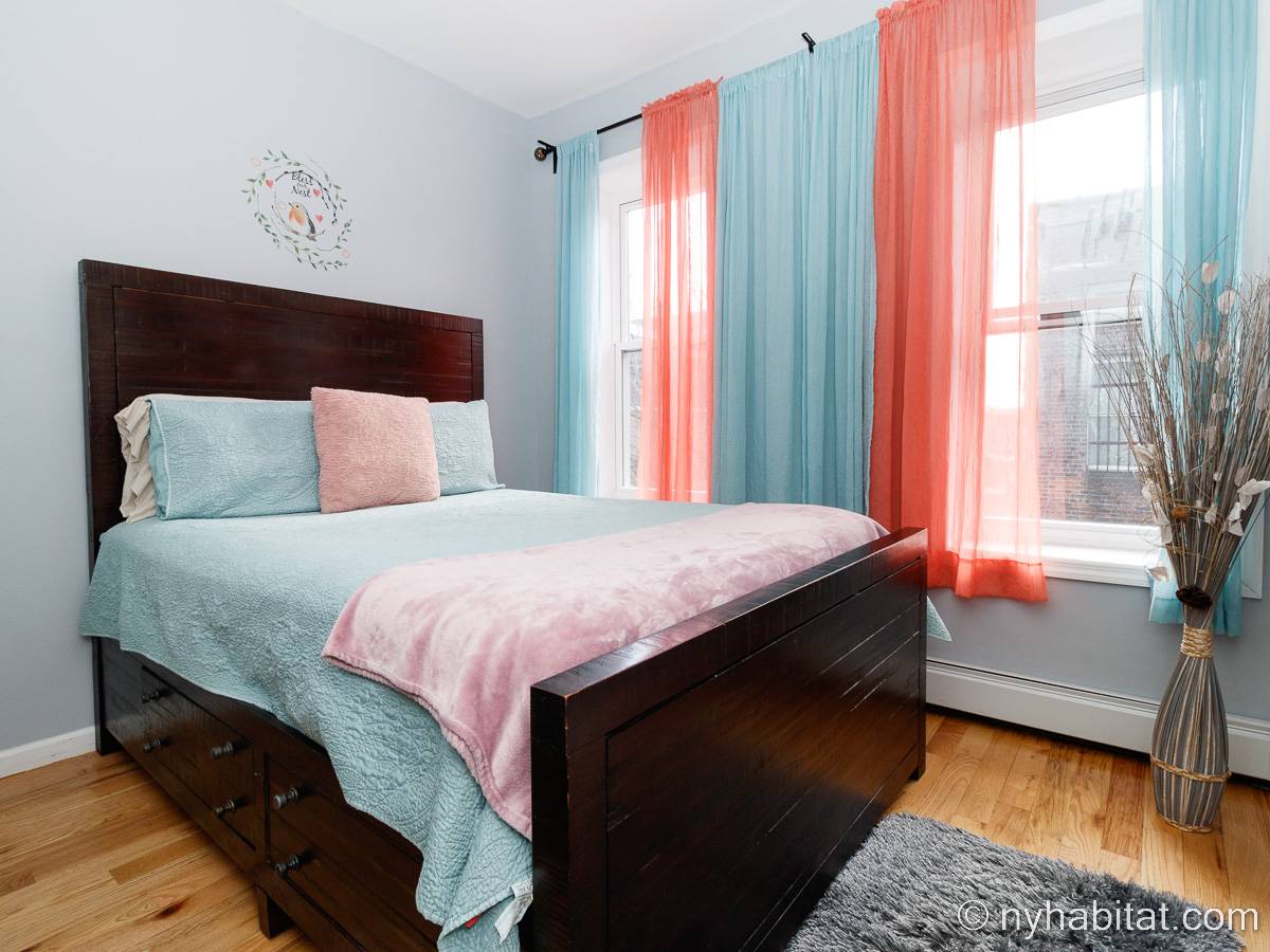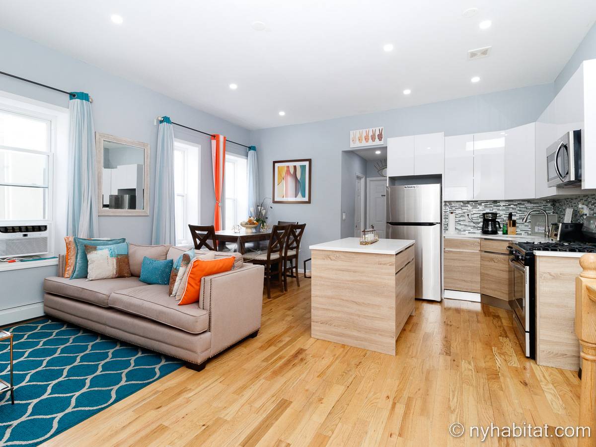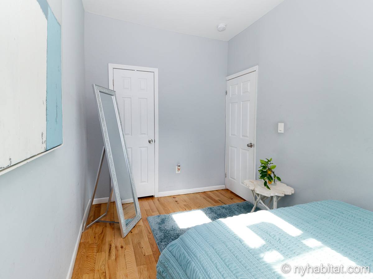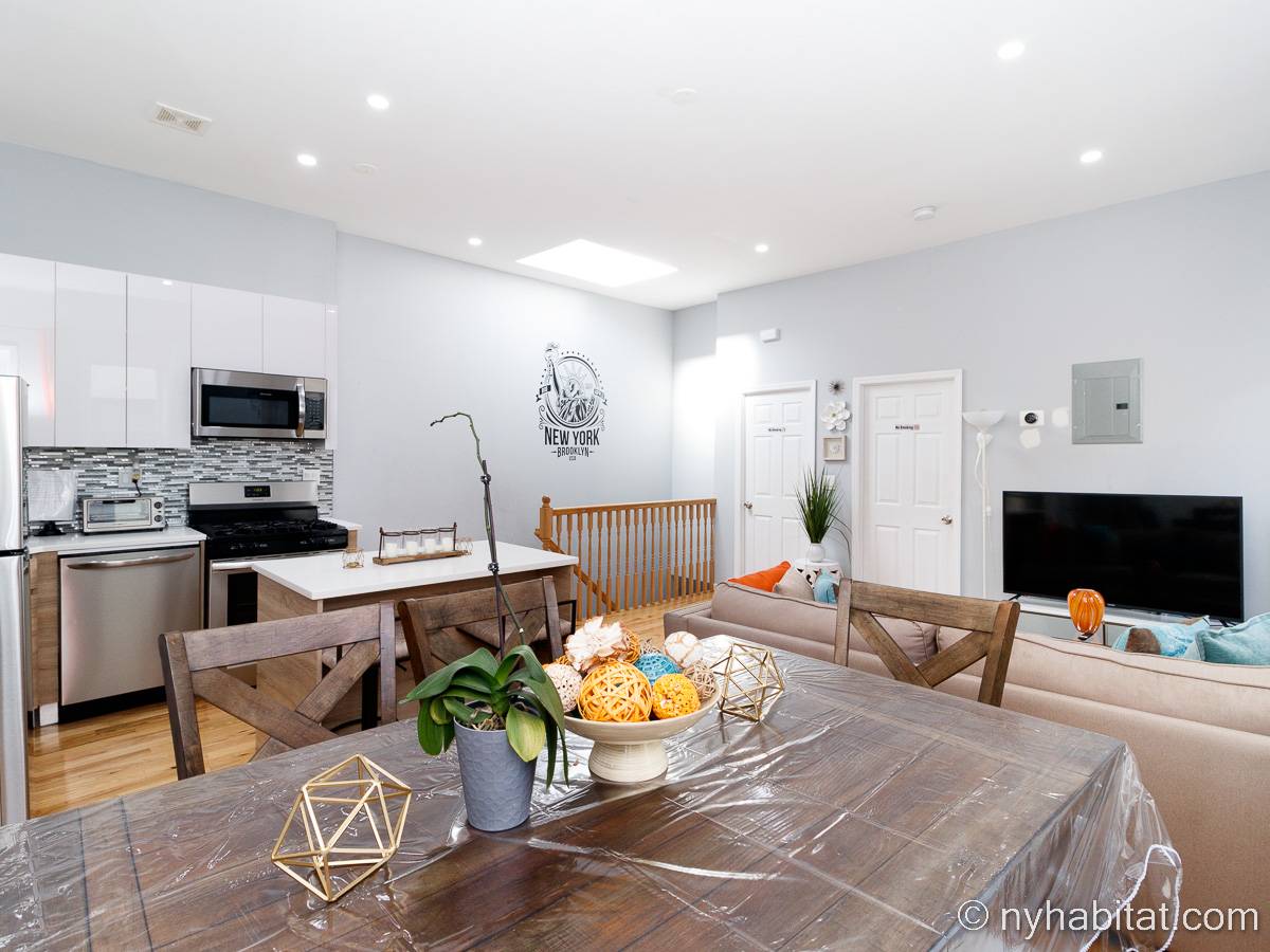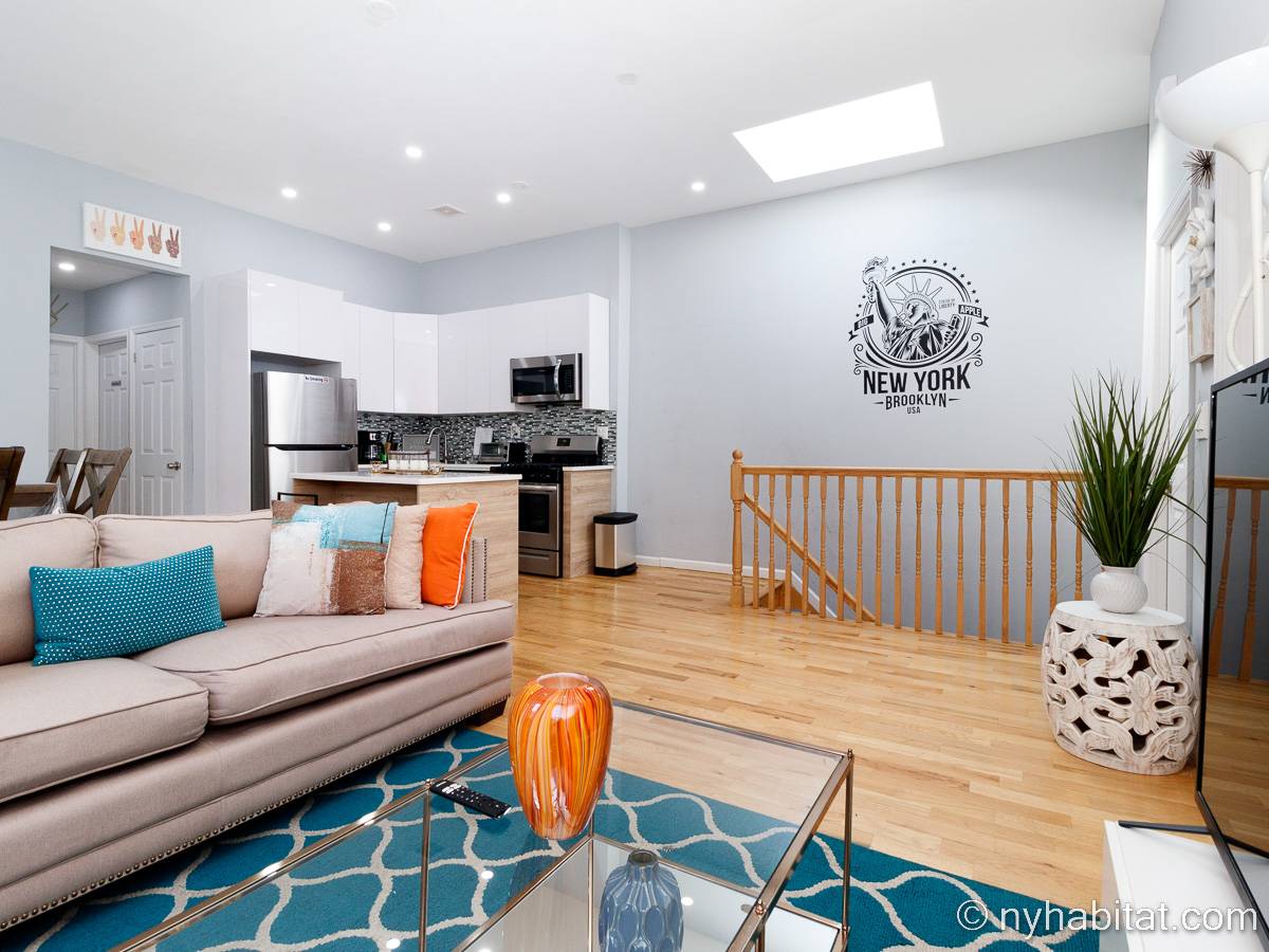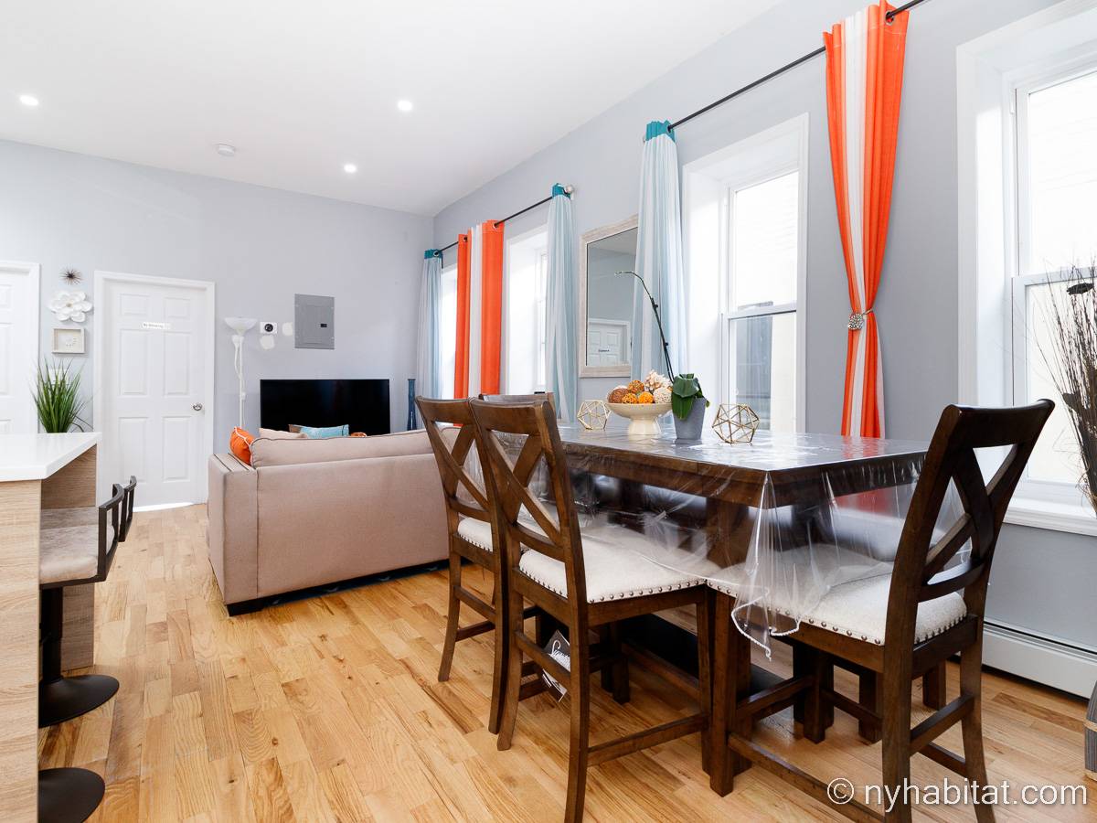 This is a furnished apartment on the second floor (equivalent to the first floor in Europe) of a townhouse in Brooklyn, New York. It consists of four bedrooms and two bathrooms. It is a 900-square-foot space (around 84 m2) near Newport Street and Van Sinderen Avenue.
