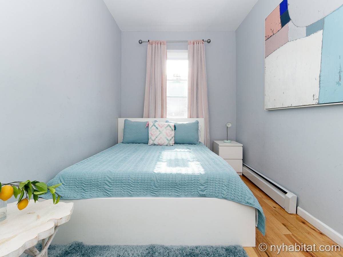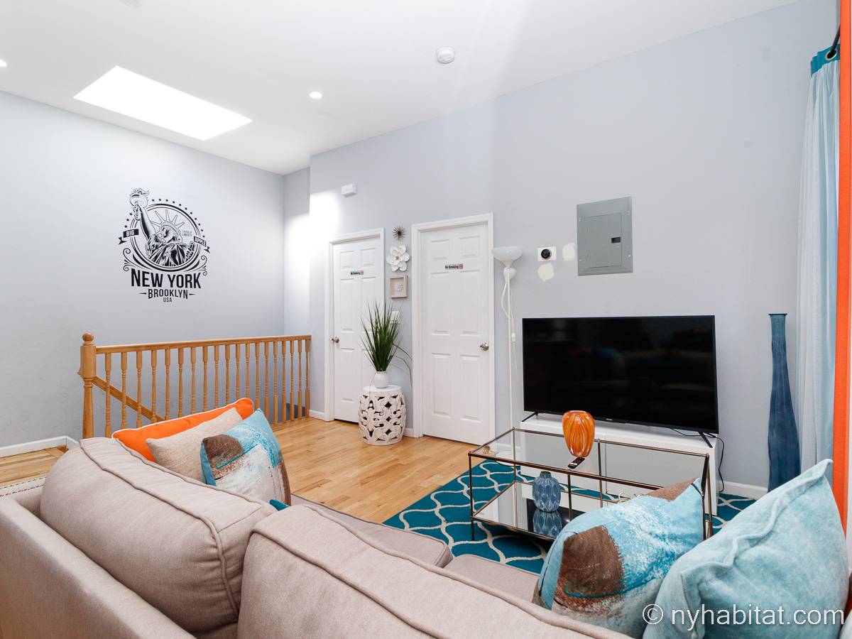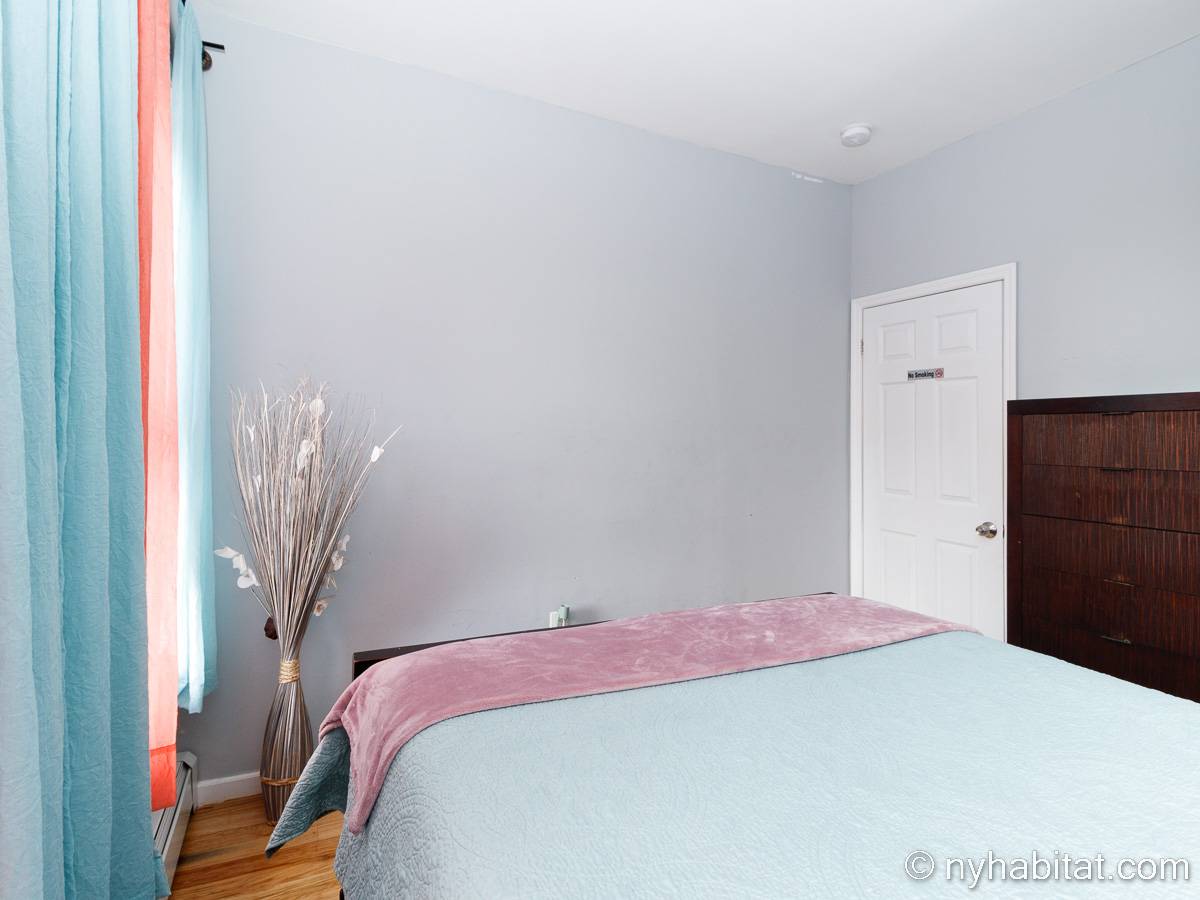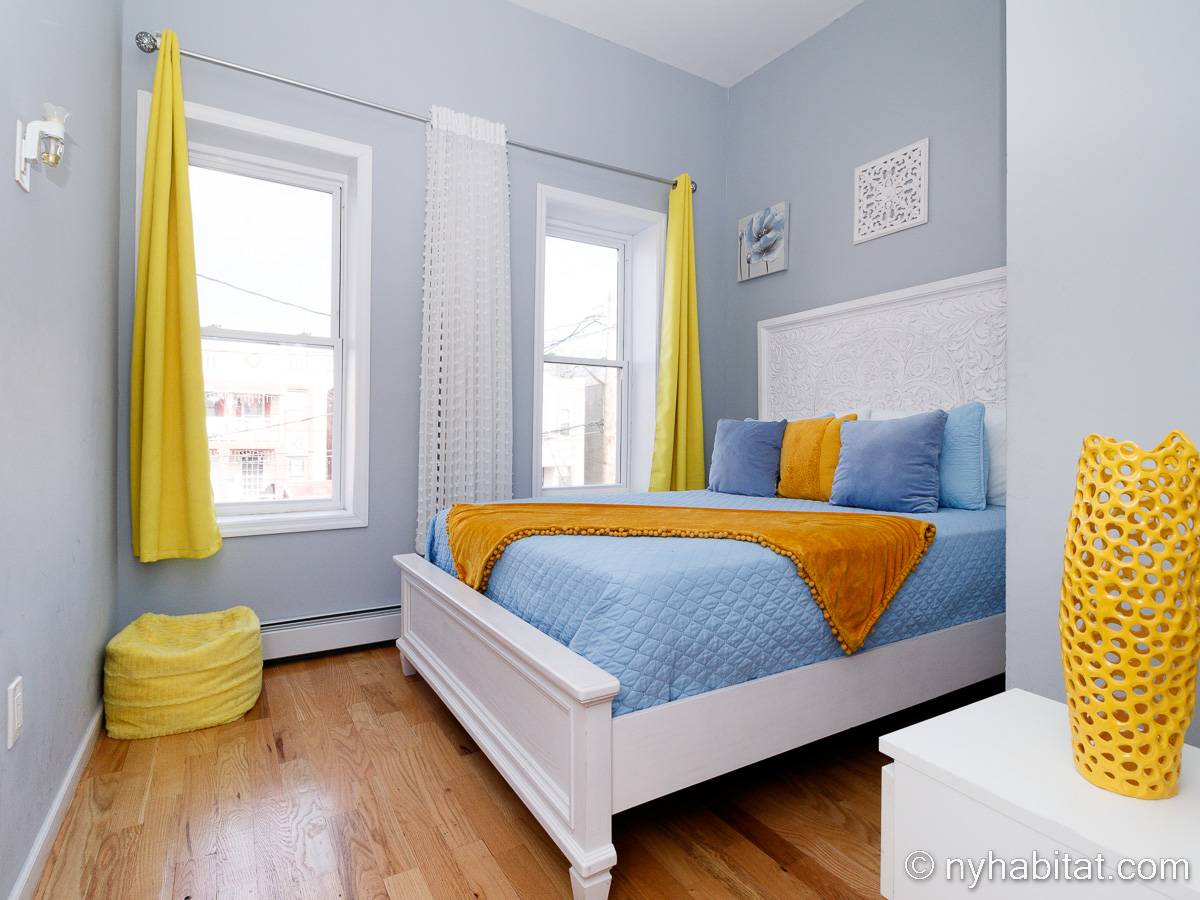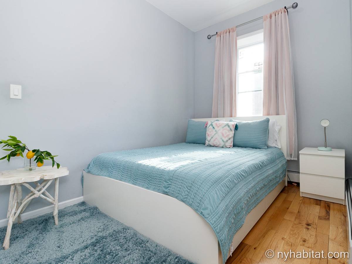 This is a furnished apartment on the second floor (equivalent to the first floor in Europe) of a townhouse in Brooklyn, New York. It consists of four bedrooms and two bathrooms. It is a 900-square-foot space (around 84 m2) near Newport Street and Van Sinderen Avenue.