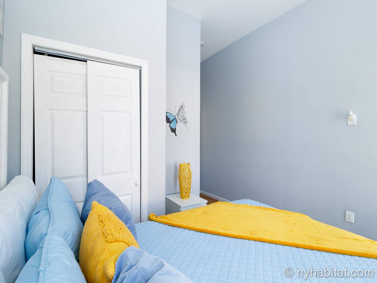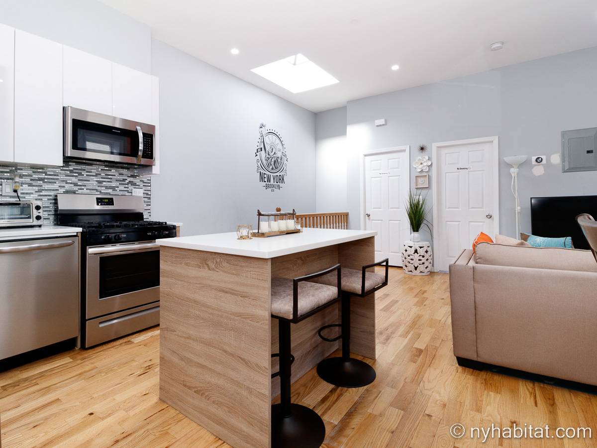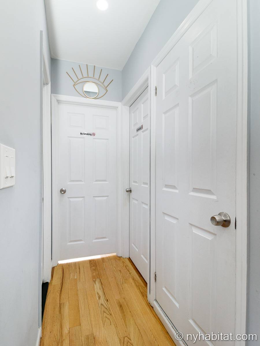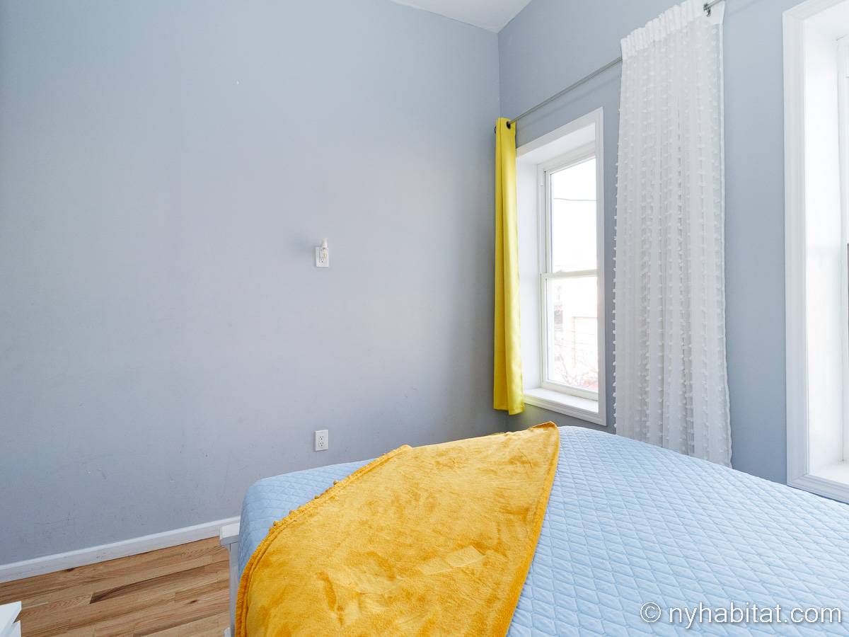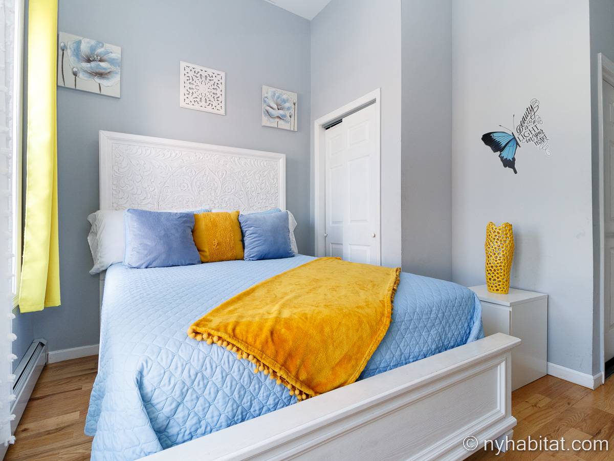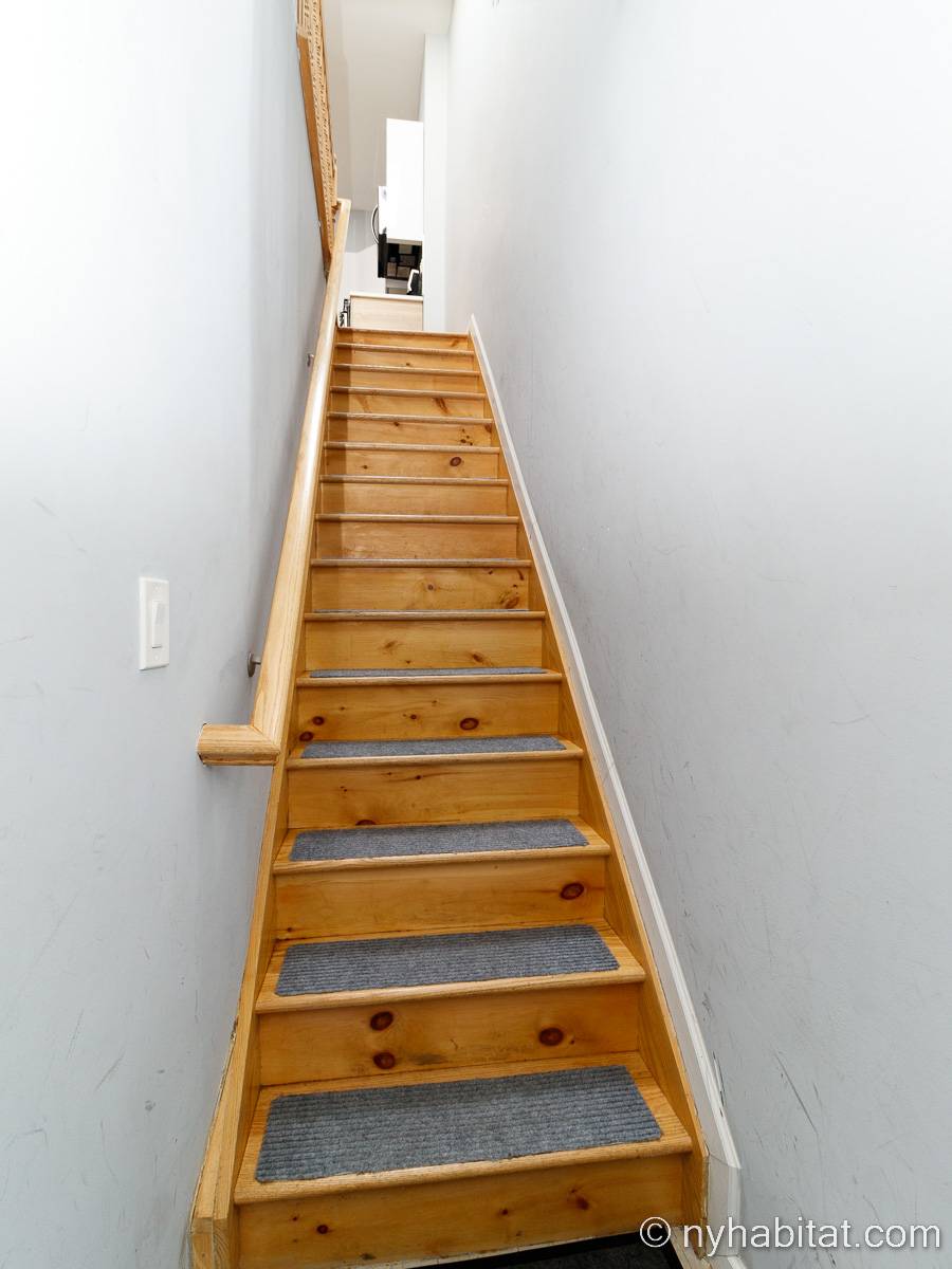 This is a furnished apartment on the second floor (equivalent to the first floor in Europe) of a townhouse in Brooklyn, New York. It consists of four bedrooms and two bathrooms. It is a 900-square-foot space (around 84 m2) near Newport Street and Van Sinderen Avenue.
