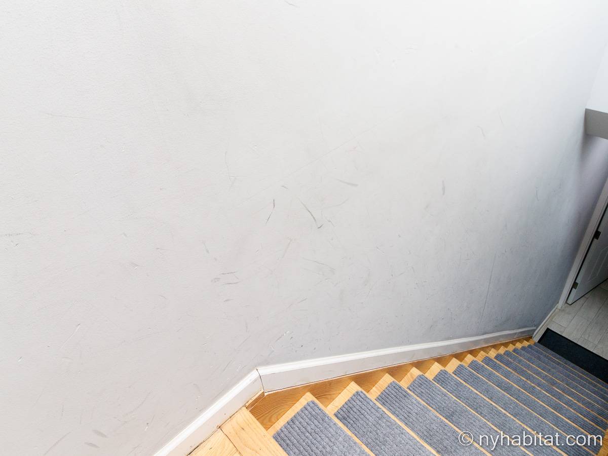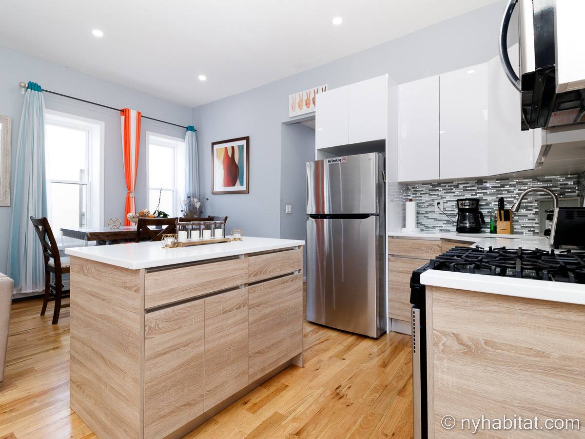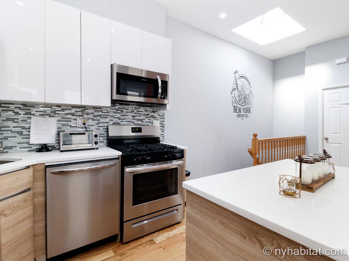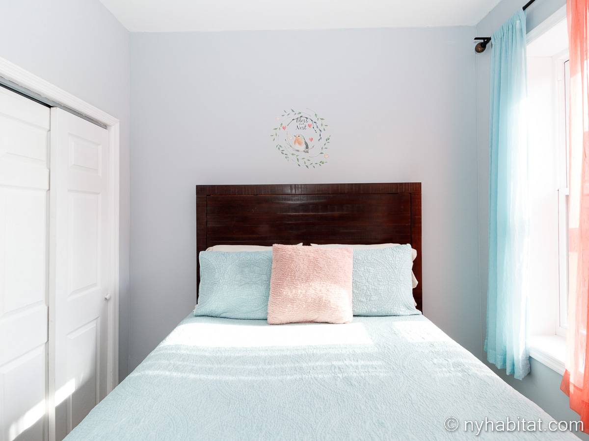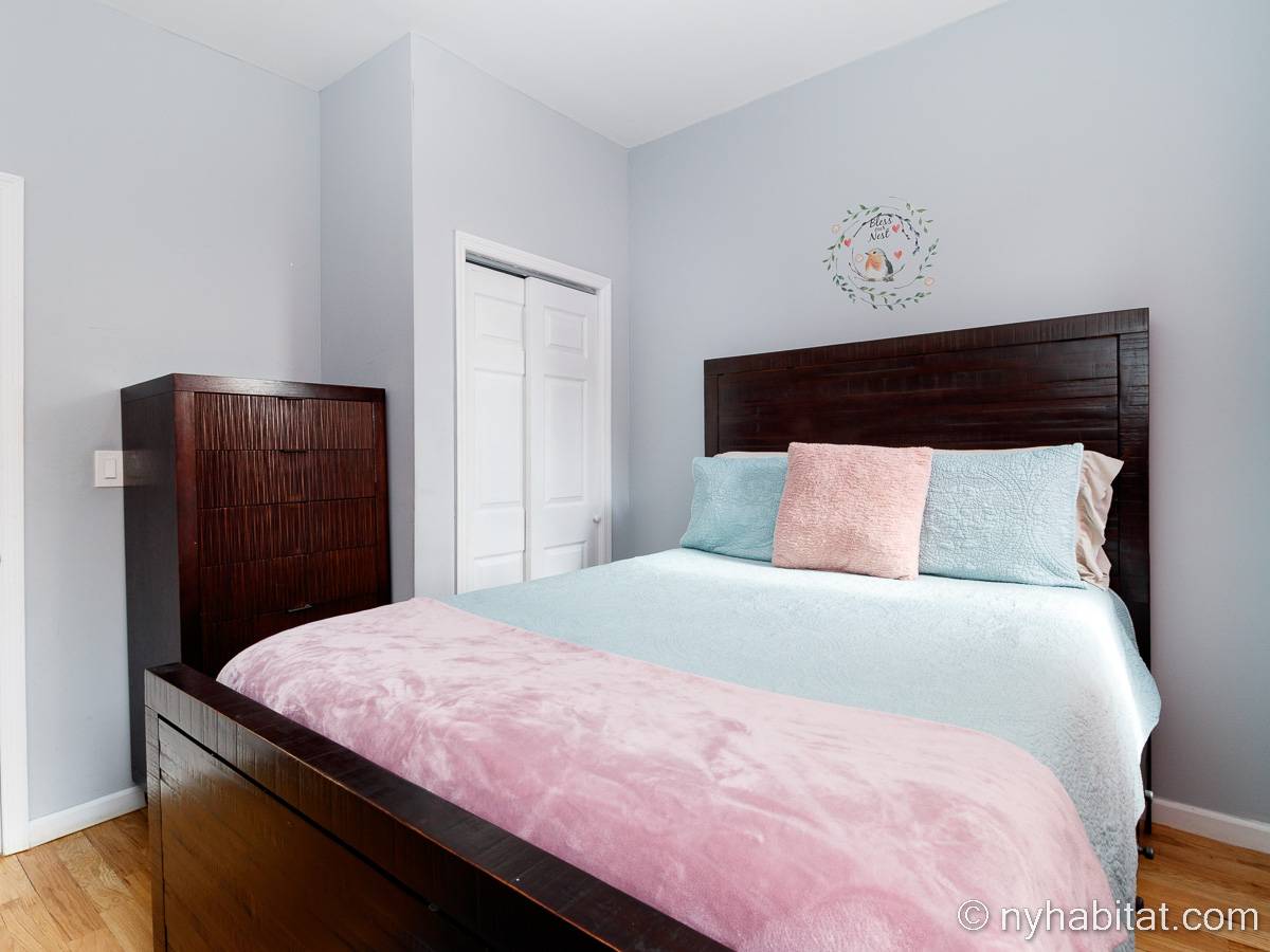 This is a furnished apartment on the second floor (equivalent to the first floor in Europe) of a townhouse in Brooklyn, New York. It consists of four bedrooms and two bathrooms. It is a 900-square-foot space (around 84 m2) near Newport Street and Van Sinderen Avenue.