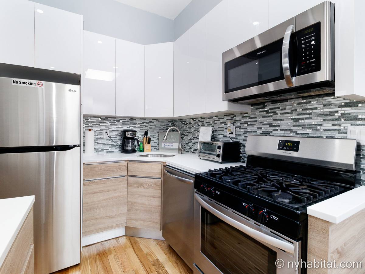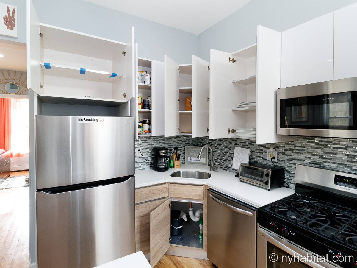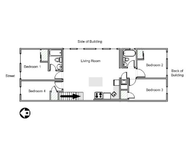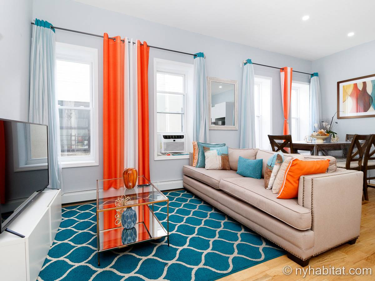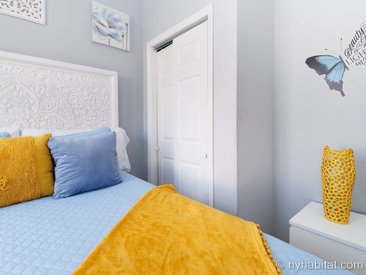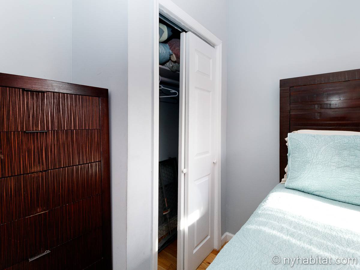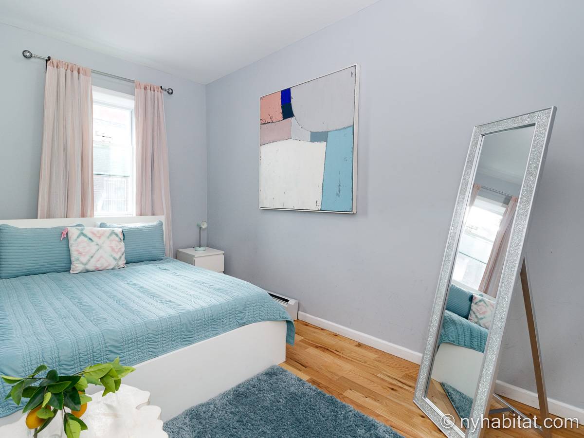 This is a furnished apartment on the second floor (equivalent to the first floor in Europe) of a townhouse in Brooklyn, New York. It consists of four bedrooms and two bathrooms. It is a 900-square-foot space (around 84 m2) near Newport Street and Van Sinderen Avenue.
