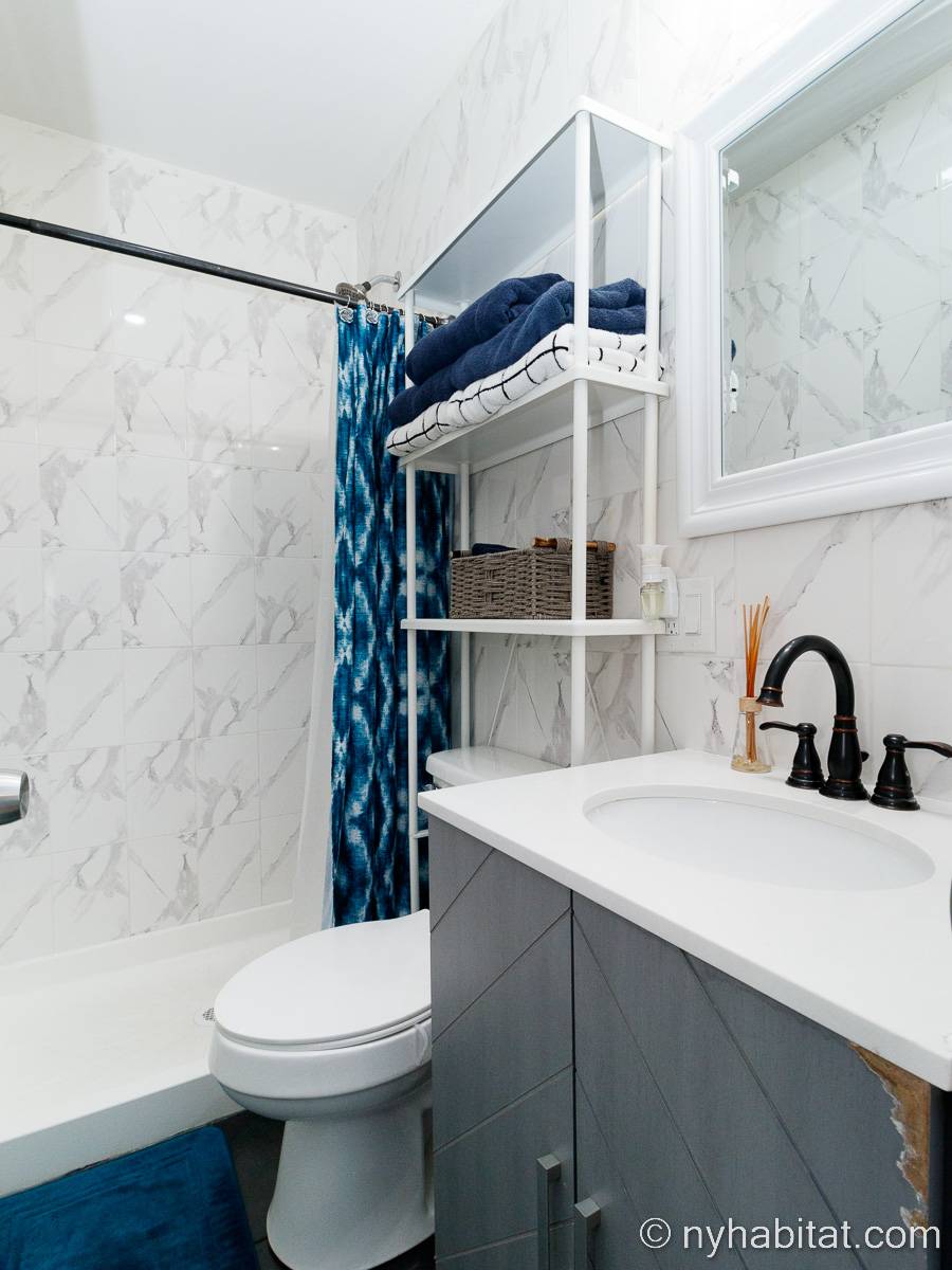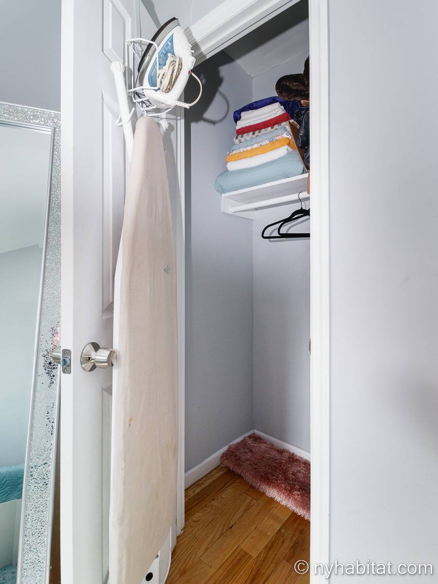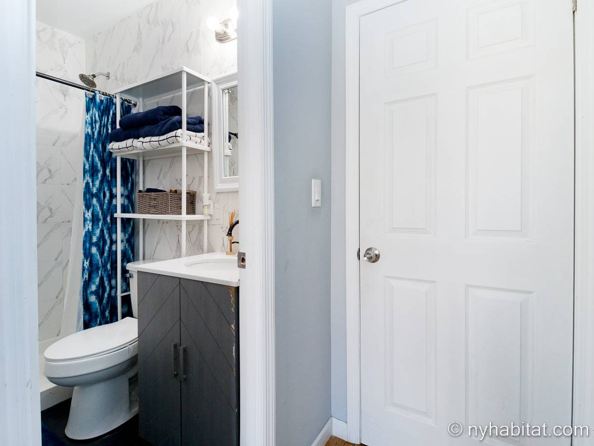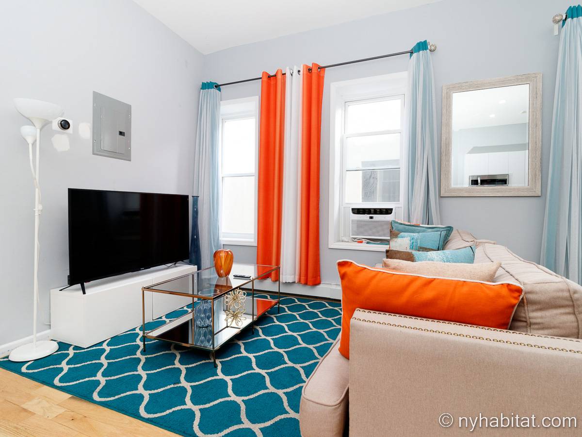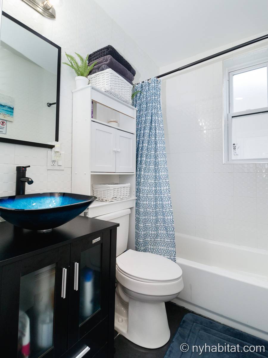 This is a furnished apartment on the second floor (equivalent to the first floor in Europe) of a townhouse in Brooklyn, New York. It consists of four bedrooms and two bathrooms. It is a 900-square-foot space (around 84 m2) near Newport Street and Van Sinderen Avenue.