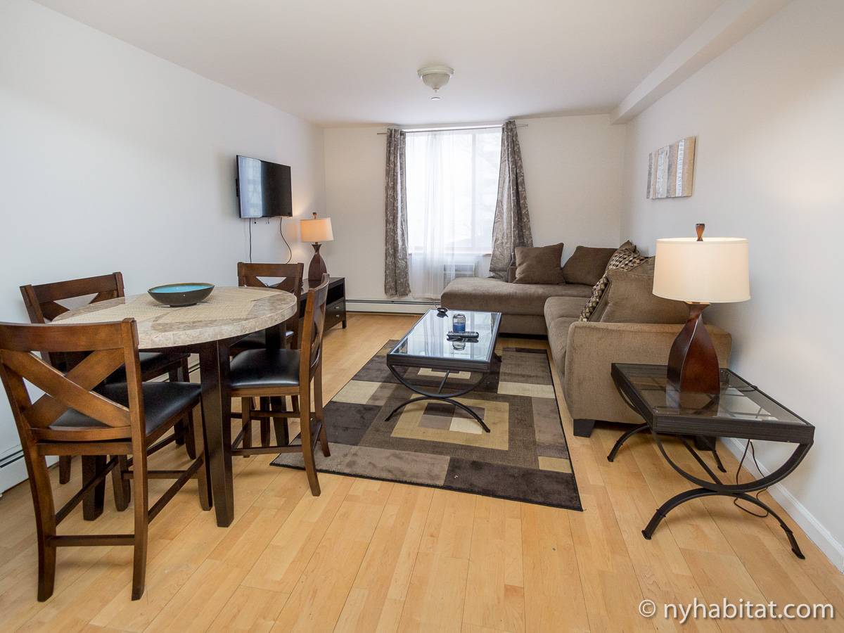 This Manhattan furnished rental sits on the first floor (equivalent to the ground floor in Europe) near the corner of West 53rd Street and 10th Avenue. The space includes a living room, which enjoys a large window, and a kitchen. The living room features a sofa, television, and dining area. Adjacent to the living room, the apartment also includes a balcony.