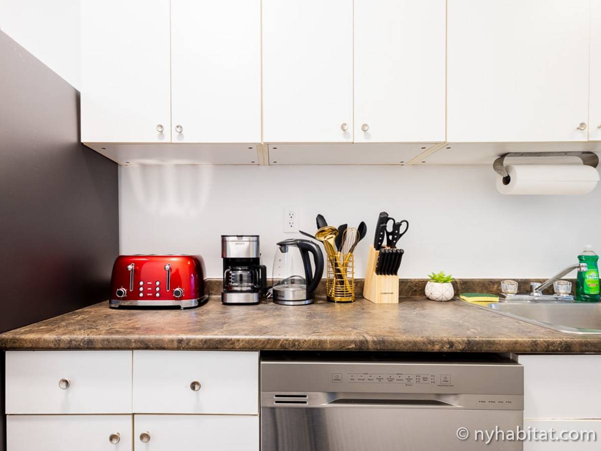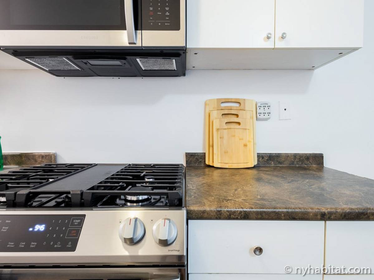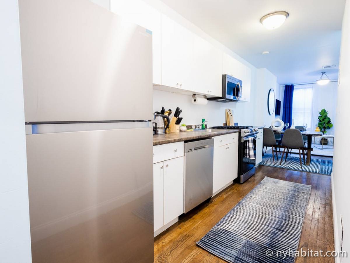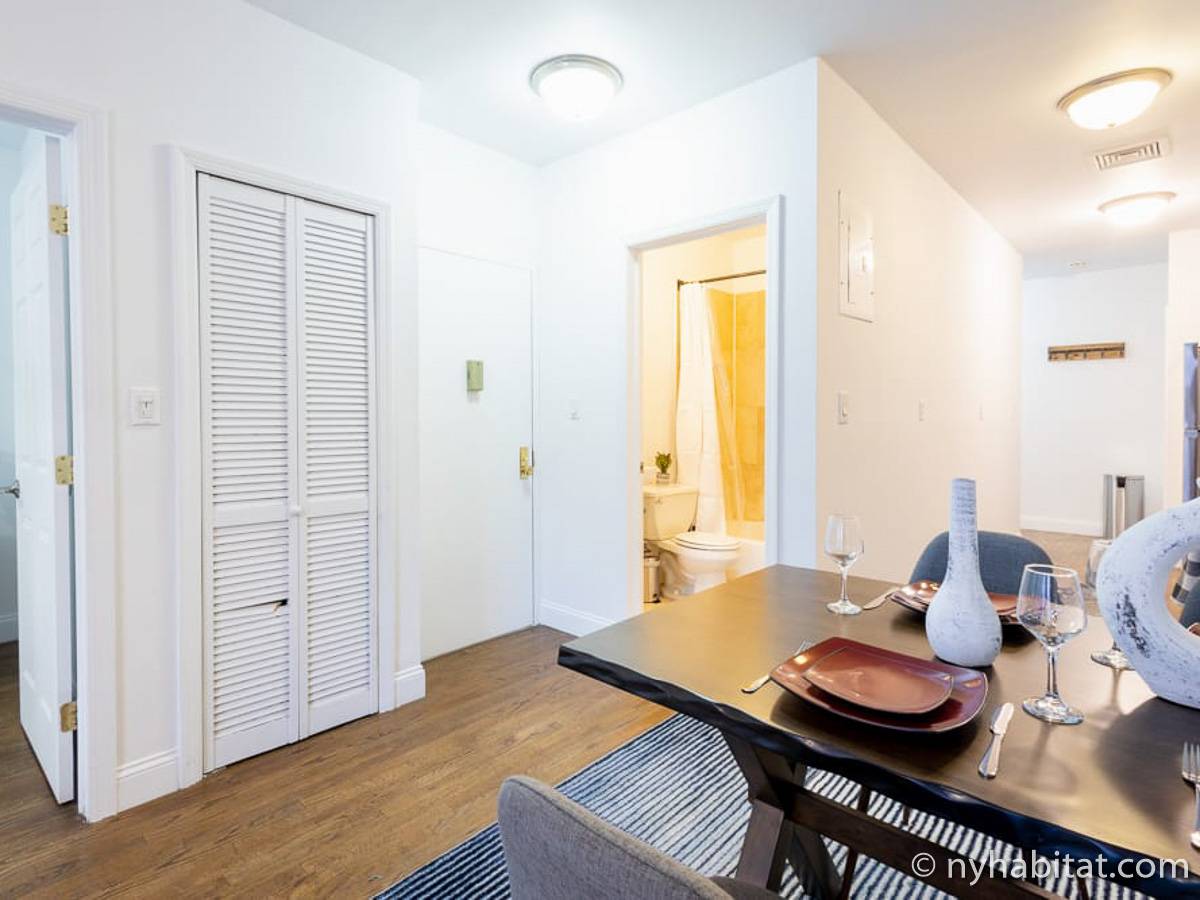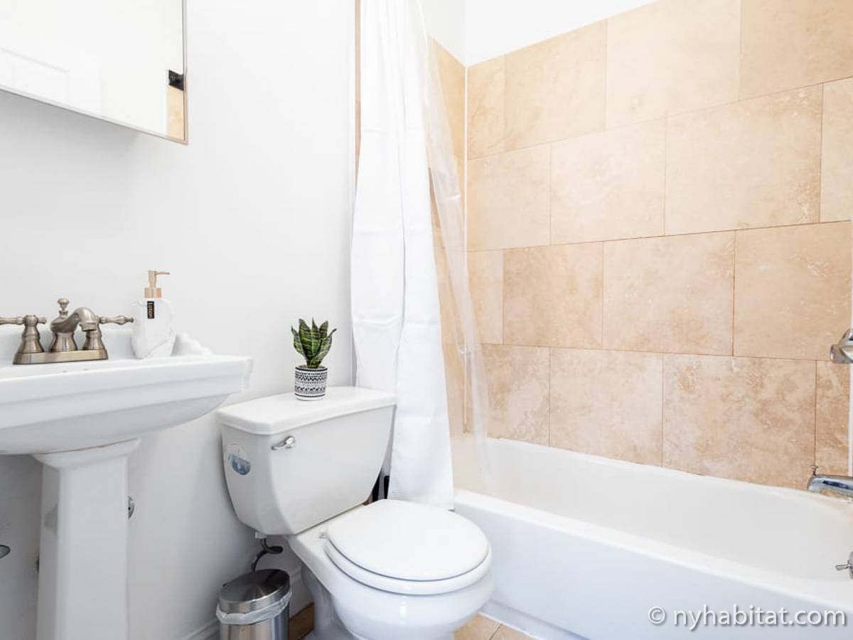 This Upper East Side furnished rental near the corner of 2nd Avenue and East 75th Street features a living room, kitchen, and in-unit laundry. In the living room, you can find a television, sofa, and dining area. Hardwood flooring here, and two windows, give the space a chic aesthetic. The open kitchen provides a stainless-steel refrigerator, freezer, oven, microwave, dishwasher, and coffee machine, as well as a toaster. All three bedrooms include a double-size bed, closet space, and air conditioning. The bathrooms have a shower with a built-in bathtub, and a pedestal sink.