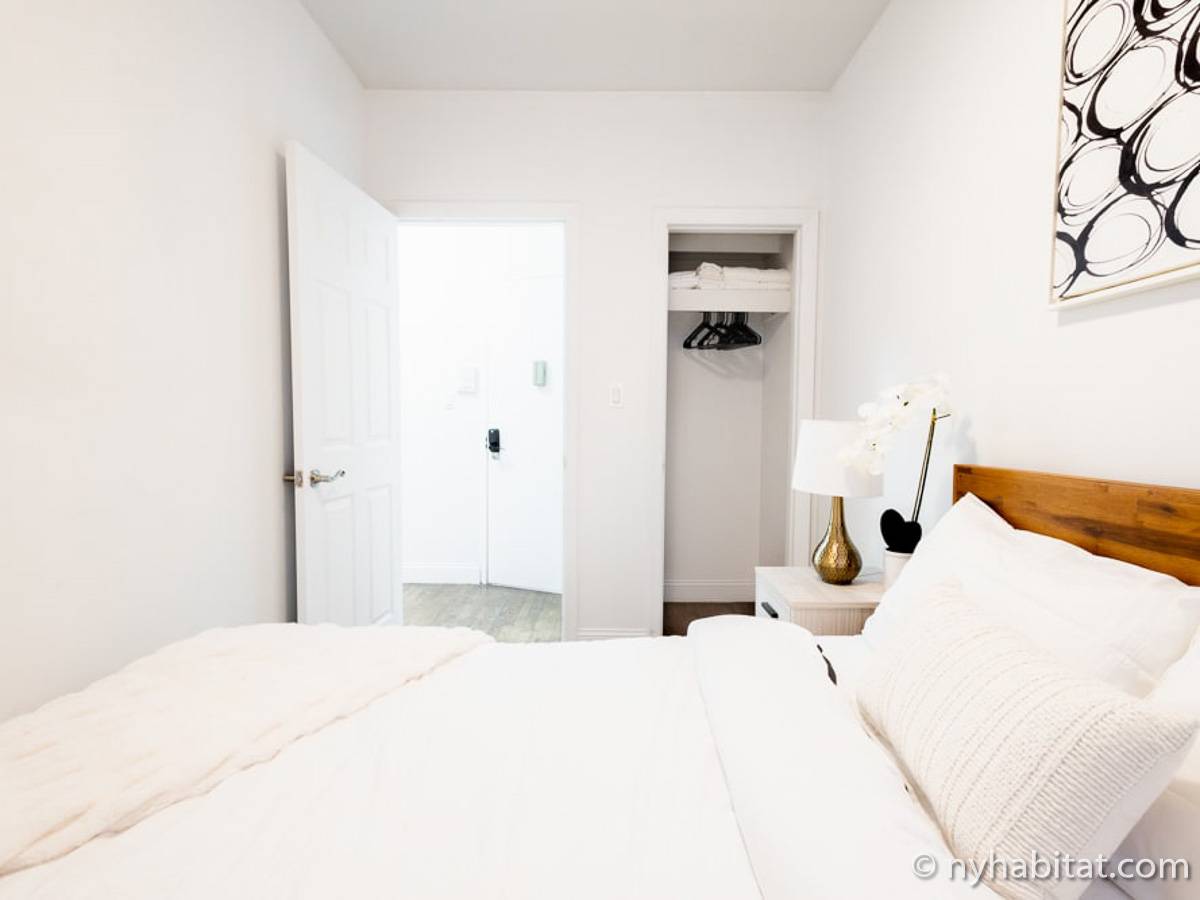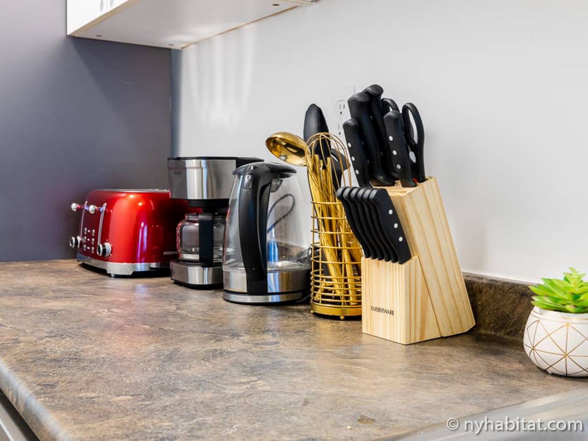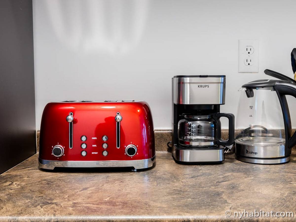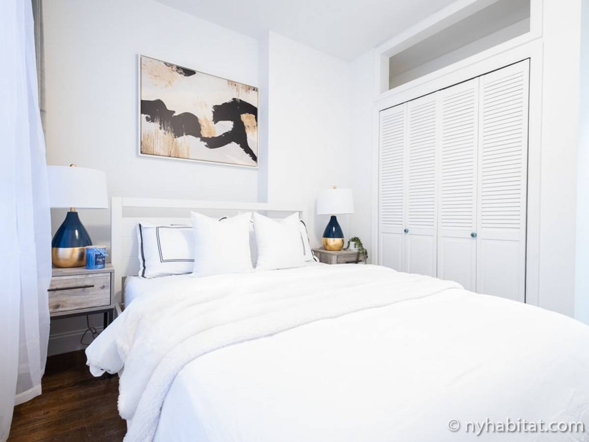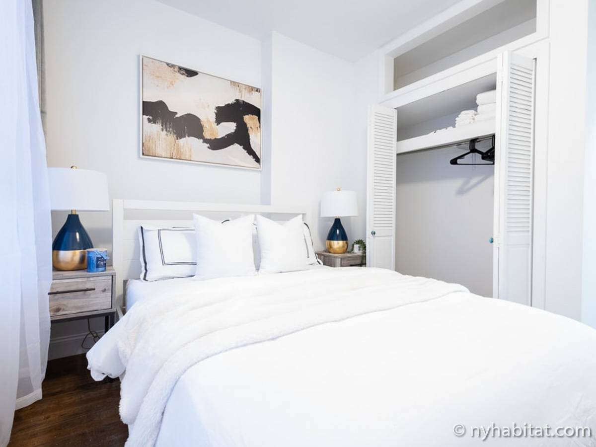 This Upper East Side furnished rental near the corner of 2nd Avenue and East 75th Street features a living room, kitchen, and in-unit laundry. In the living room, you can find a television, sofa, and dining area. Hardwood flooring here, and two windows, give the space a chic aesthetic. The open kitchen provides a stainless-steel refrigerator, freezer, oven, microwave, dishwasher, and coffee machine, as well as a toaster. All three bedrooms include a double-size bed, closet space, and air conditioning. The bathrooms have a shower with a built-in bathtub, and a pedestal sink.