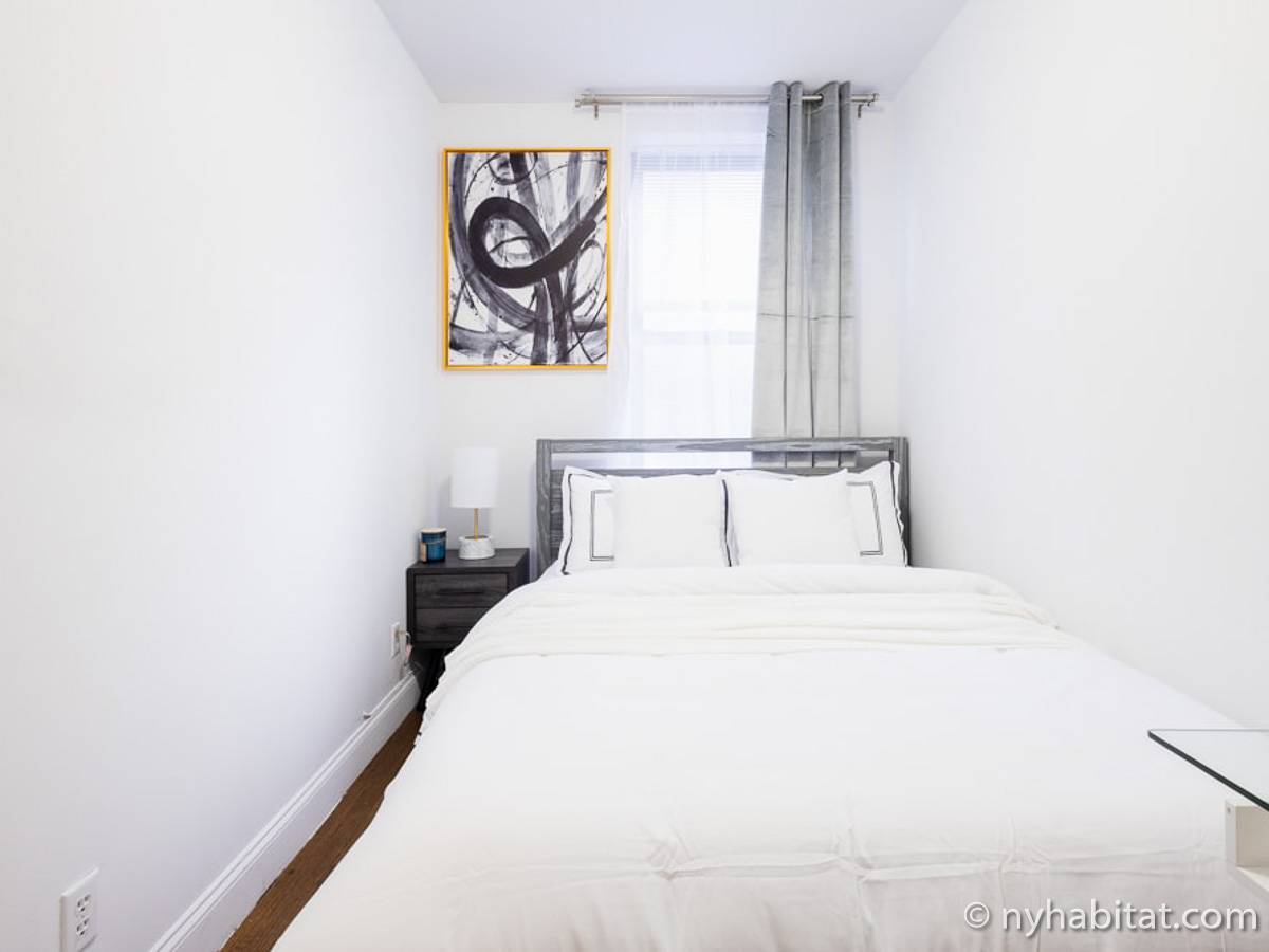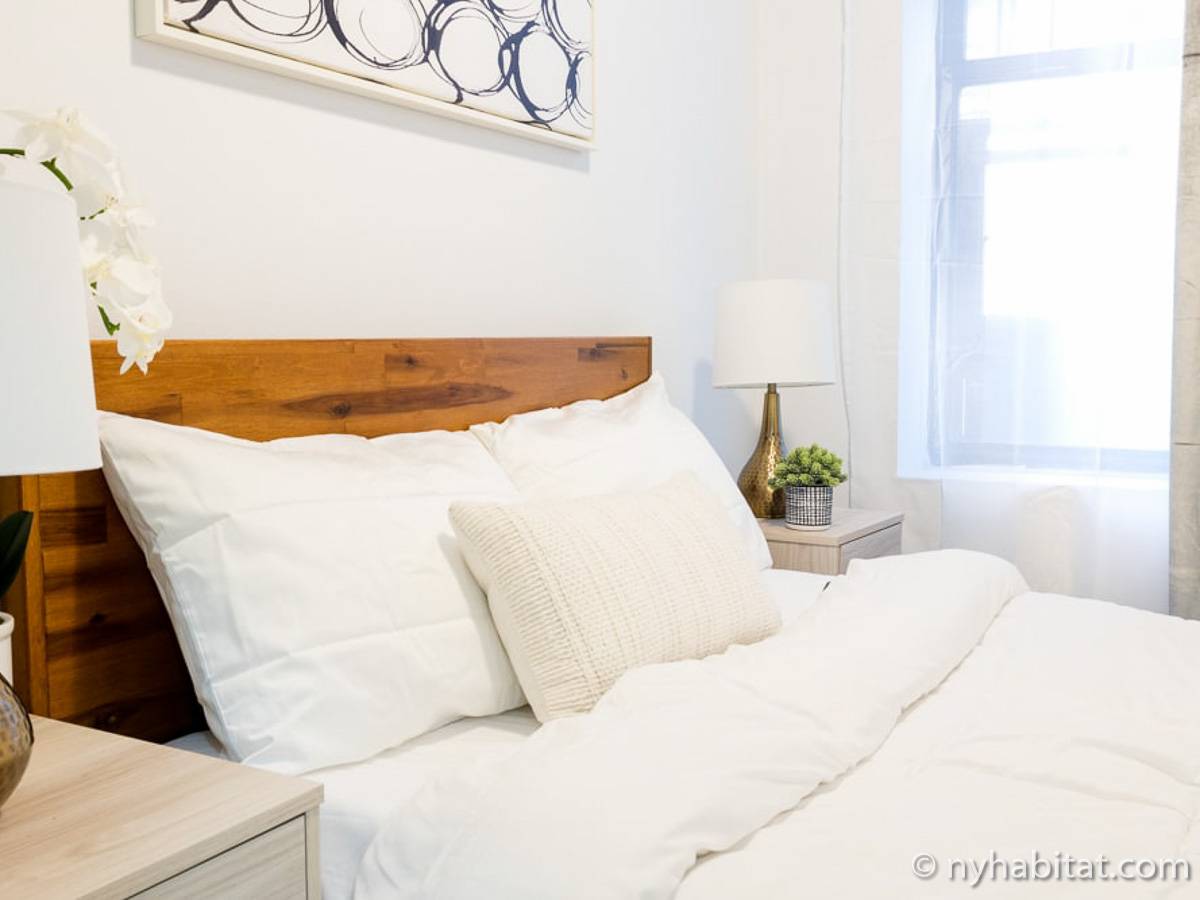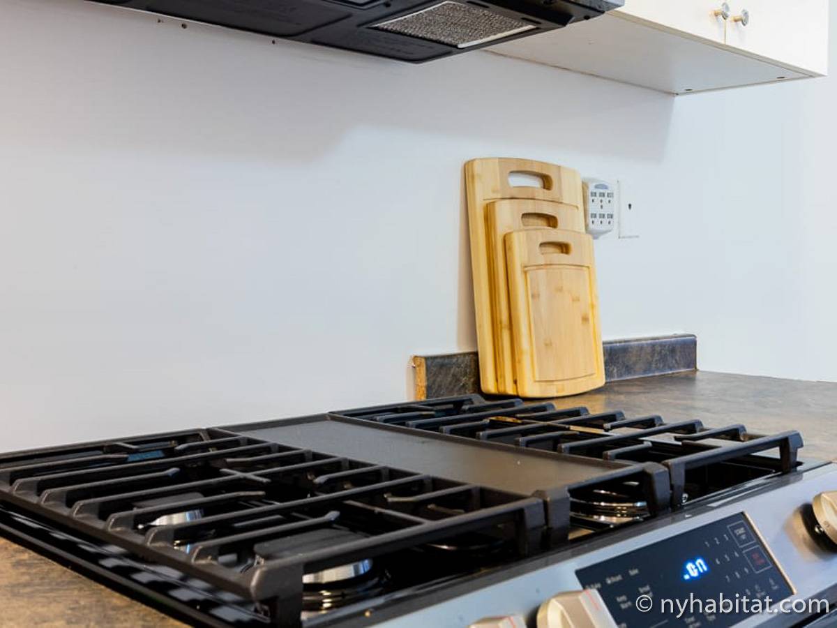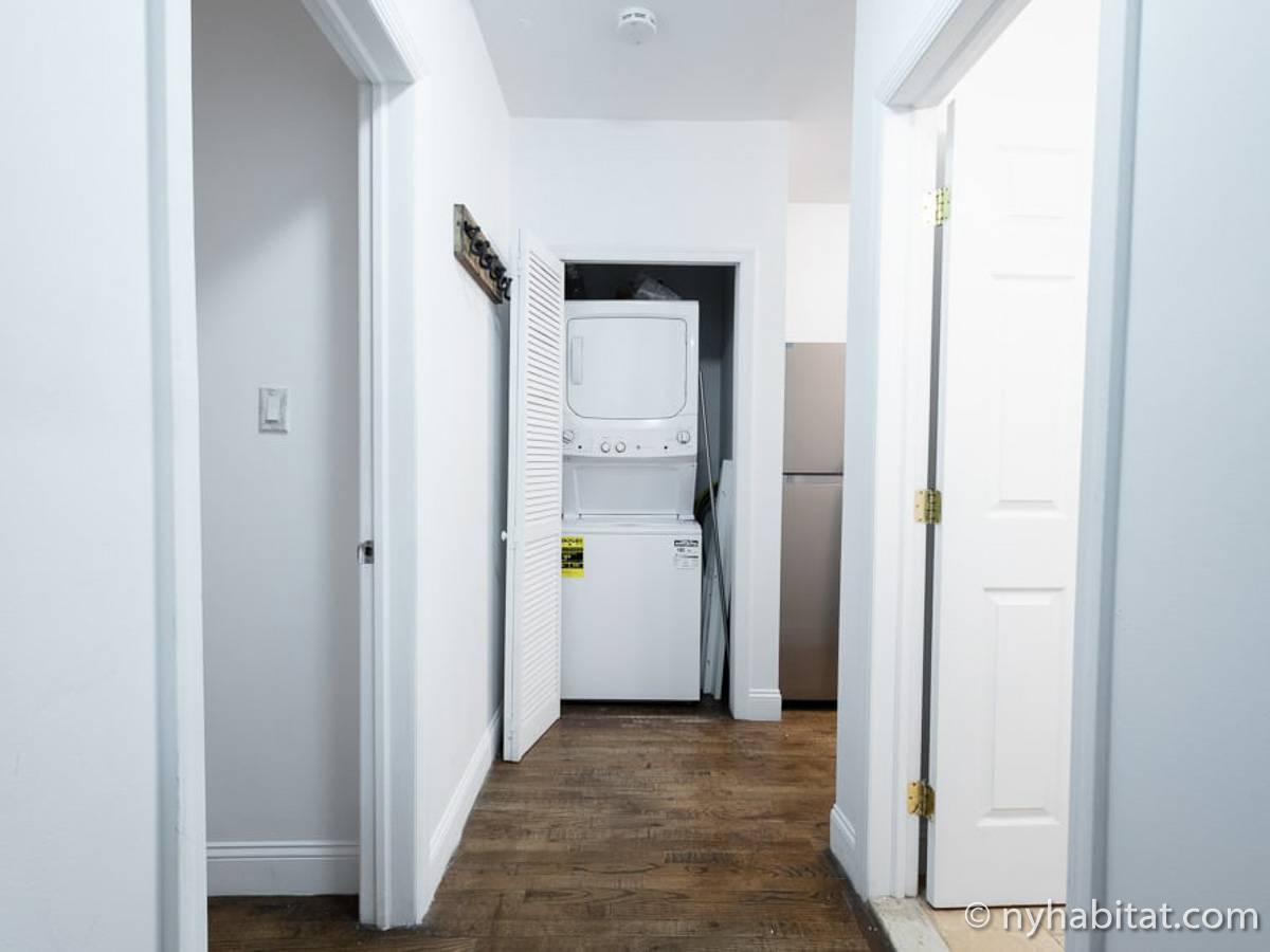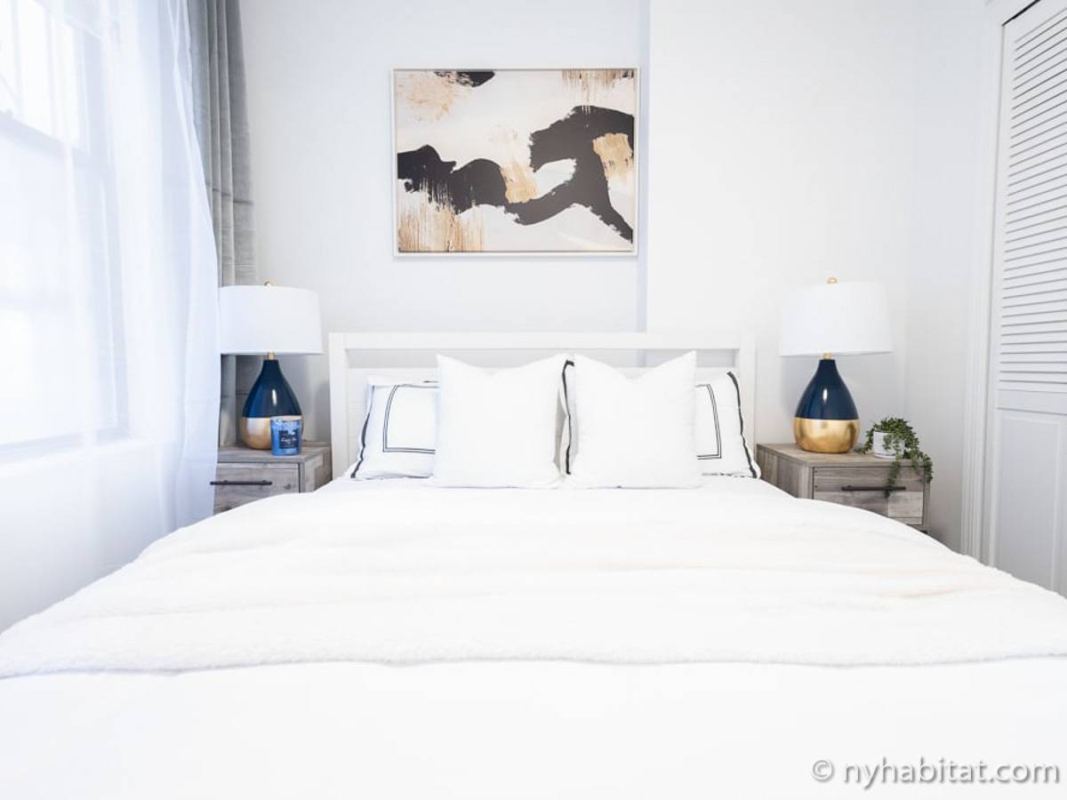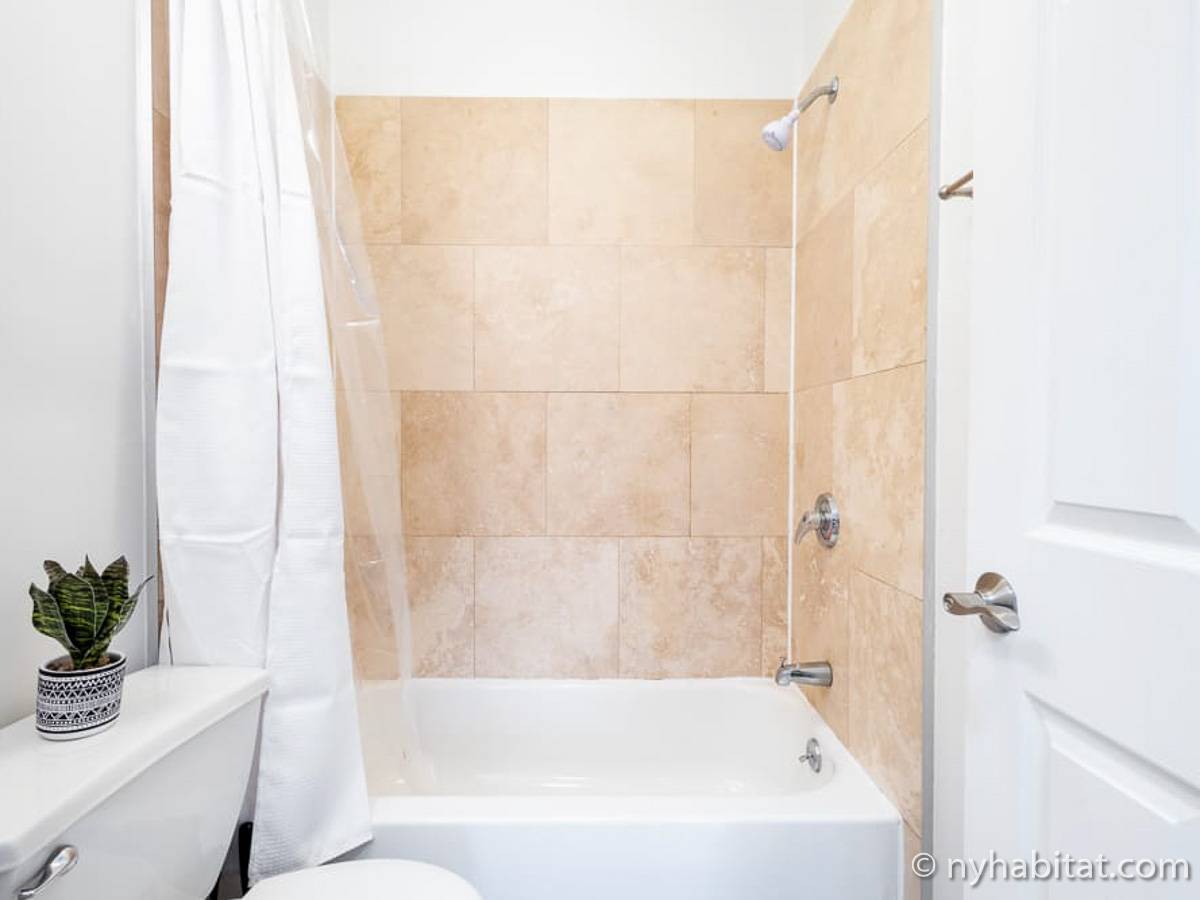 This Upper East Side furnished rental near the corner of 2nd Avenue and East 75th Street features a living room, kitchen, and in-unit laundry. In the living room, you can find a television, sofa, and dining area. Hardwood flooring here, and two windows, give the space a chic aesthetic. The open kitchen provides a stainless-steel refrigerator, freezer, oven, microwave, dishwasher, and coffee machine, as well as a toaster. All three bedrooms include a double-size bed, closet space, and air conditioning. The bathrooms have a shower with a built-in bathtub, and a pedestal sink.
