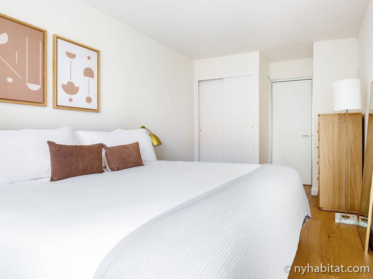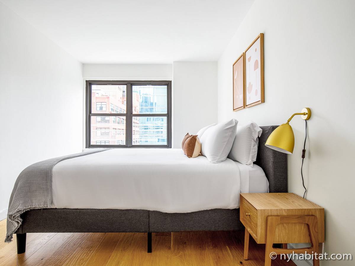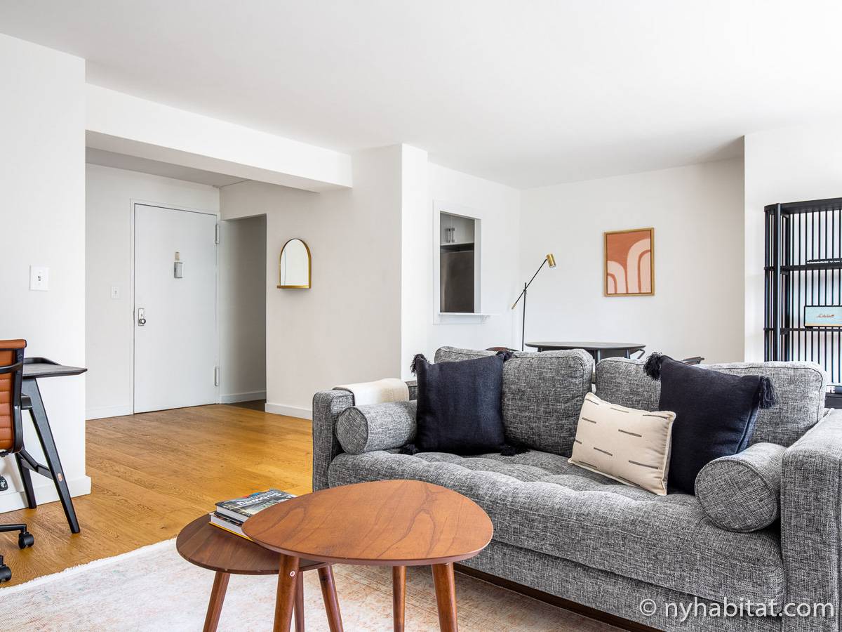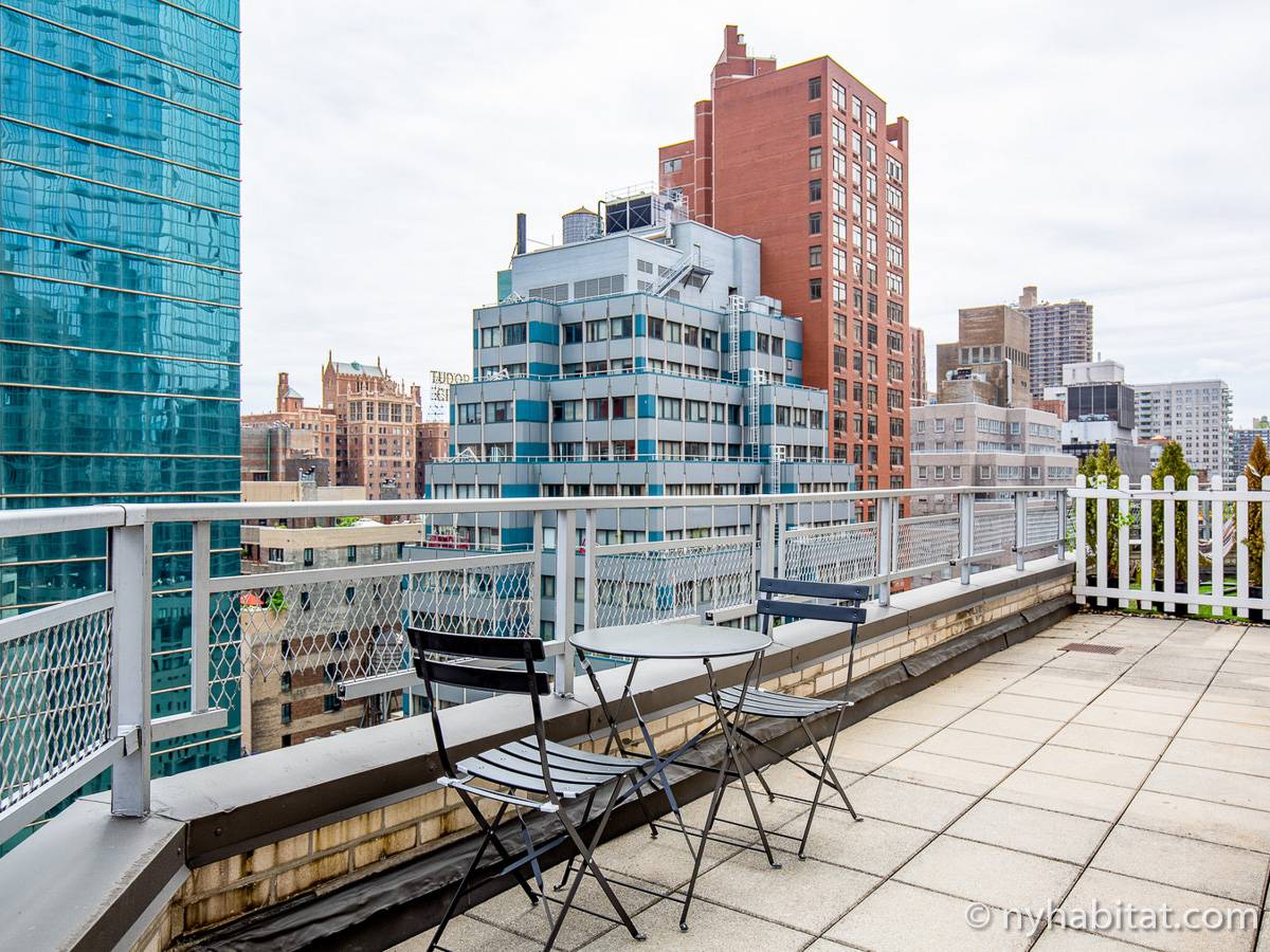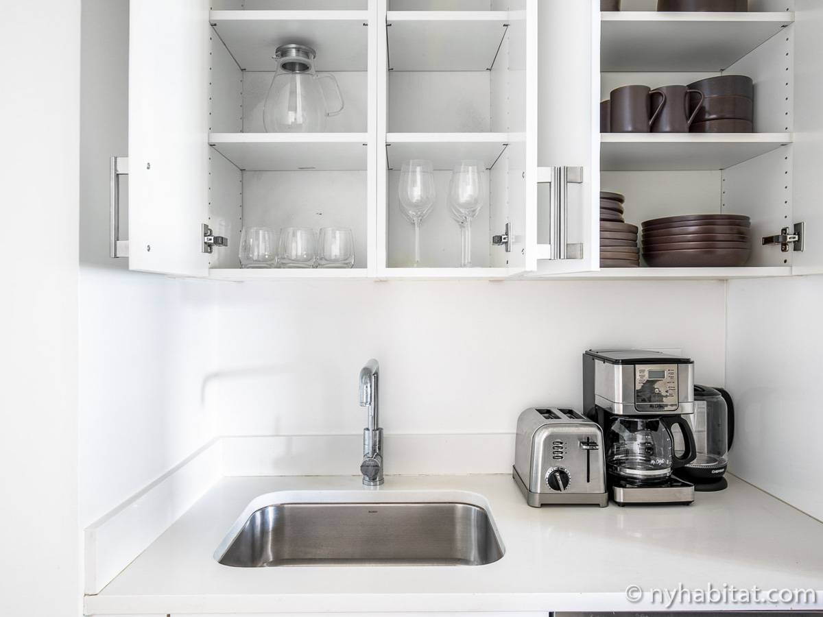 This 950-square-foot (around 88 m2) Manhattan furnished rental sits on the twentieth floor (equivalent to the nineteenth floor in Europe) of a high-rise doorman building near the corner of East 44th Street and 2nd Avenue. The apartment takes advantage of this elevated perch with a balcony. Sporting views of the surrounding area, the living room features a sofa, television, dining area, and air conditioning. The separate kitchen provides a stainless-steel refrigerator, freezer, oven, microwave, dishwasher, toaster, and coffee machine. The bedroom boasts a king-size bed, a window, and air conditioning. The bathroom offers a shower with a built-in bathtub and under sink storage. In addition to the aforementioned apartment features, this building has a laundry room and an elevator.