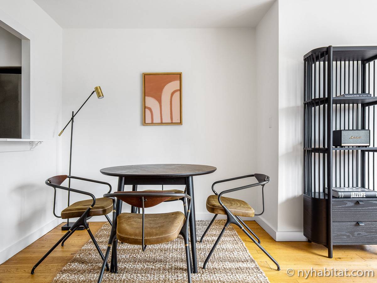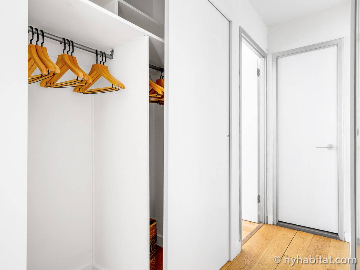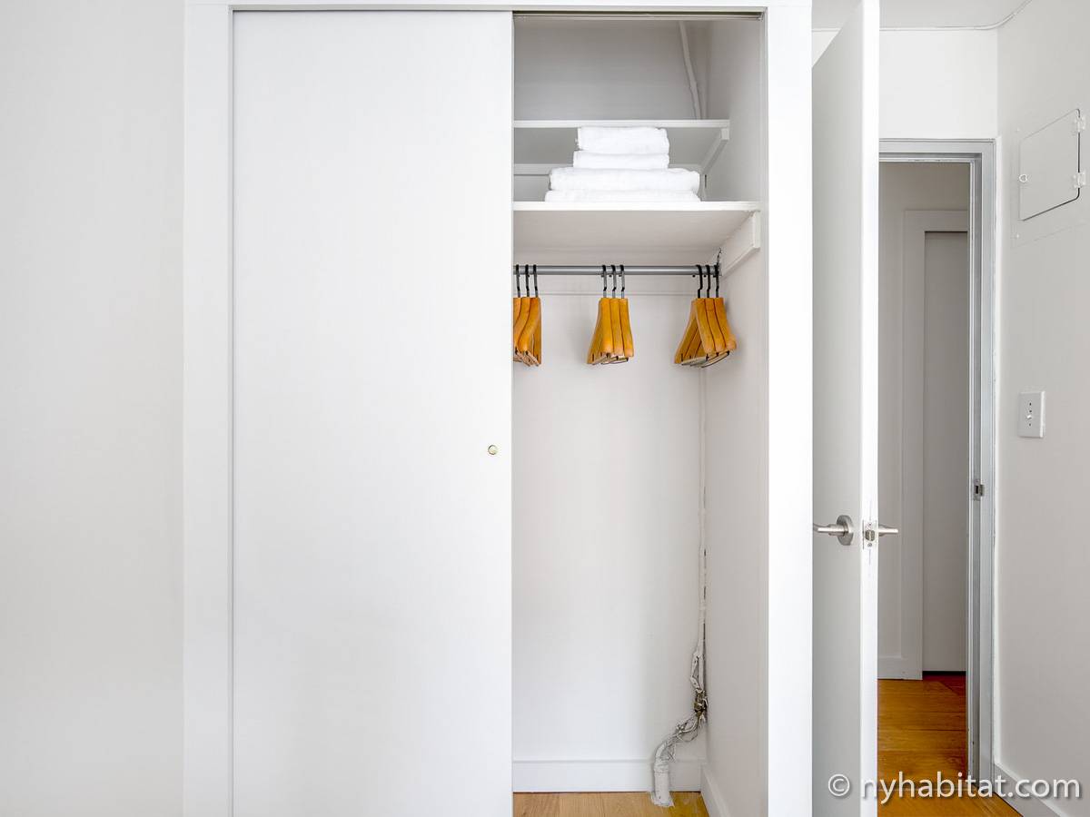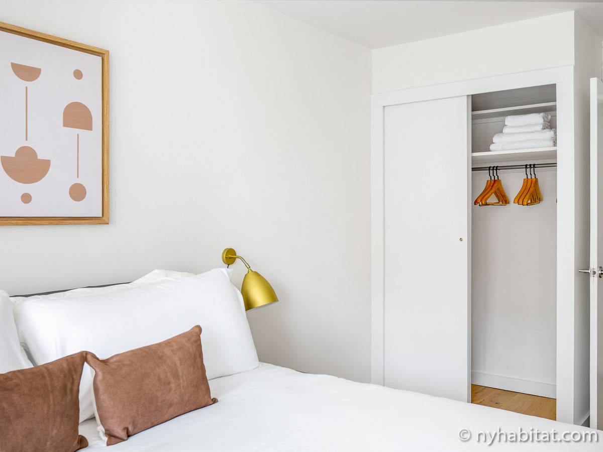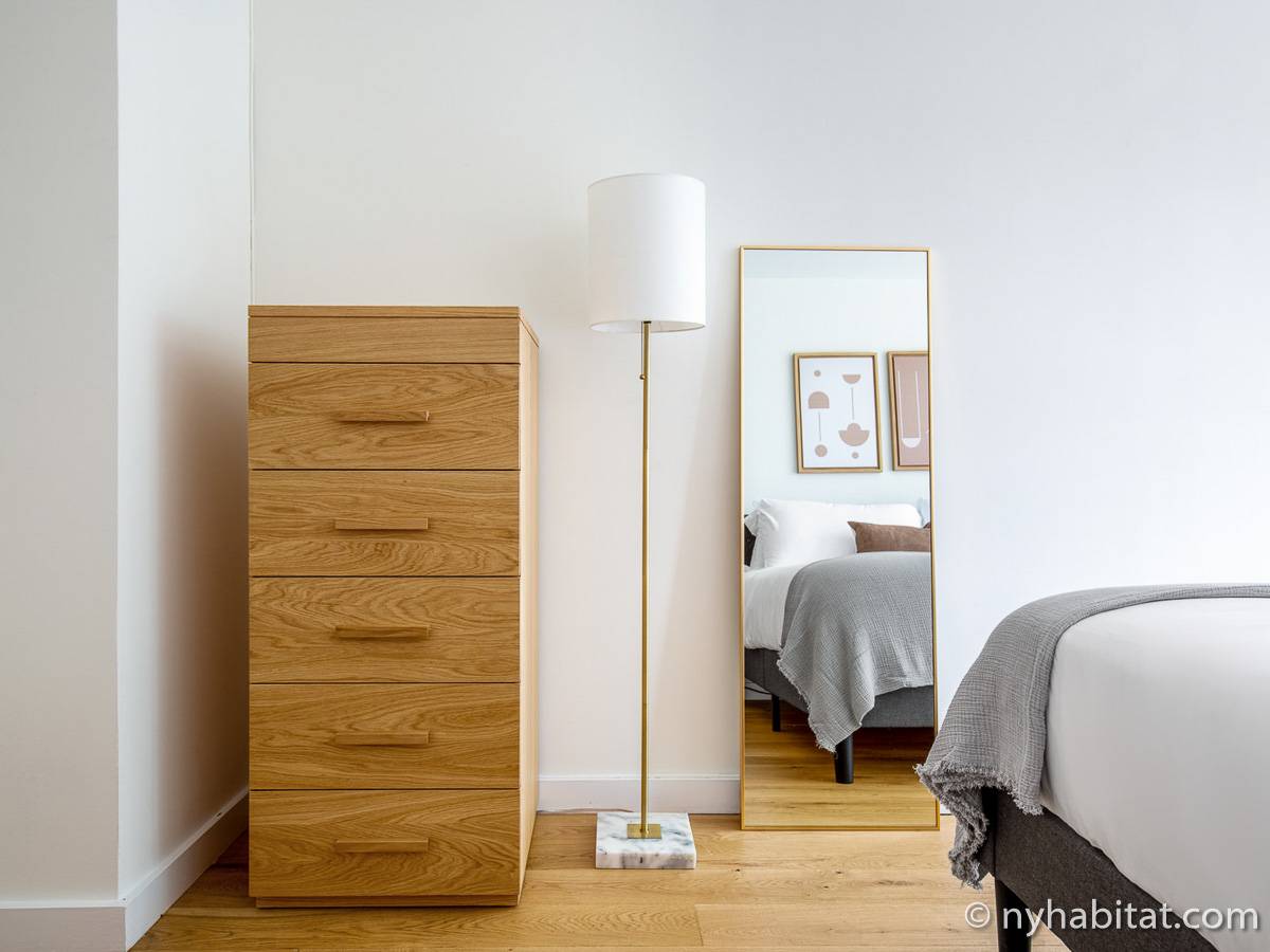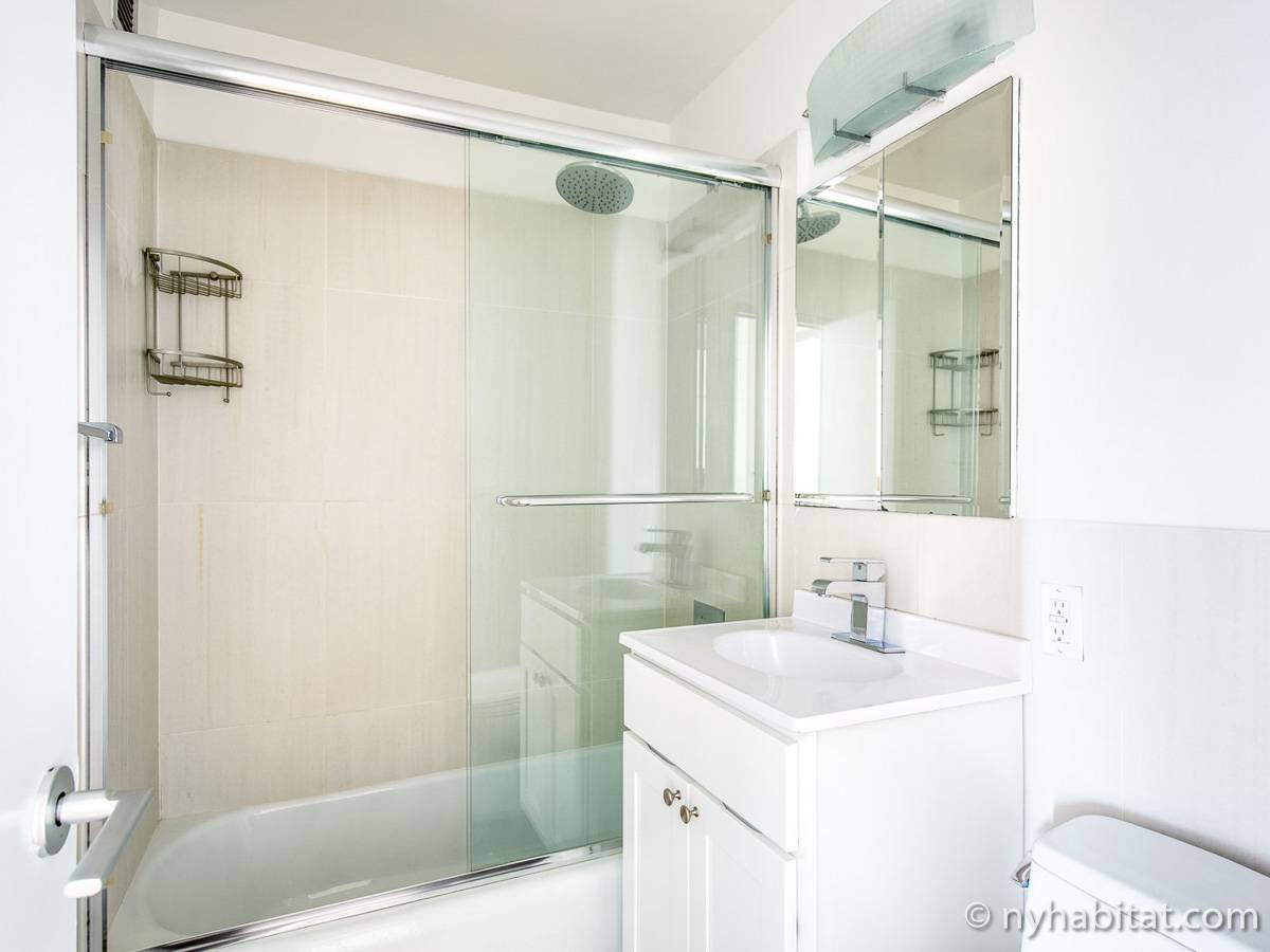 This 950-square-foot (around 88 m2) Manhattan furnished rental sits on the twentieth floor (equivalent to the nineteenth floor in Europe) of a high-rise doorman building near the corner of East 44th Street and 2nd Avenue. The apartment takes advantage of this elevated perch with a balcony. Sporting views of the surrounding area, the living room features a sofa, television, dining area, and air conditioning. The separate kitchen provides a stainless-steel refrigerator, freezer, oven, microwave, dishwasher, toaster, and coffee machine. The bedroom boasts a king-size bed, a window, and air conditioning. The bathroom offers a shower with a built-in bathtub and under sink storage. In addition to the aforementioned apartment features, this building has a laundry room and an elevator.