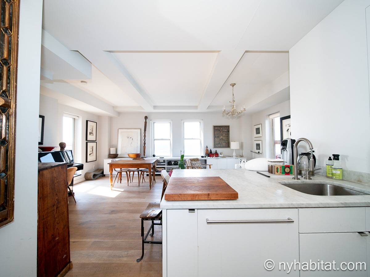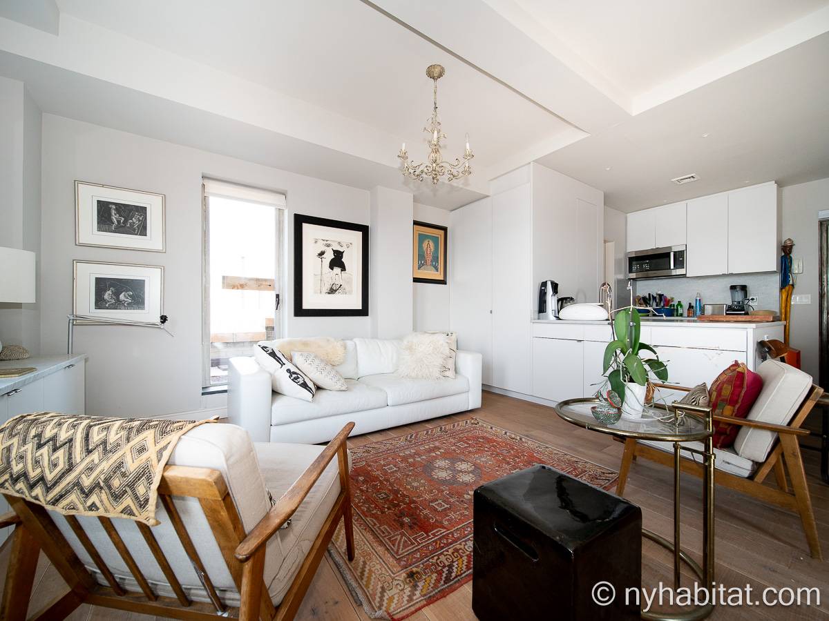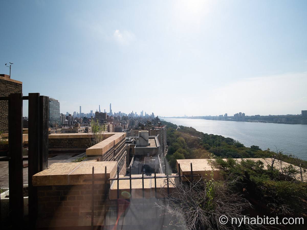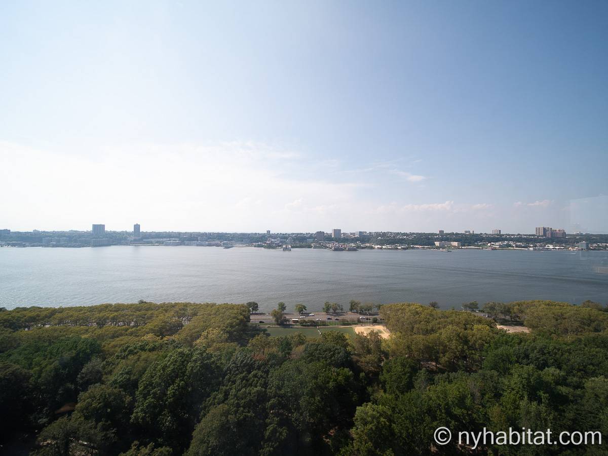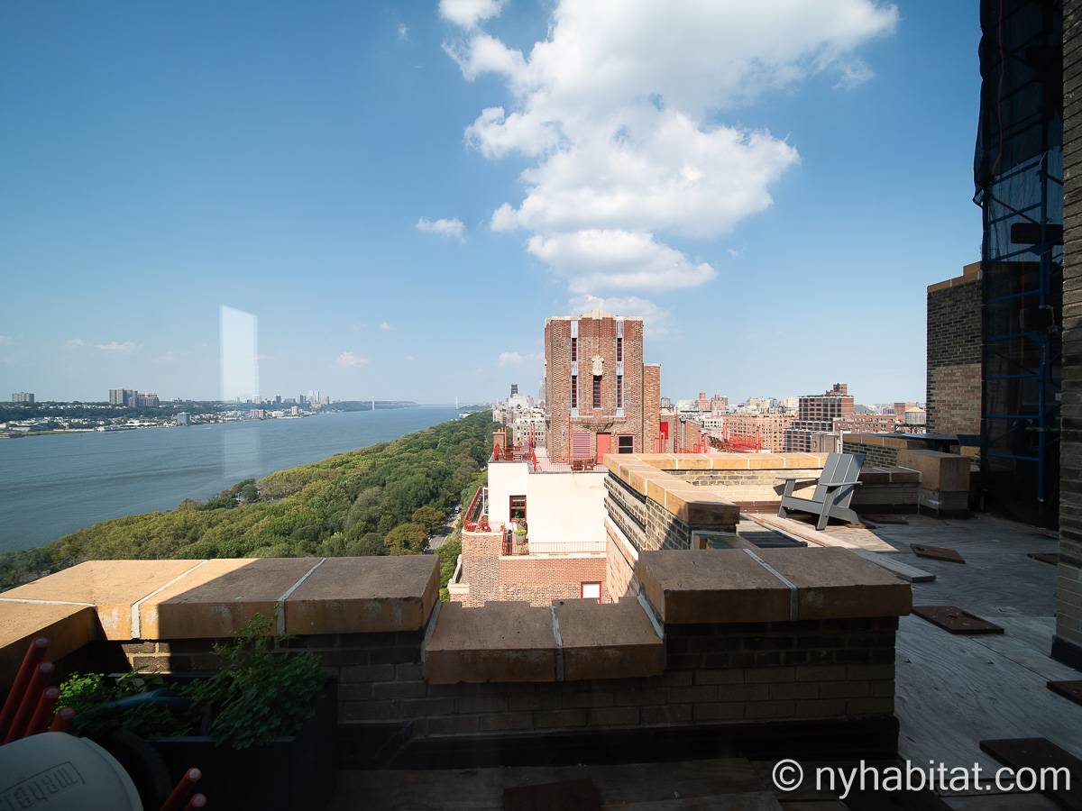 This furnished rental near the corner of Riverside Drive and 103rd Street sits on the 21st floor (equivalent to 20th floor in Europe), and includes a living room and kitchen. With windows overlooking the streets of Manhattan and the Hudson River, the living room comes with a sofa, dining area, and air conditioning. The open kitchen has a refrigerator, freezer, dishwasher, and coffee machine as well as a stainless-steel oven, microwave, dishwasher, and toaster.