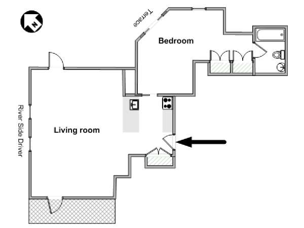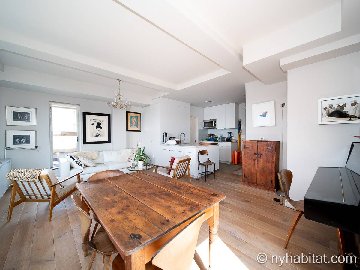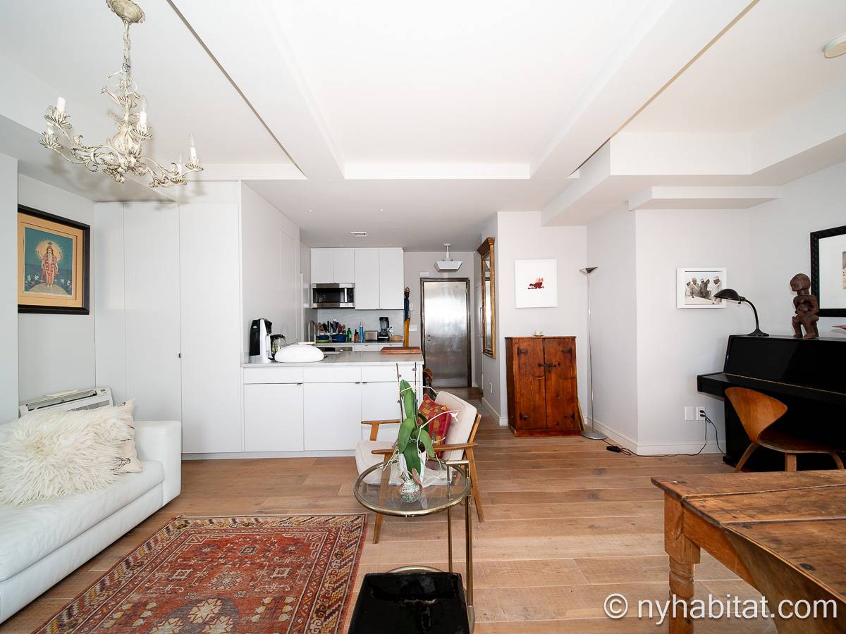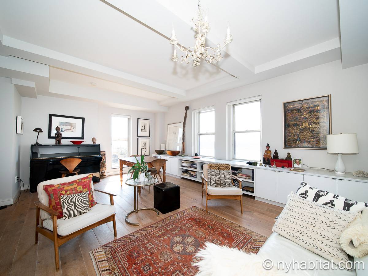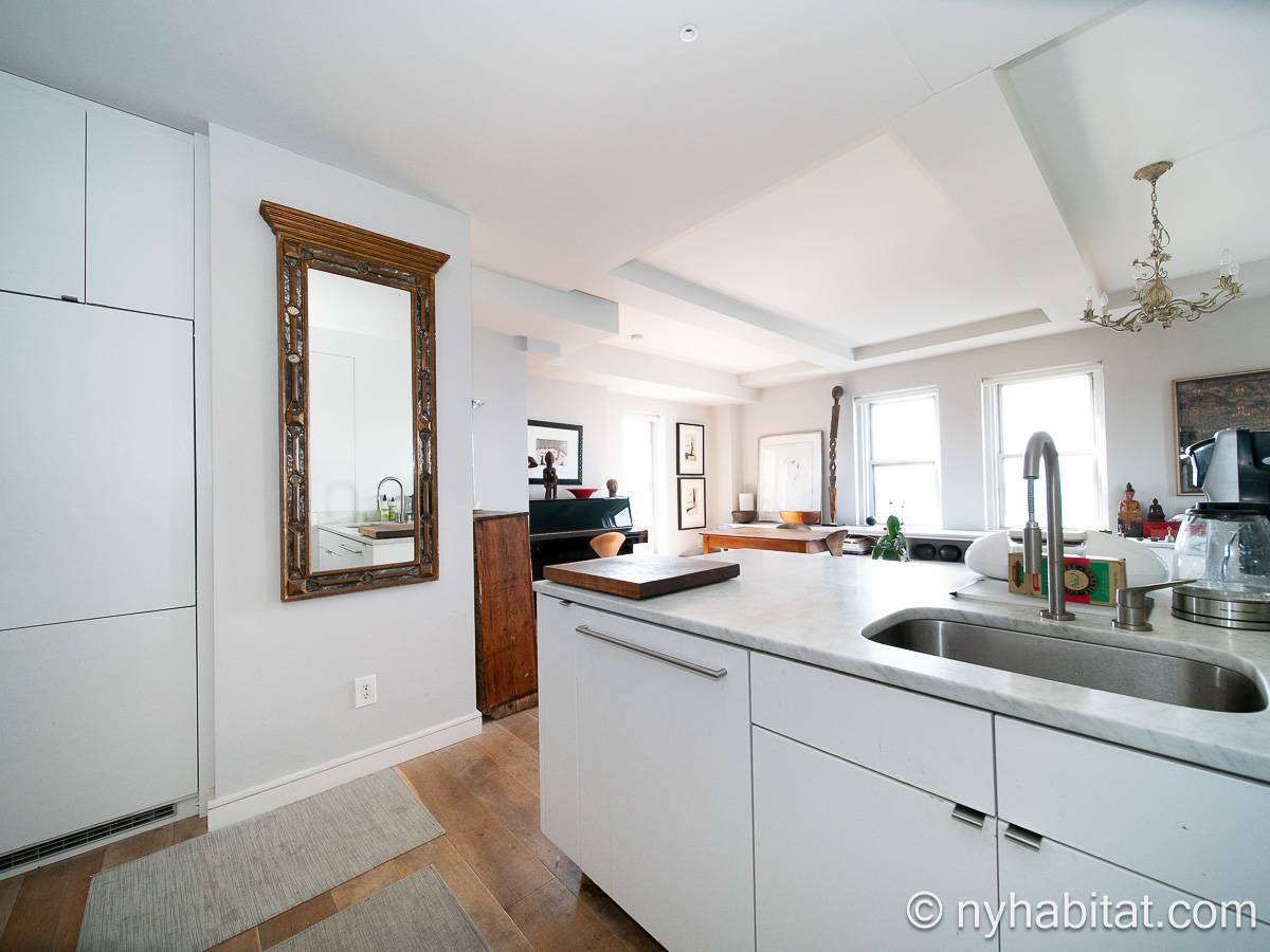 This furnished rental near the corner of Riverside Drive and 103rd Street sits on the 21st floor (equivalent to 20th floor in Europe), and includes a living room and kitchen. With windows overlooking the streets of Manhattan and the Hudson River, the living room comes with a sofa, dining area, and air conditioning. The open kitchen has a refrigerator, freezer, dishwasher, and coffee machine as well as a stainless-steel oven, microwave, dishwasher, and toaster.