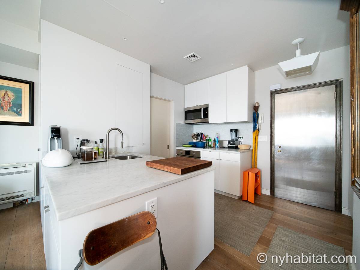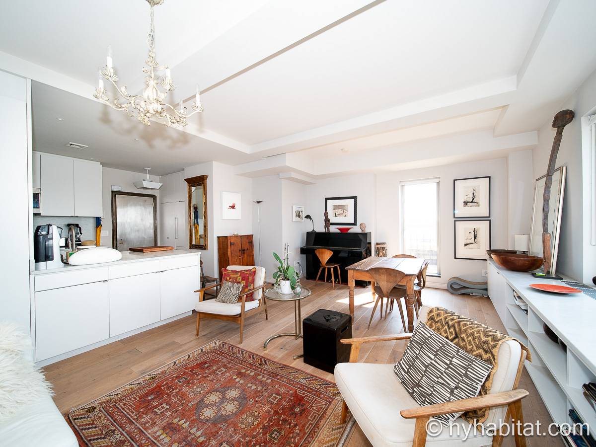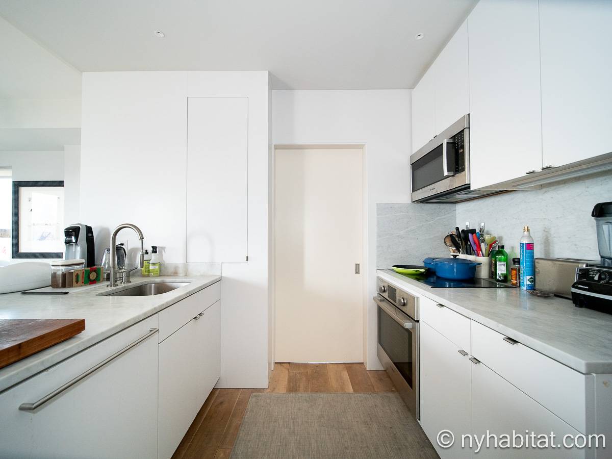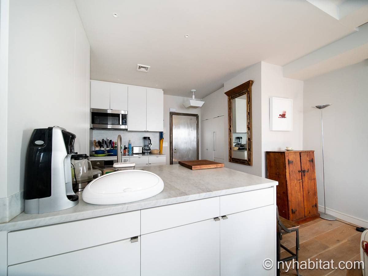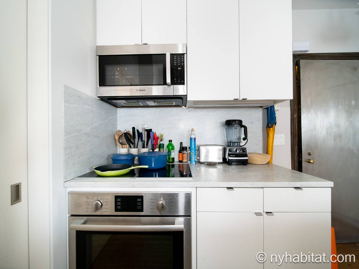 This furnished rental near the corner of Riverside Drive and 103rd Street sits on the 21st floor (equivalent to 20th floor in Europe), and includes a living room and kitchen. With windows overlooking the streets of Manhattan and the Hudson River, the living room comes with a sofa, dining area, and air conditioning. The open kitchen has a refrigerator, freezer, dishwasher, and coffee machine as well as a stainless-steel oven, microwave, dishwasher, and toaster.