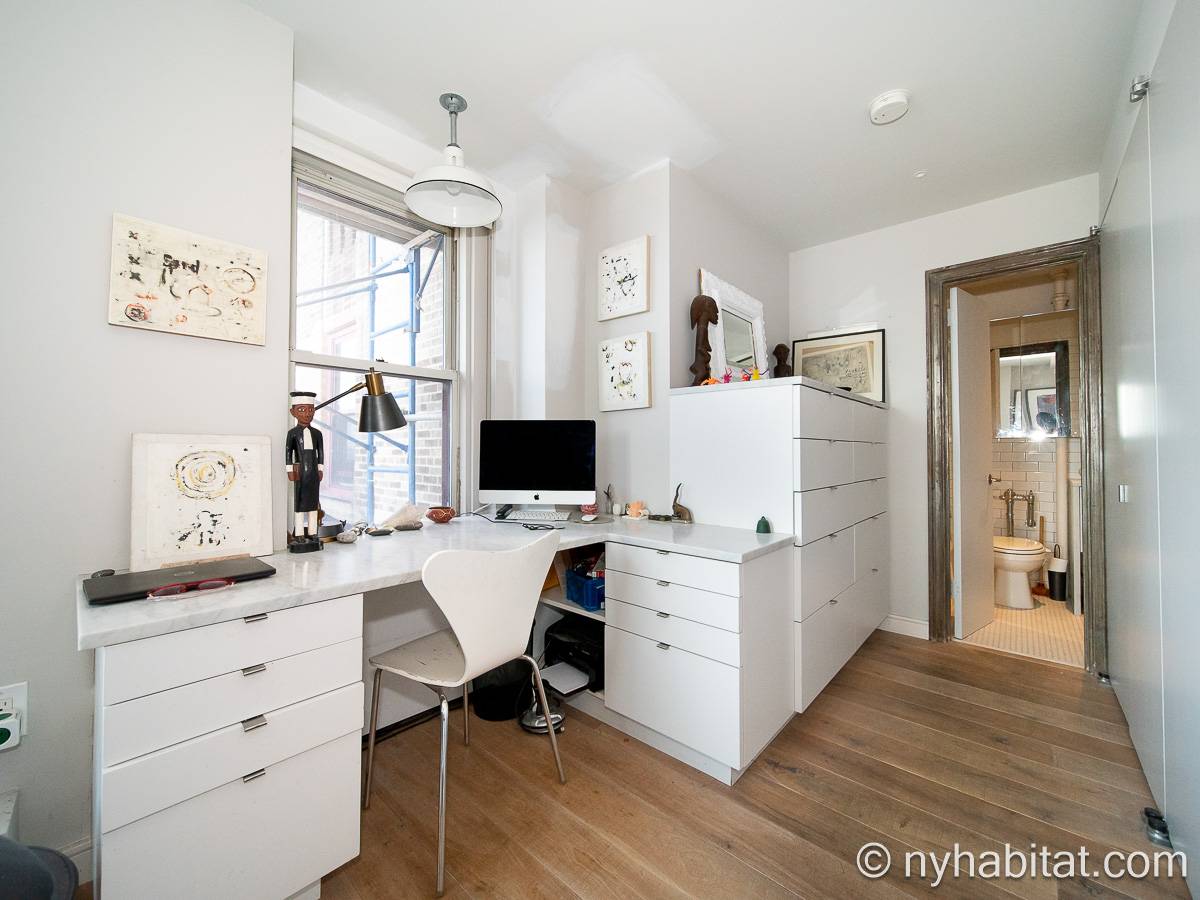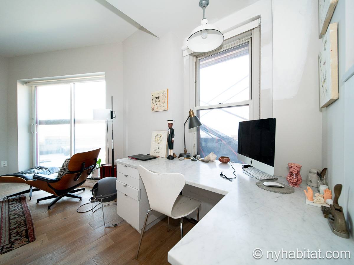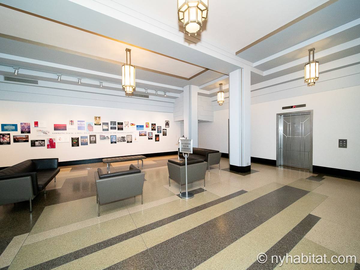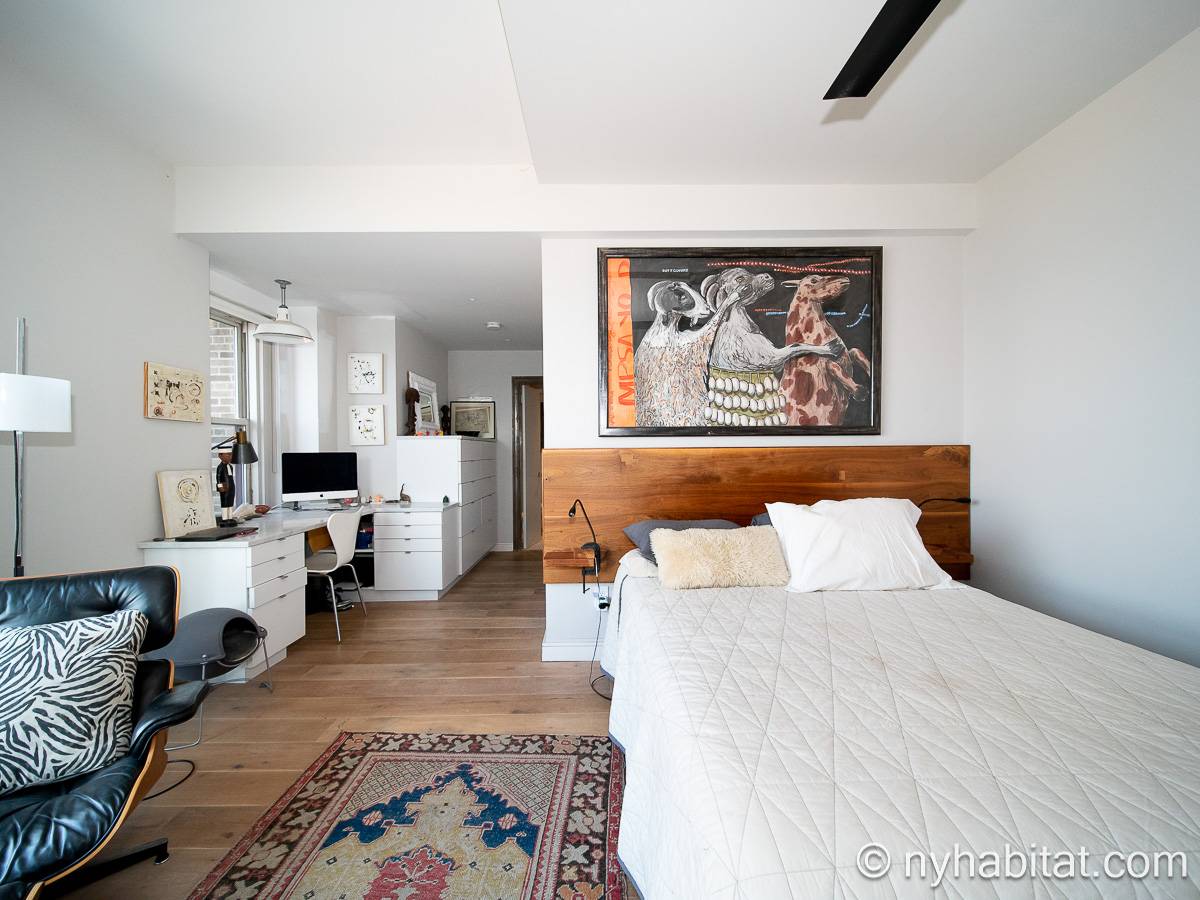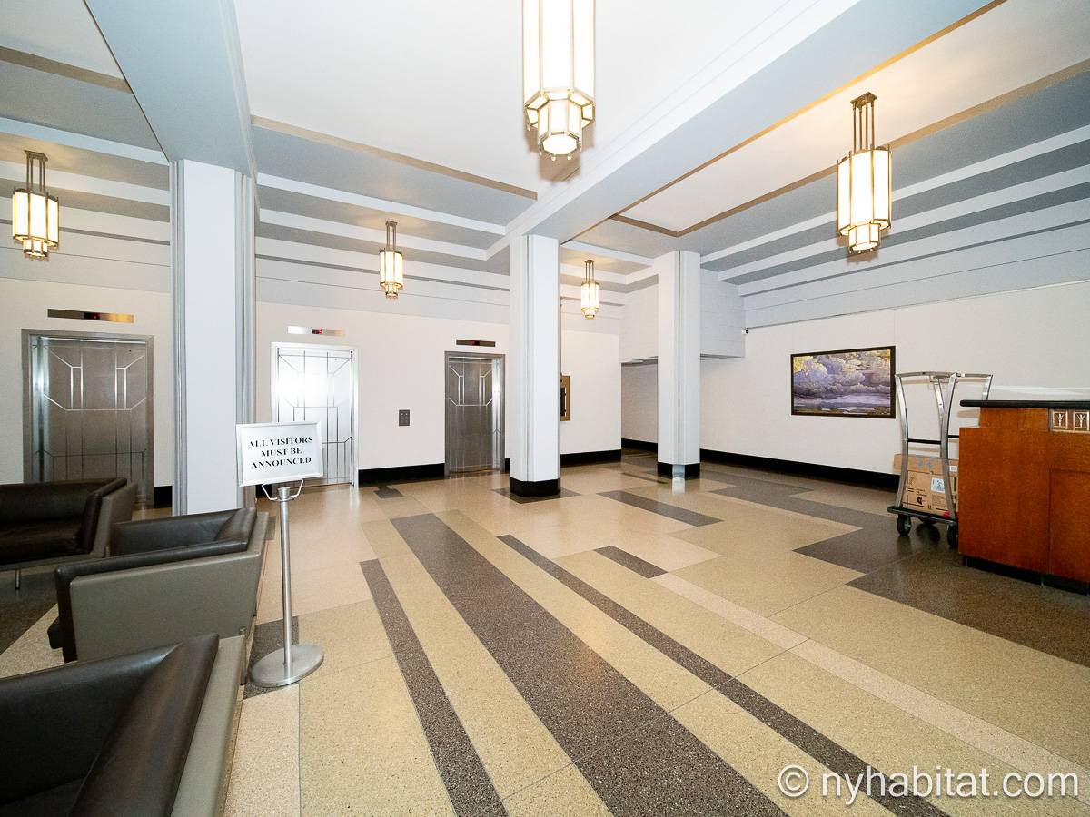 This furnished rental near the corner of Riverside Drive and 103rd Street sits on the 21st floor (equivalent to 20th floor in Europe), and includes a living room and kitchen. With windows overlooking the streets of Manhattan and the Hudson River, the living room comes with a sofa, dining area, and air conditioning. The open kitchen has a refrigerator, freezer, dishwasher, and coffee machine as well as a stainless-steel oven, microwave, dishwasher, and toaster.