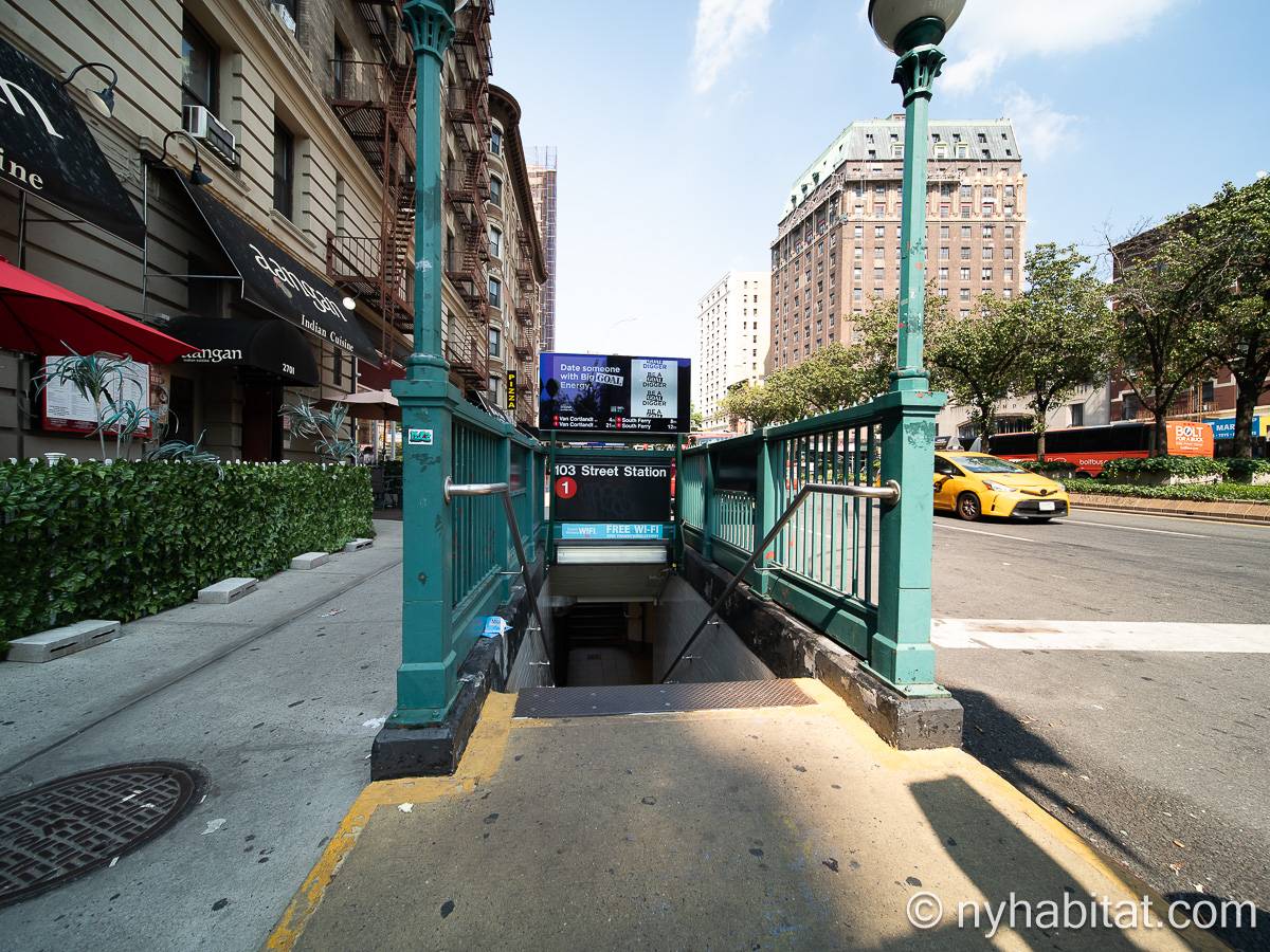 The 103rd Street and Broadway subway station is 0.2 miles (around 300 meters) from the apartment and runs the 1 line.