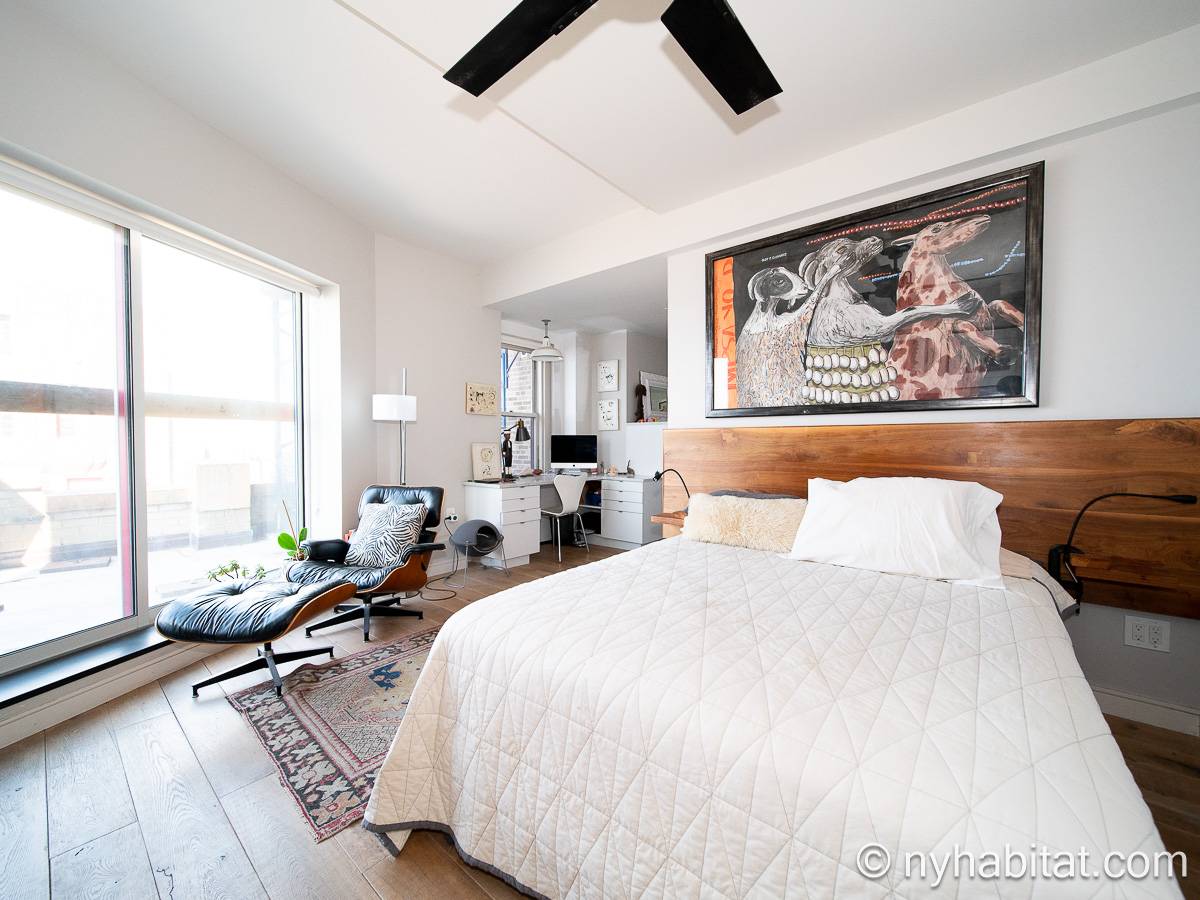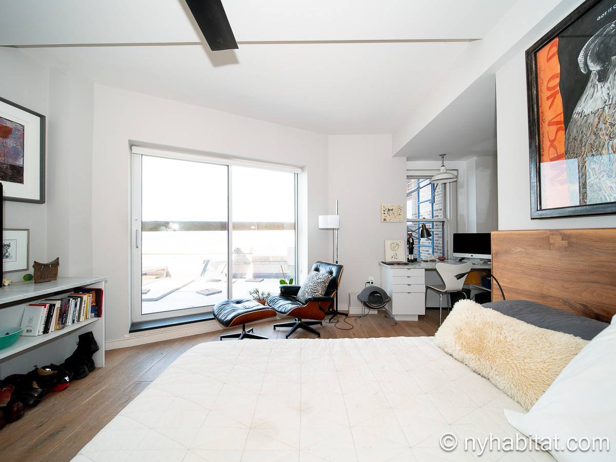 The natural lighting from a large window highlights the queen-size bed in the bedroom, which also includes a television and air conditioning. The glass door leads to a terrace. The white tile bathroom includes a shower with a built-in bathtub and under sink storage. The building has an elevator and a doorman as well as laundry facilities.