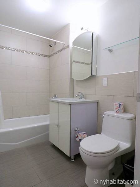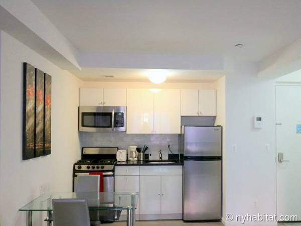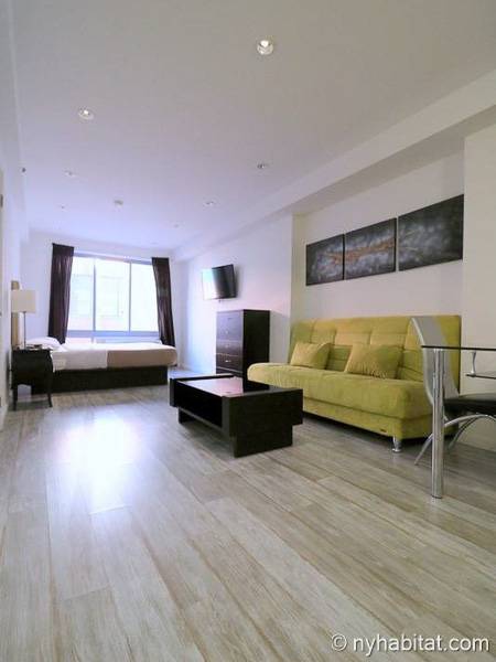 This Manhattan furnished rental located near the corner of West 48th Street and 10th Avenue sits on the fifth floor (equivalent to fourth floor in Europe). The living room and kitchen share a space which includes a sofa, television, air conditioning, dining area, and a double-size bed. The room has a large window. The kitchen appliances include a coffee machine, toaster, as well as a stainless-steel refrigerator, freezer, oven, and microwave. The bathroom has a shower with a built-in bathtub and under sink storage. There is a laundry facility and an elevator in the building.