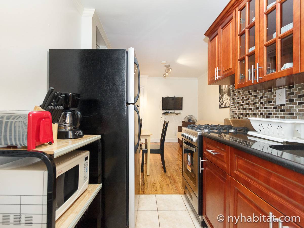 Contrasting colors in the contemporary furnishings are featured in this one bedroom apartment. Black and white photos of New York City are hung in the living room. A dining table with black chairs and a queen sized futon offer seating spaces. The mounted TV can be seen from the open kitchen while preparing your own meals. Stainless steel appliances, multicolored backsplash, and modern cabinetry all work together for a design that is functional. The bathroom is accessible from the kitchen with sliding glass shower doors, WC, and window. The bedroom occupies about 72 square feet of this apartment (approx. 6.7 sqm). It is furnished with a double sized bed, window overlooking the courtyard, and a standing dresser.