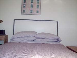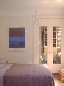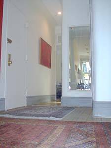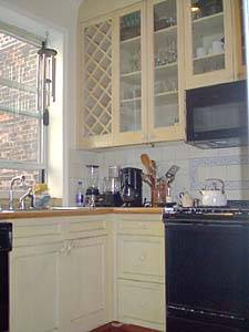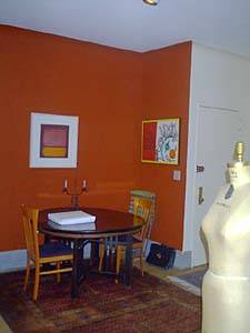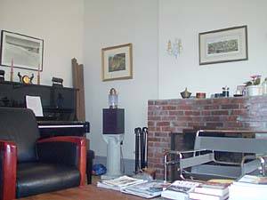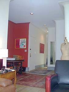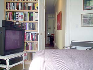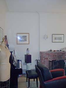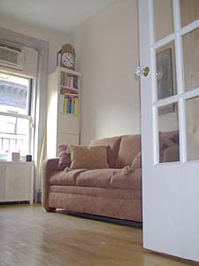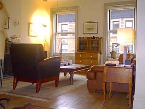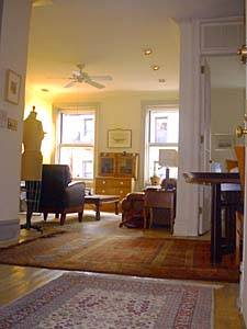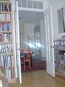 The living room has a large working fireplace, a fine upright piano, Oriental carpeting, a coffee table, and a leather sofa and chairs comfortably seating six. Two windows face the street, with full sun and sky views from morning till night (the building across the street is the same height). There is a superb stereo system, including a CD player and cassette deck, as well as a library containing more than six hundred CD's ranging from classical to pop to jazz as well as dozens of film scores. The living room also contains a fax machine.