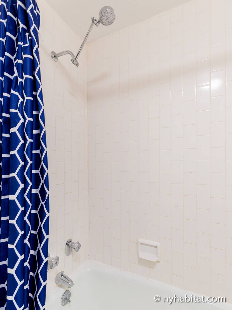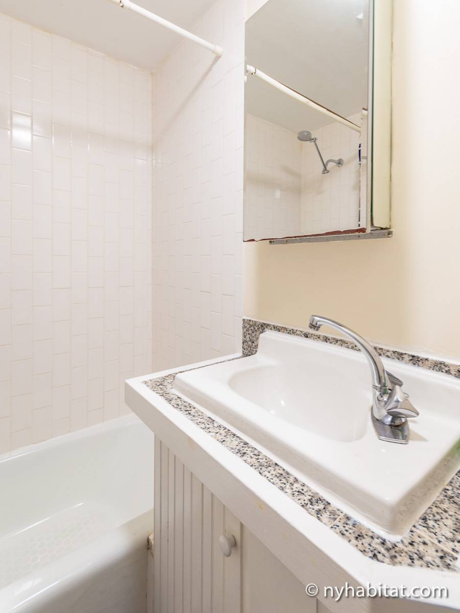 The bathroom is located off of the main hallway near the front entrance of the apartment. The bathroom has a full bathtub with a shower and a cabinet under the sink. There is a large linen closet adjacent to the bathroom.