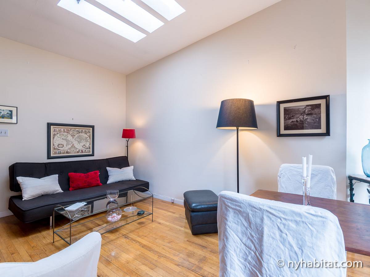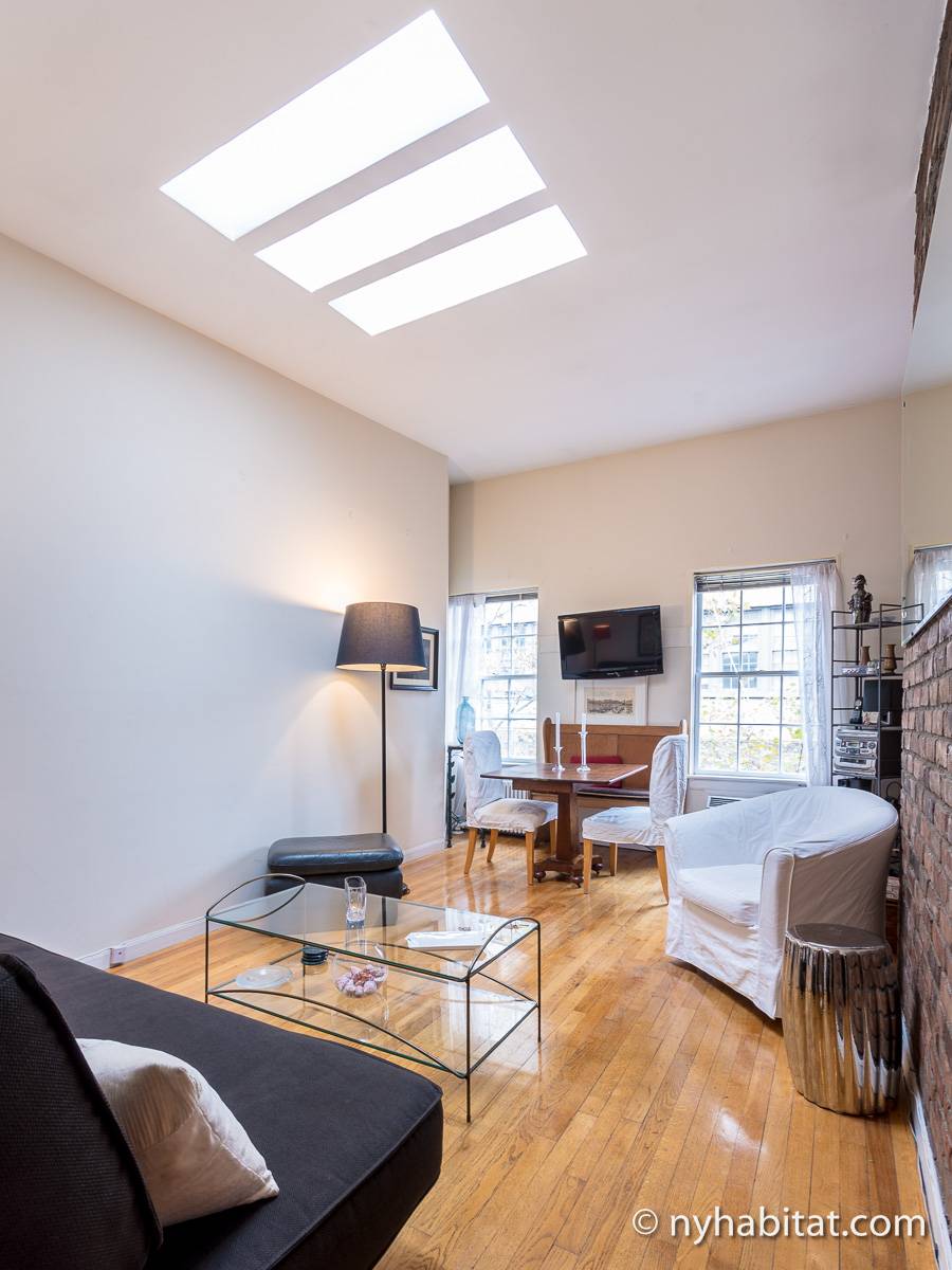 The livingroom has two large windows that face south. There is also a large skylight. The space is sunny and roomy. There is a small dining table with chairs near the windows. There is also a comfortable queen sized sofabed. The apartment comes equipped with a flat screen TV mounted on the wall.