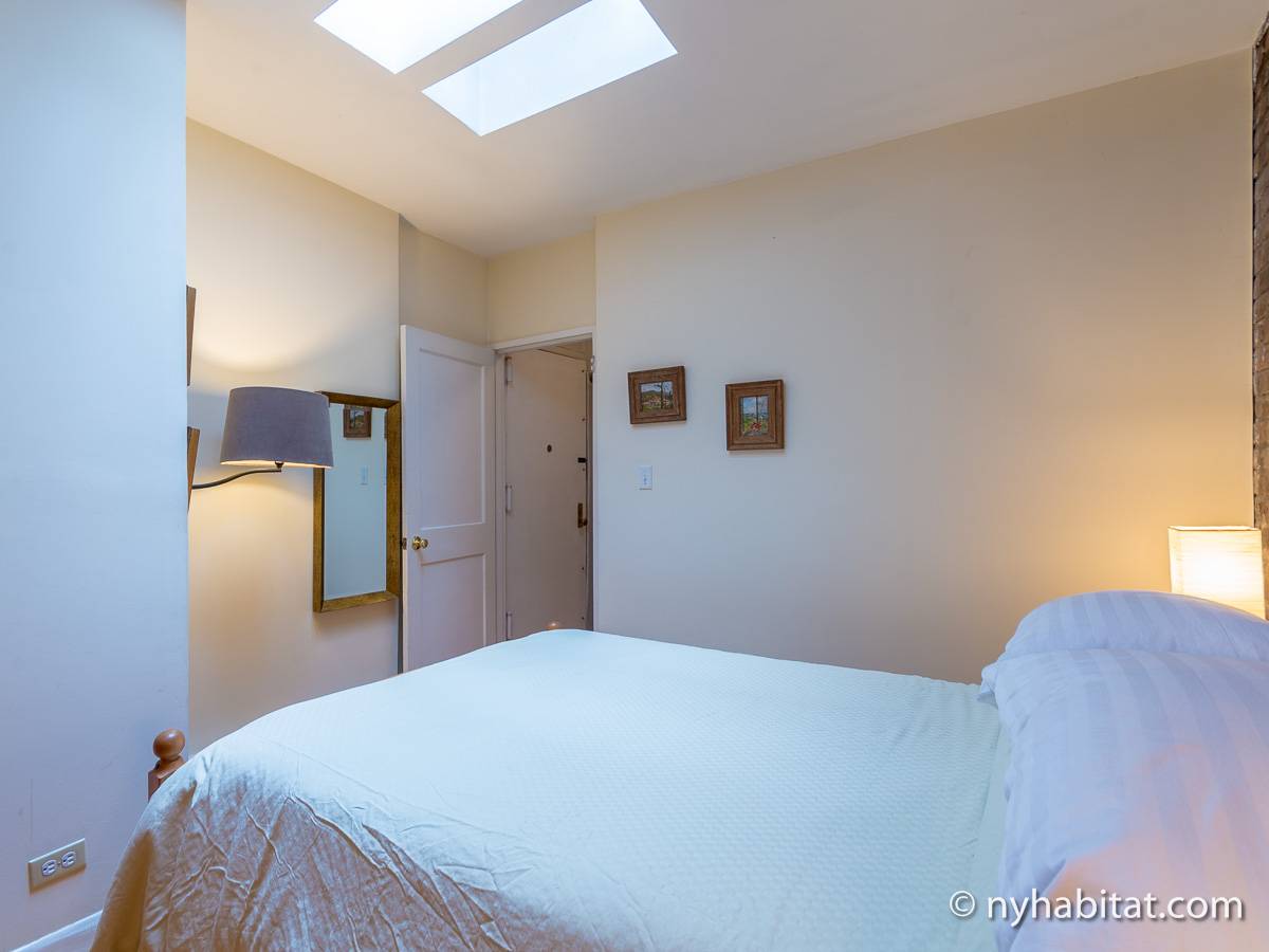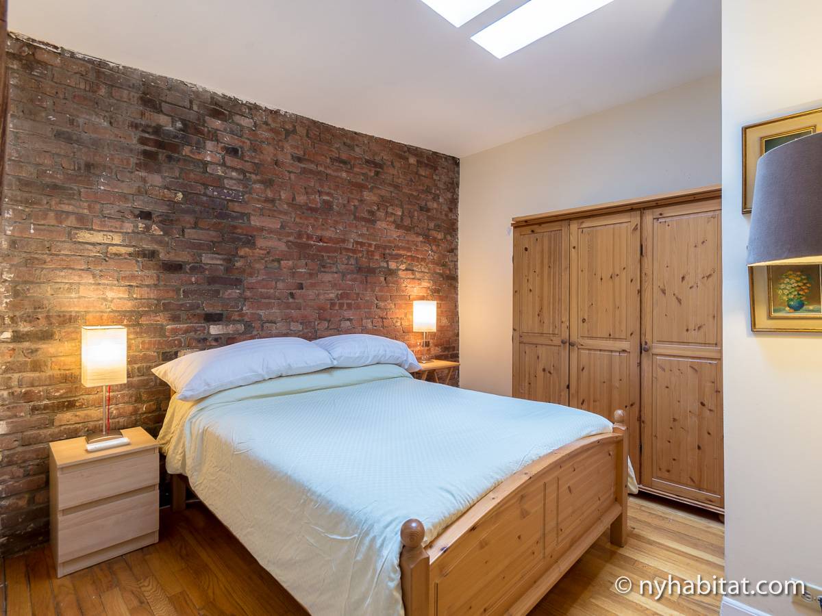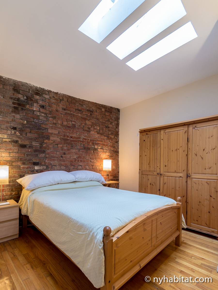 The apartment has hardwood floors throughout the space and many exposed brick walls. The atmosphere is cozy and warm. The bedroom is located on the right of the entrance hallway upon entering the apartment. The bedroom has a large skylight that lets in beautiful natural light. The room is furnished with an amoire and a full sized bed.