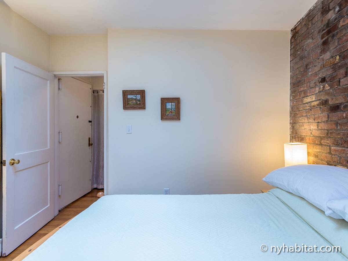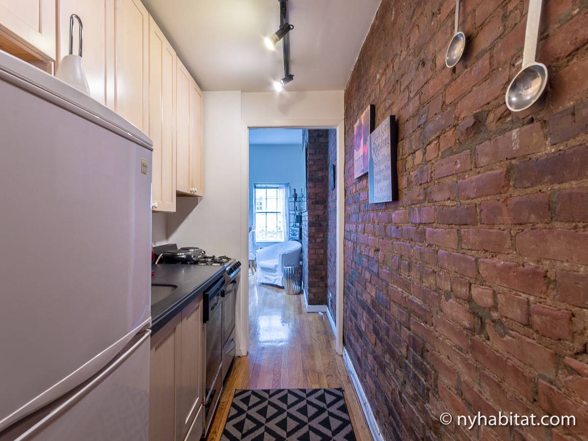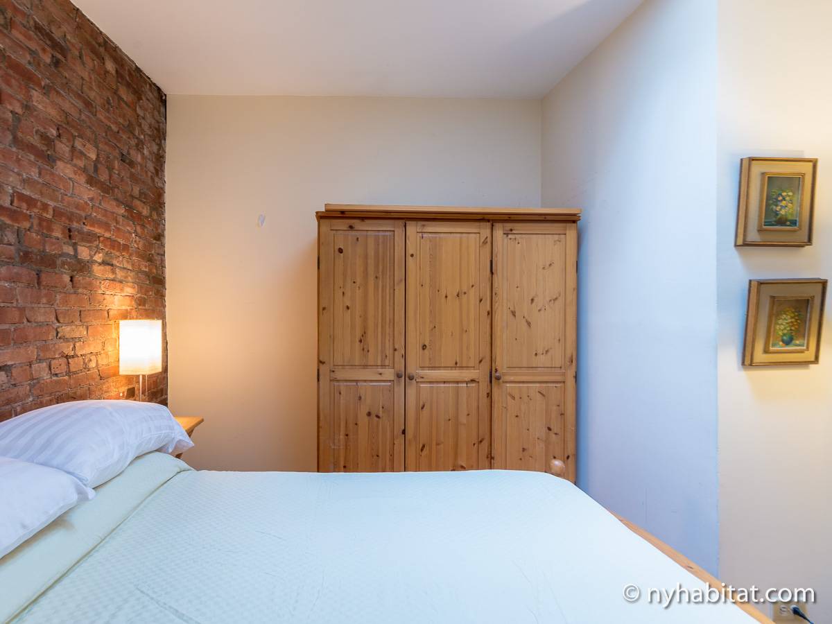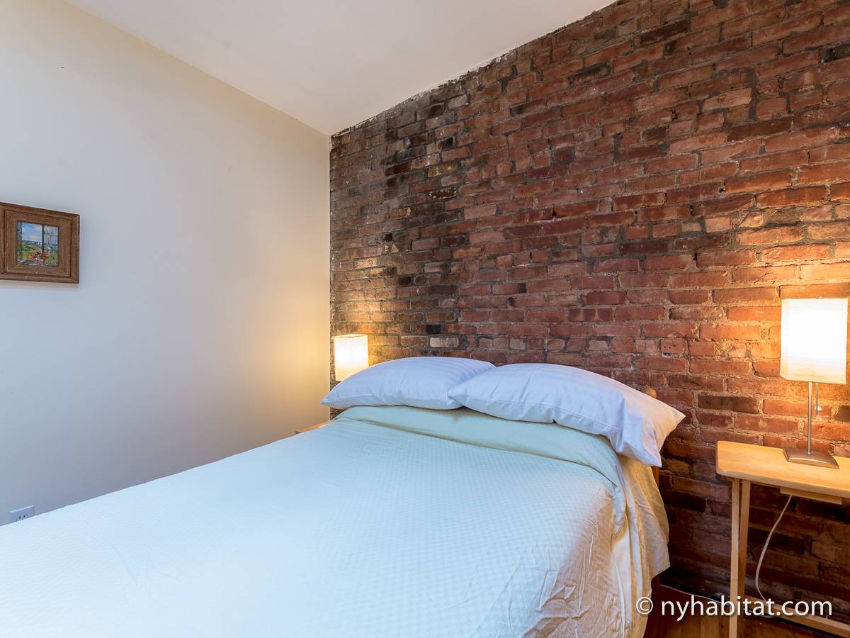 The apartment has hardwood floors throughout the space and many exposed brick walls. The atmosphere is cozy and warm. The bedroom is located on the right of the entrance hallway upon entering the apartment. The bedroom has a large skylight that lets in beautiful natural light. The room is furnished with an amoire and a full sized bed.