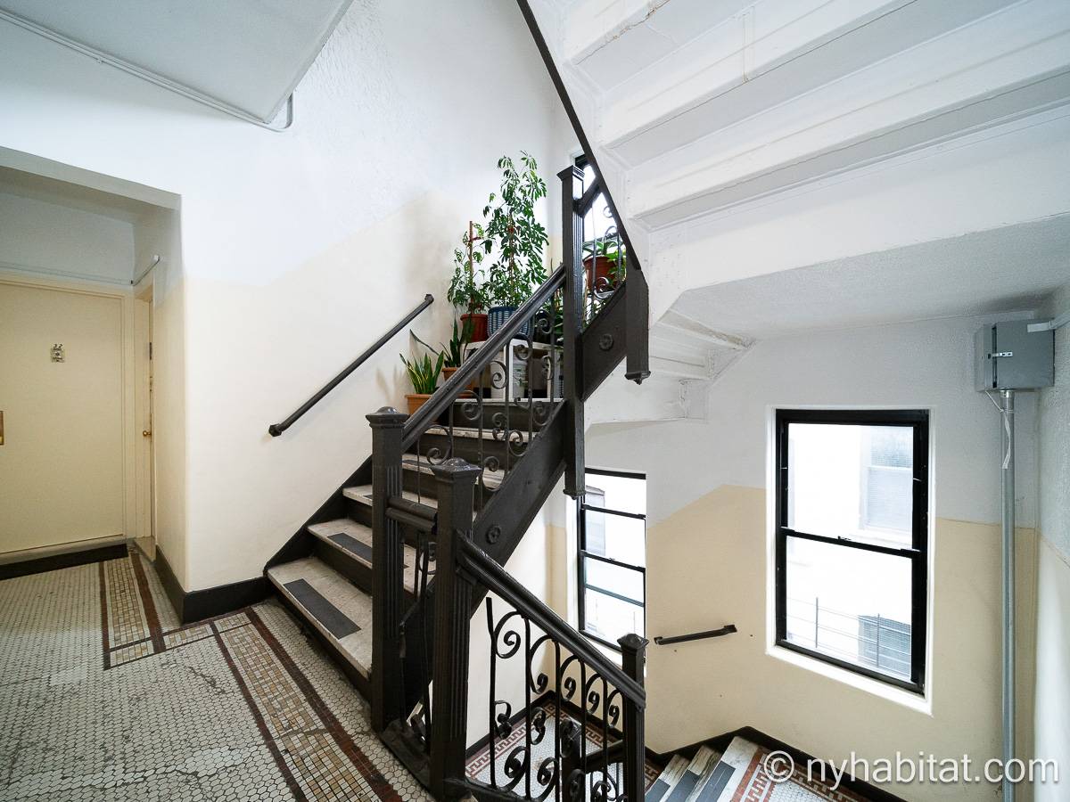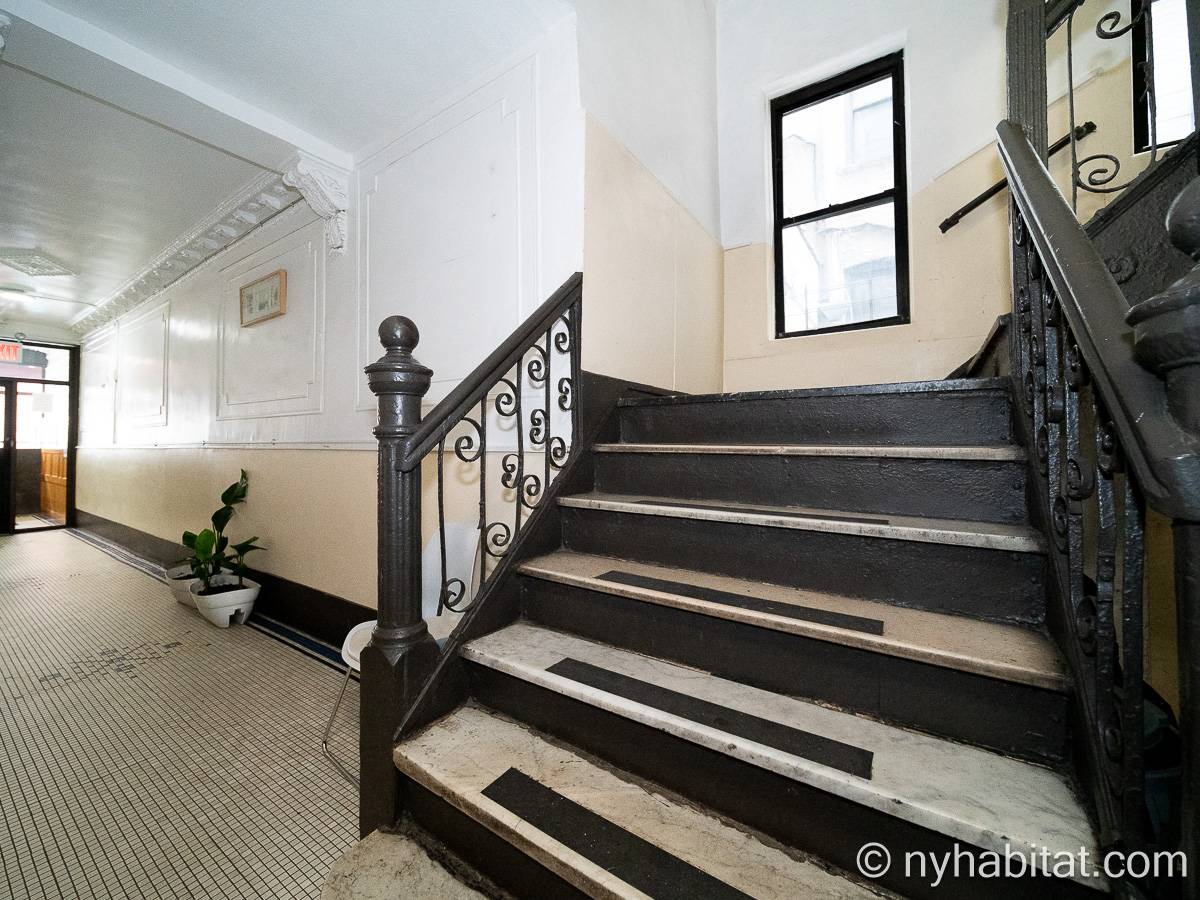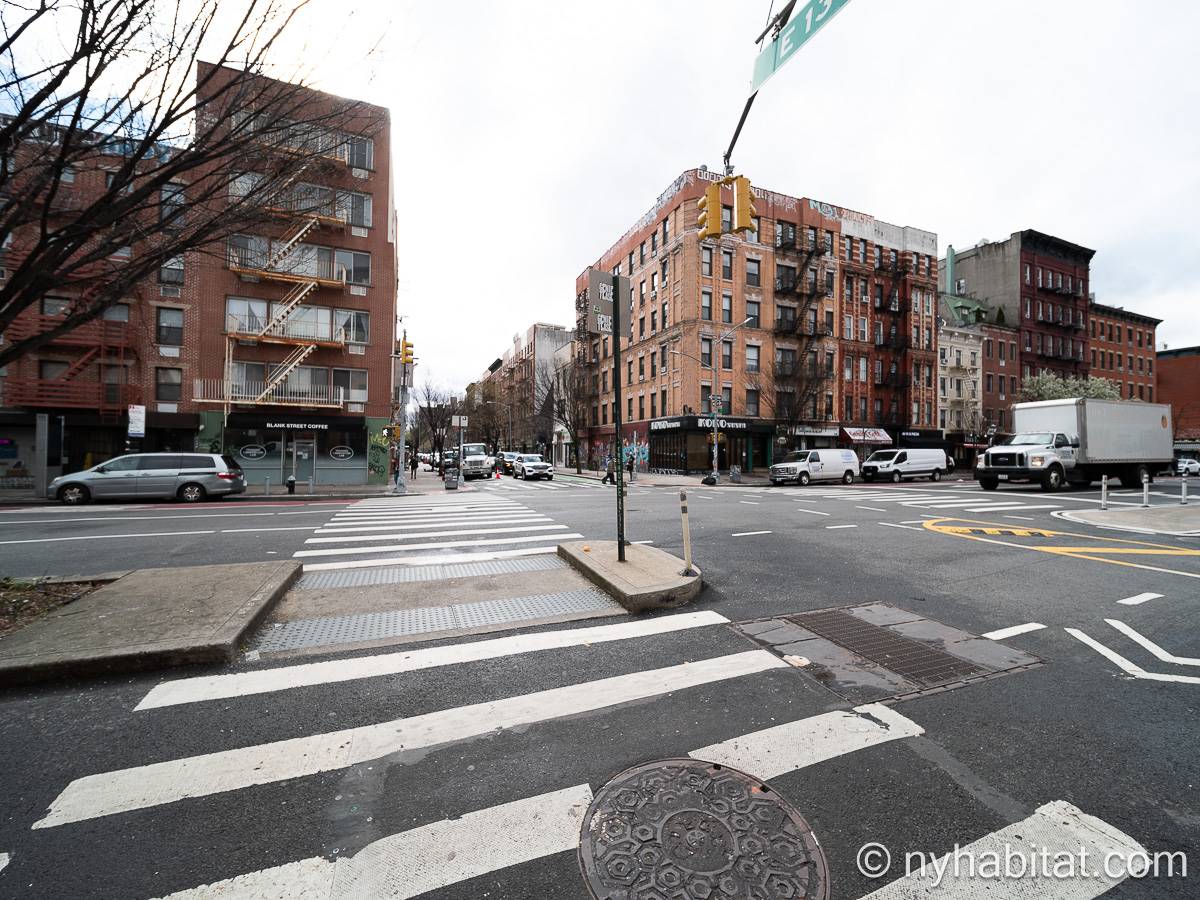 This one bedroom apartment is ideally located in the East Village in Lower Manhattan, New York, on 13th Street and 1st Avenue. The apartment is on the sixth floor (5th for Europeans) of a low-rise, prewar walk-up building. The building features a front door security system with double doors and a locked security gate.