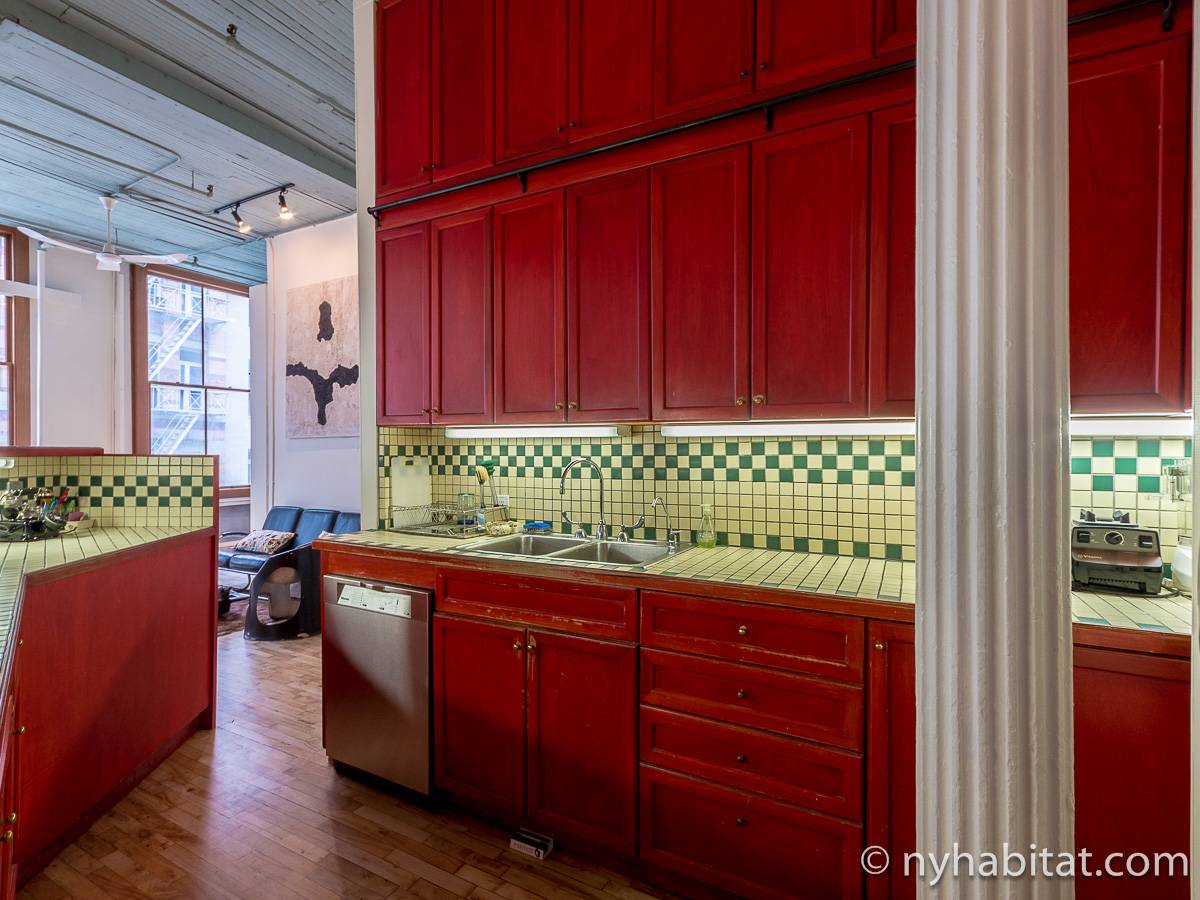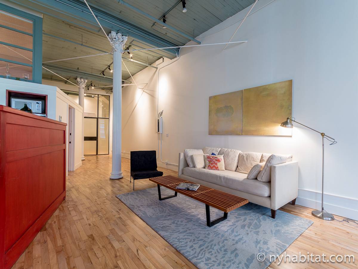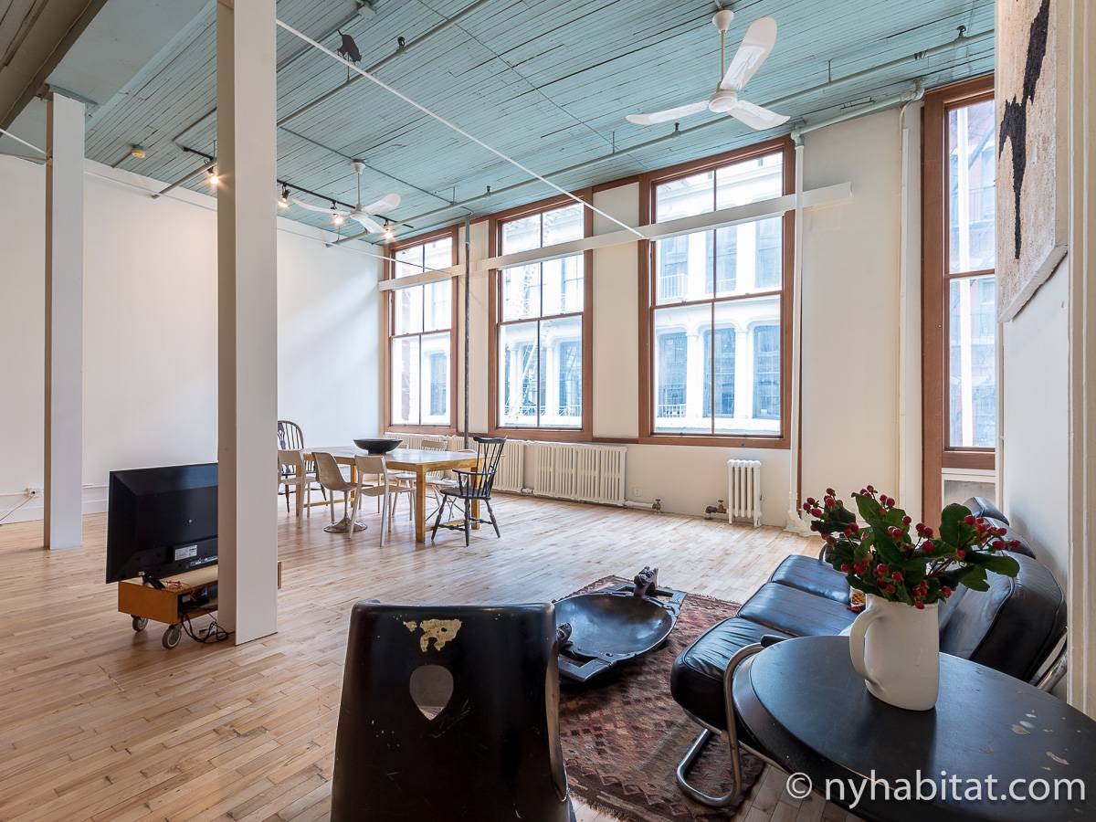 This fully furnished two-bedroom loft apartment is located in SoHo, a neighborhood in lower Manhattan, New York. The apartment is on the 2nd floor of a former industrial building, converted into a walk-up loft building. There is an intercom/buzzer system for guest entry.