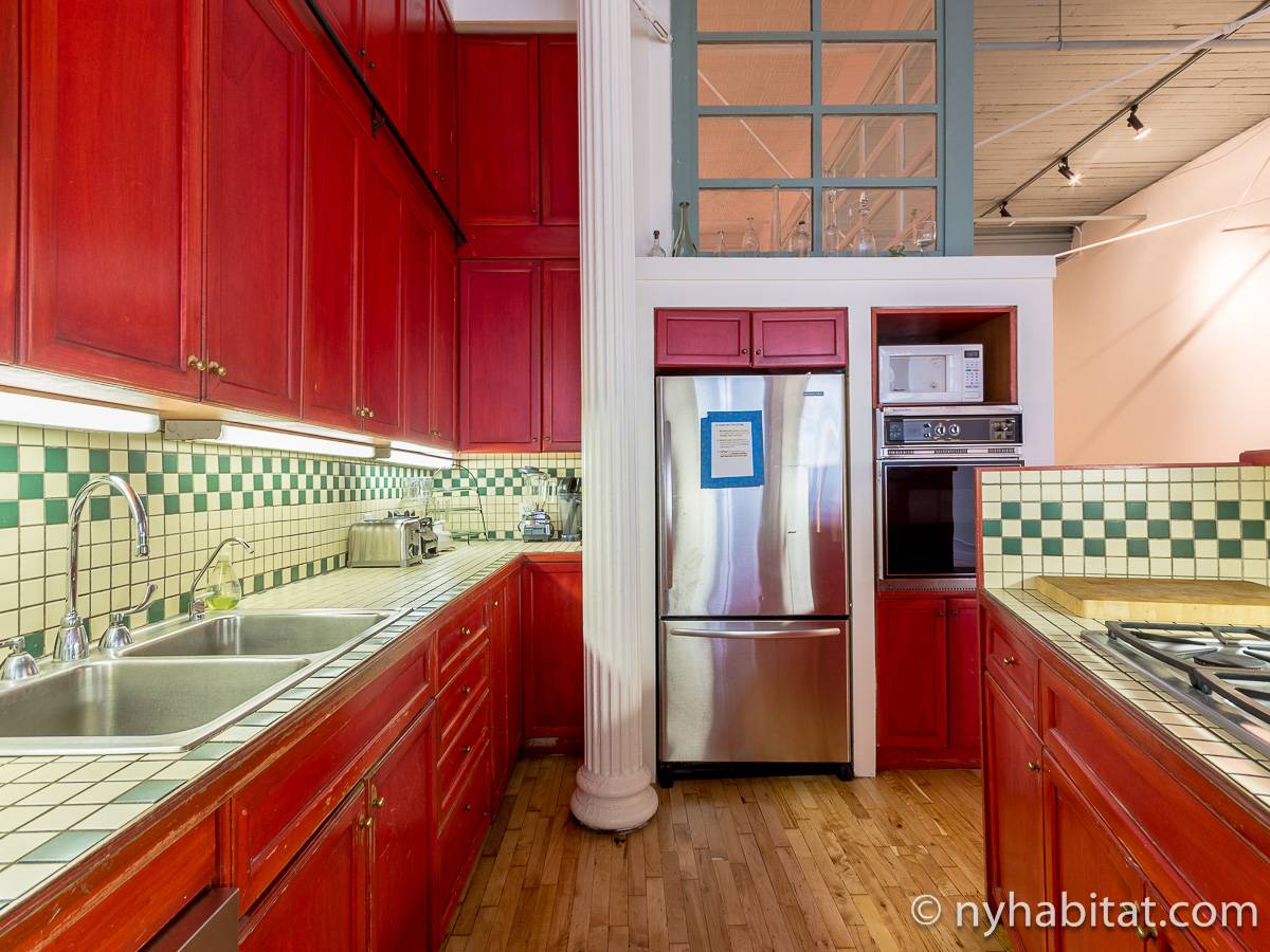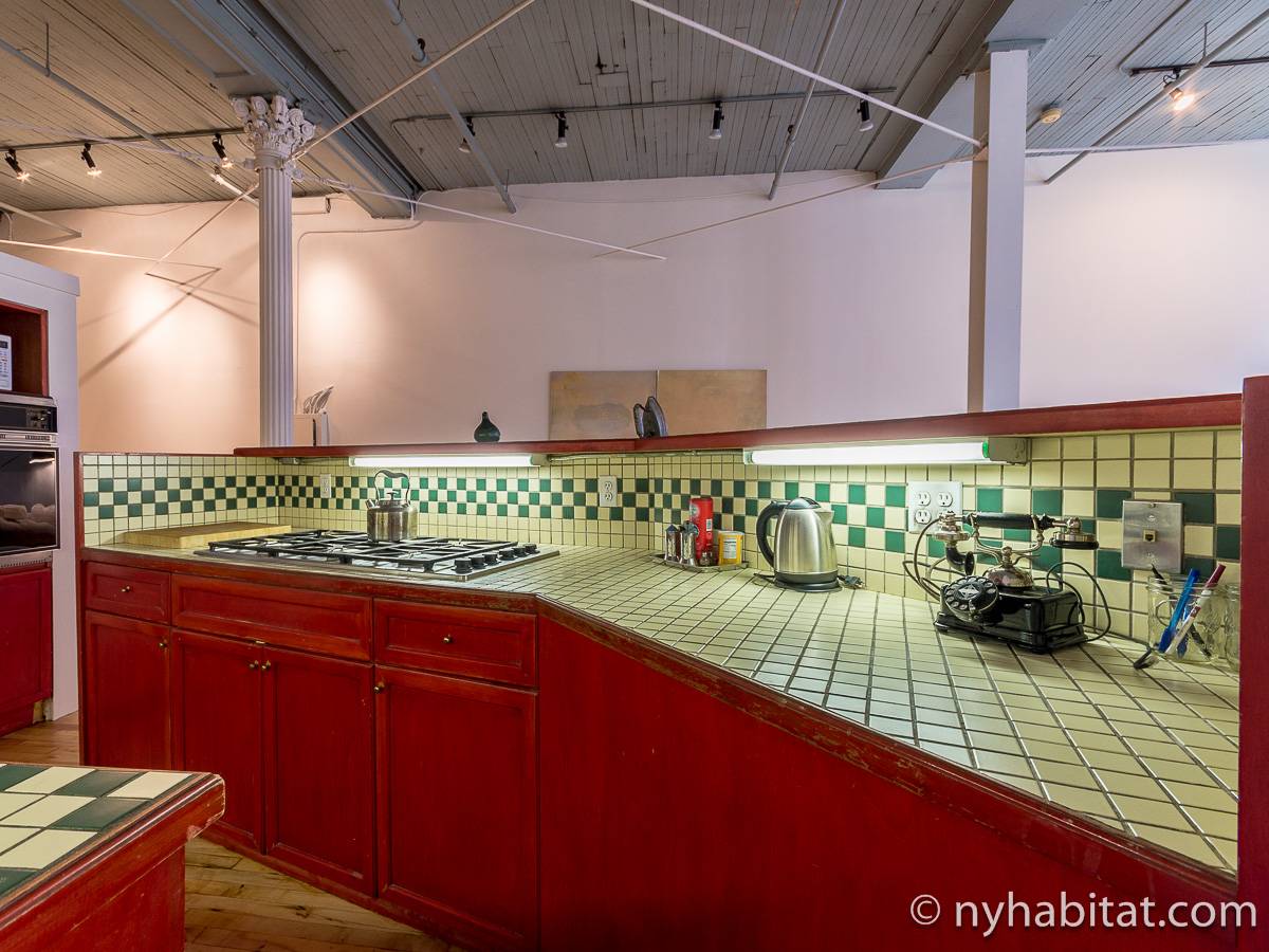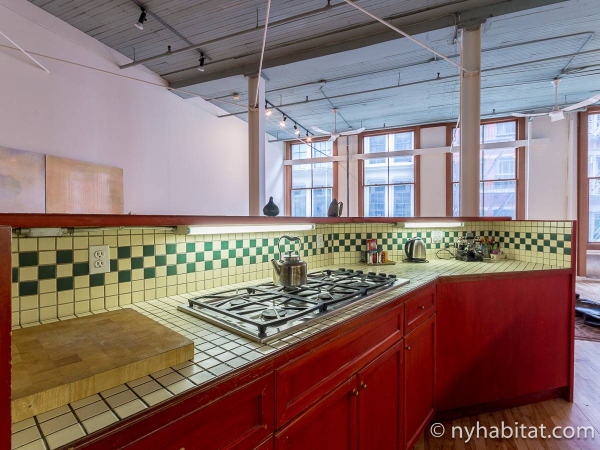 This fully furnished two-bedroom loft apartment is located in SoHo, a neighborhood in lower Manhattan, New York. The apartment is on the 2nd floor of a former industrial building, converted into a walk-up loft building. There is an intercom/buzzer system for guest entry.