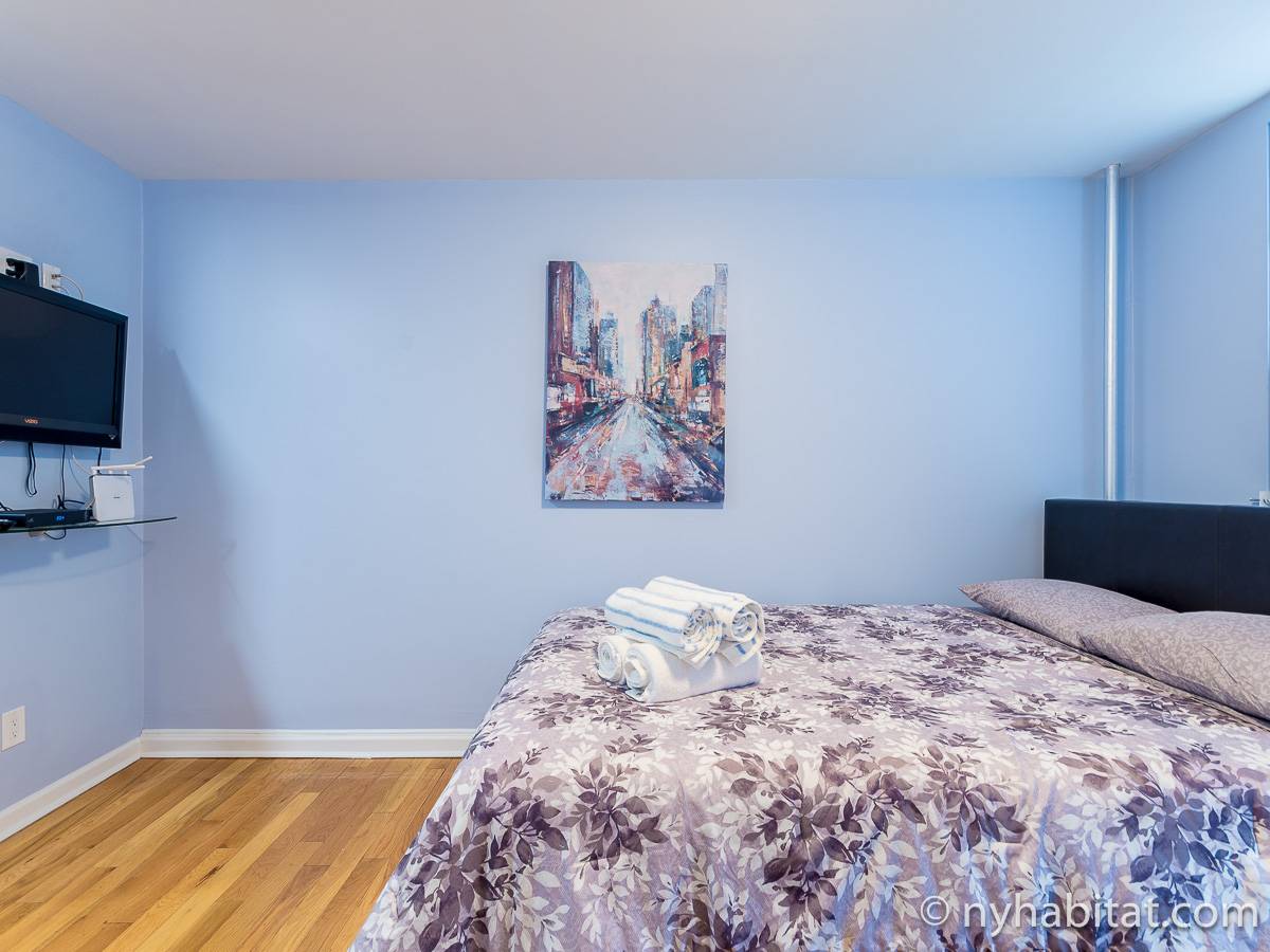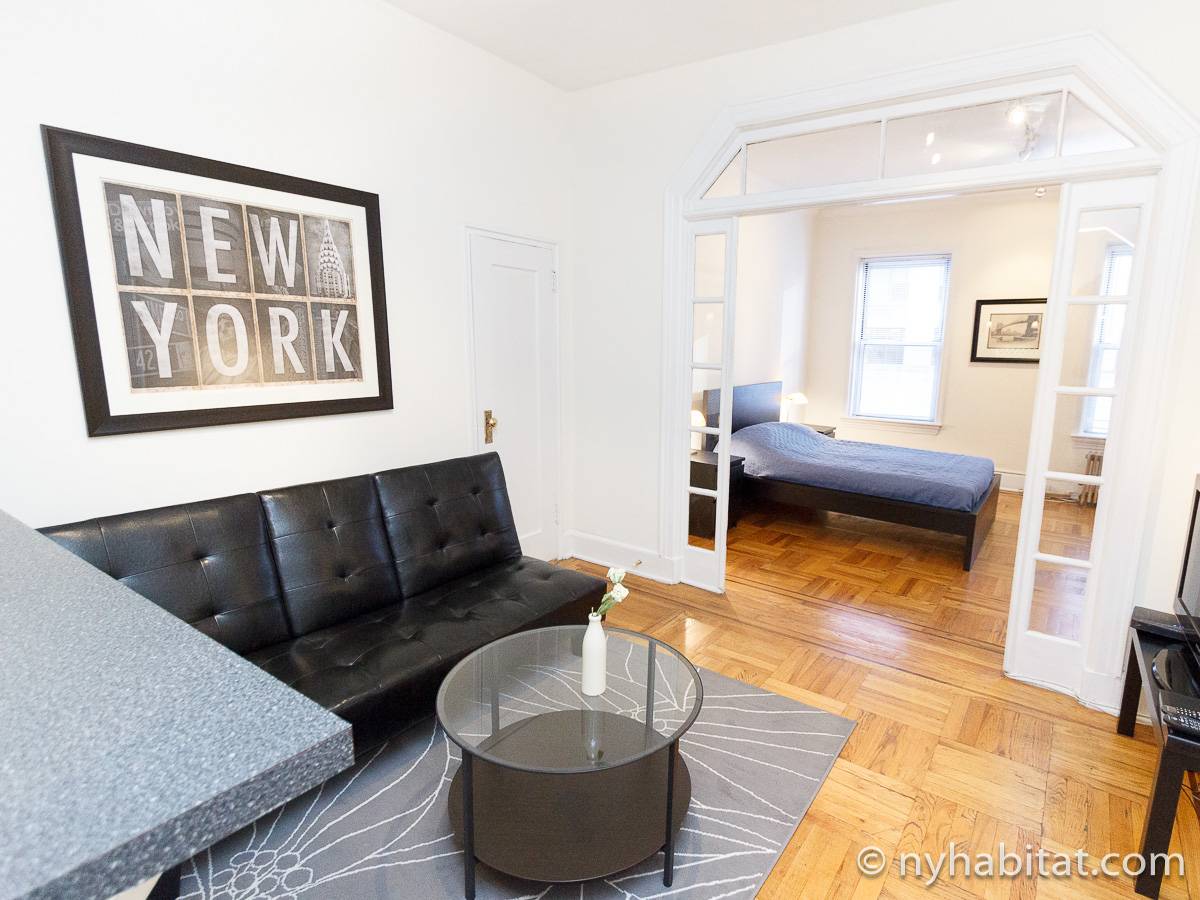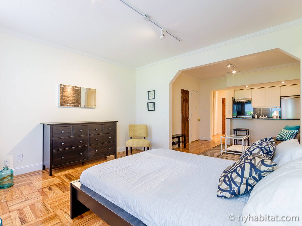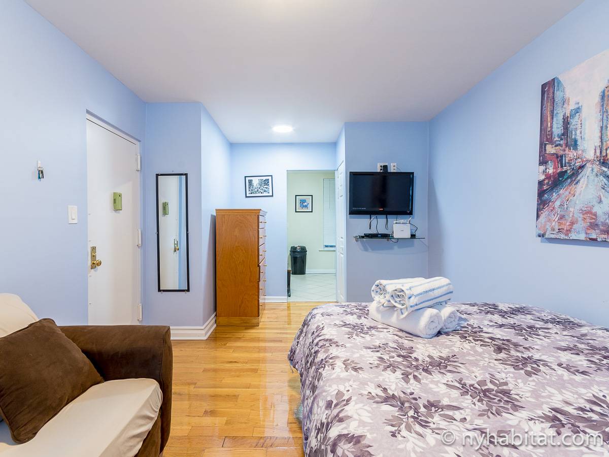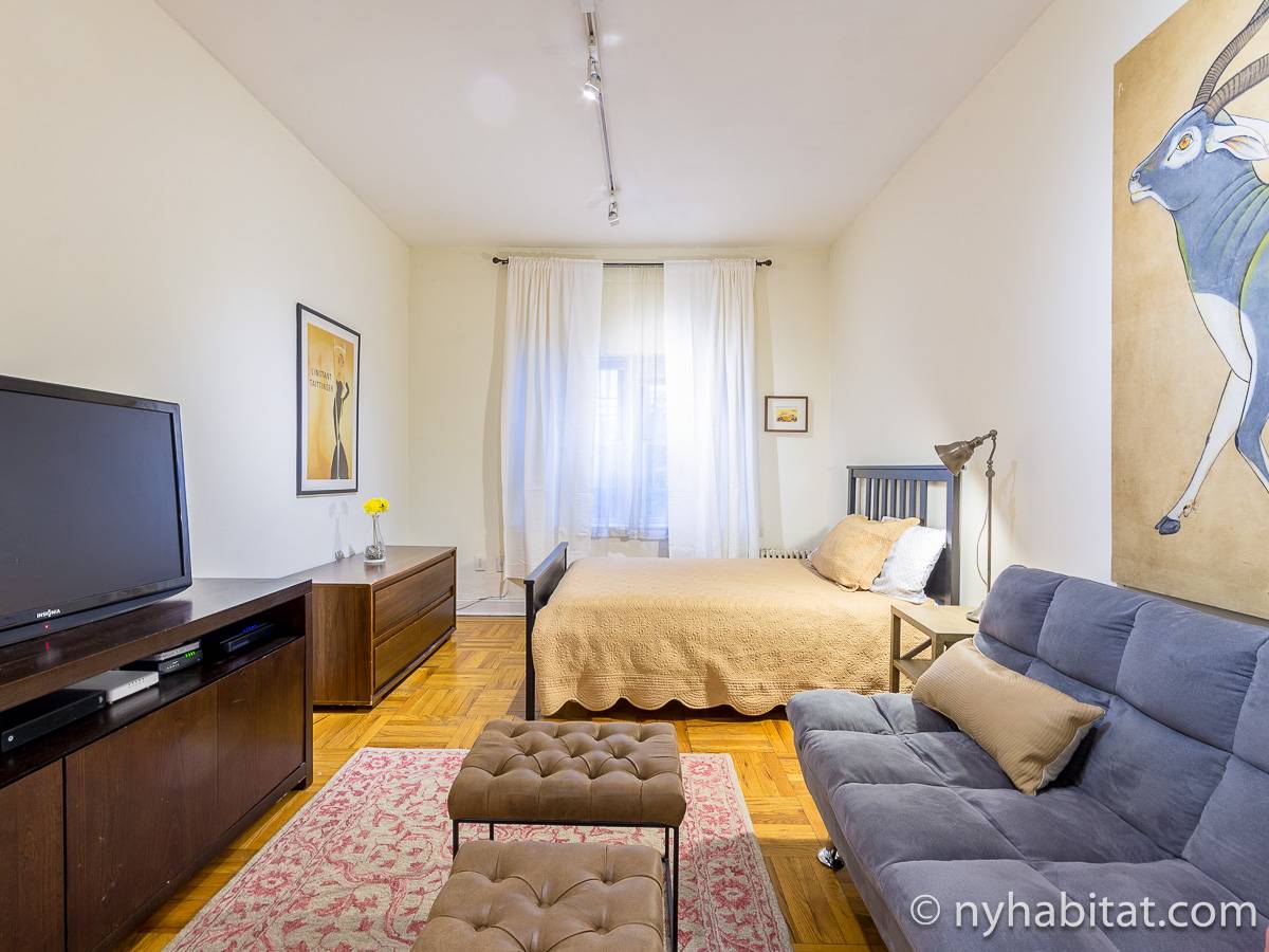Your studio is the perfect place to relax at the end of a busy day in New York. A double sized bed is great for sleeping and enjoying the entertainment center, which includes a flat screen television. Complimentary wireless internet is free for the duration of your stay, and the apartment features ample windows in both the living room and bathroom. The separate kitchen offers an excellent collection of appliances and everything you’ll need to cook. You’ll find the expected shower with bathtub and WC in the bathroom.
