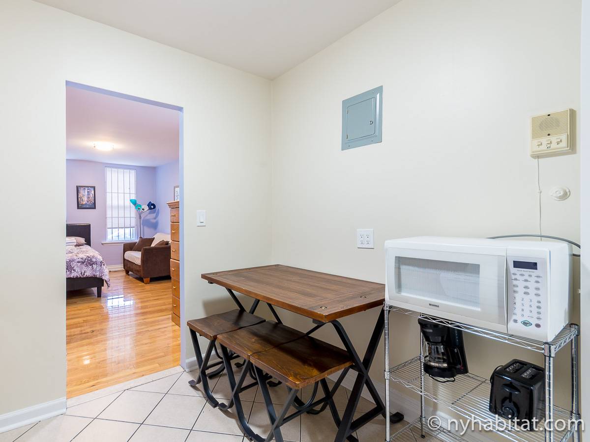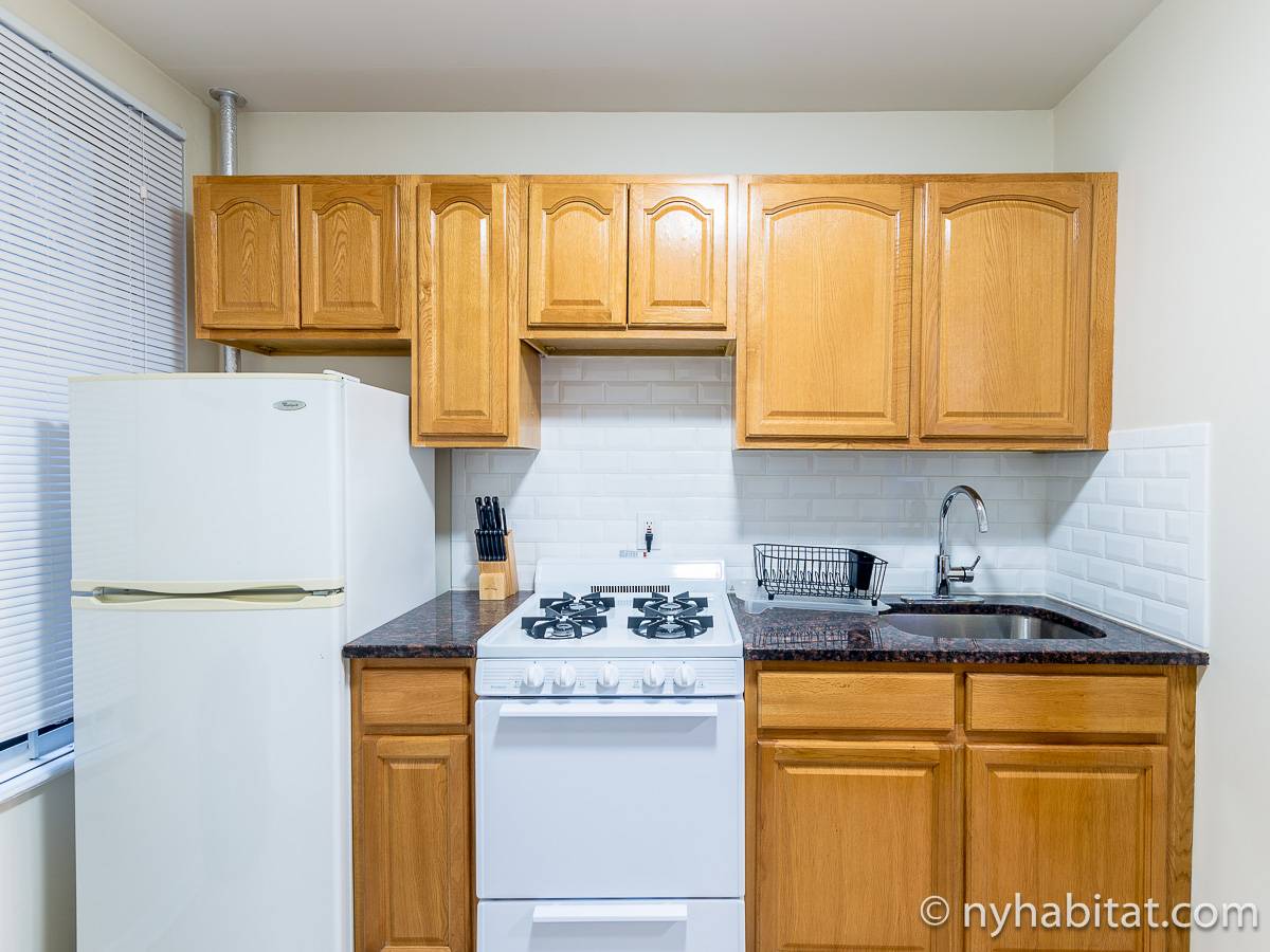 For those who need quick access to Manhattan, this studio apartment located at 48th Street & 43rd Avenue in Queens’ Sunnyside neighborhood is a good pick, and it is expertly furnished and ready for your visit to New York City. Your space is on the ground floor, so there are no inconvenient stairs to deal with. The building is pre-war, and a modern security system is provided, with a video surveillance system protecting the entrance to the building in addition to a buzzer and intercom.