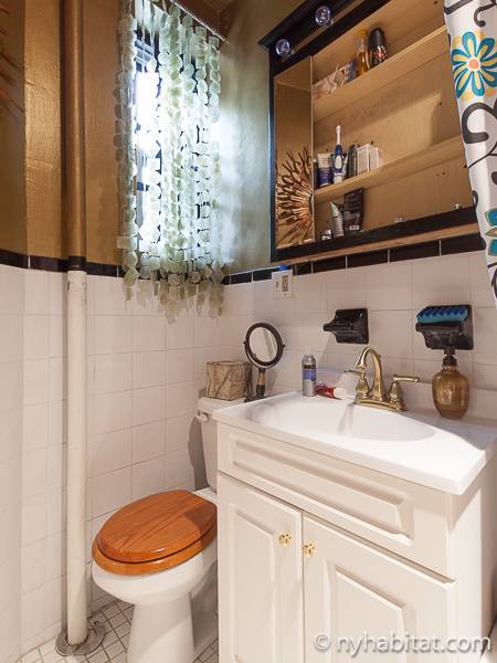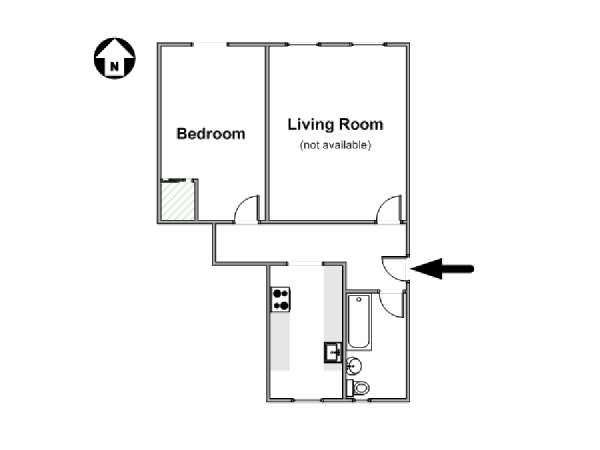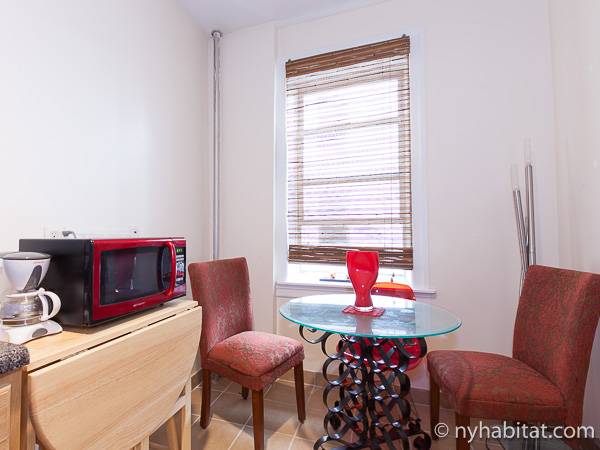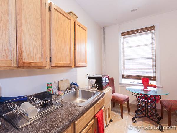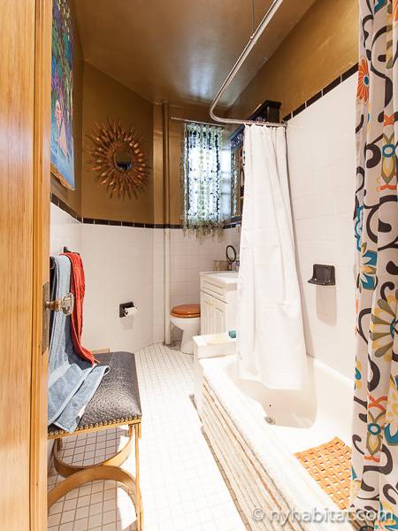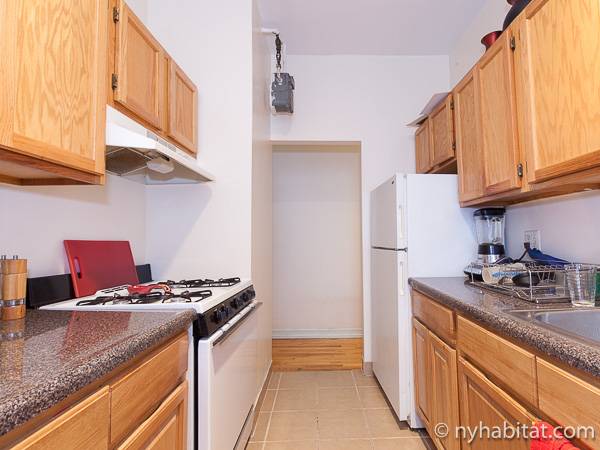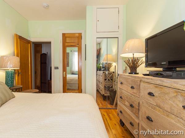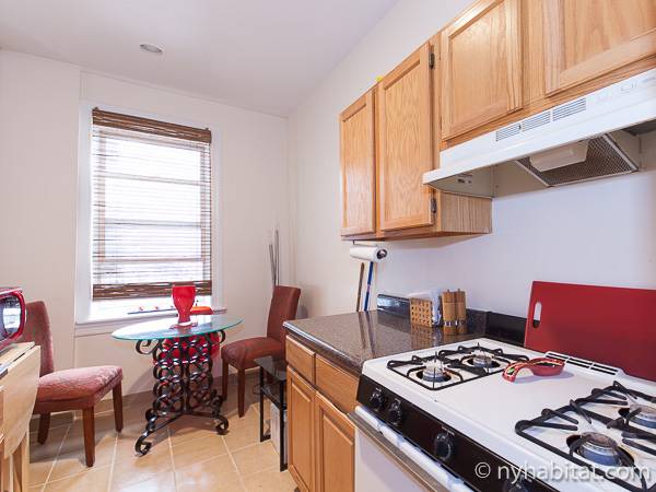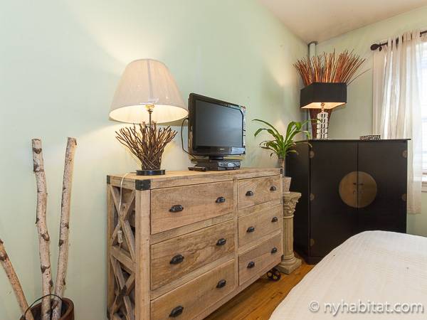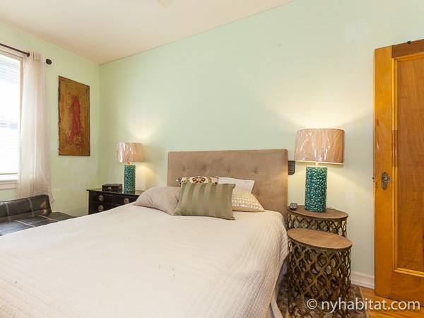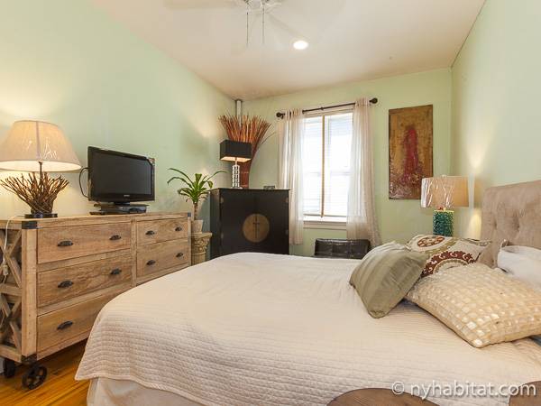 This New York apartment offers contemporary décor and beautiful hardwood flooring throughout. The bedroom’s light green walls accent the beige colored dresser and headboard of the queen sized bed. You will find a modern bathroom featuring a shower, bathtub and a WC for your convenience. A chef’s kitchen awaits you with all the appliances you need to cook your meals at home, including an oven, fridge, and a coffee maker.