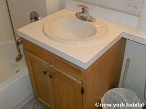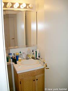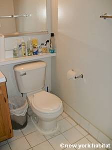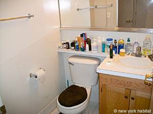 The first available bedroom features a private bathroom (Bedroom 1). Enjoy this 300 square foot bedroom with a private en suite half bathroom (sink and W/C). The room is lined with bamboo floors and is furnished with a queen size bed and a television with cable channels. There are shelves and a walk-in closet for storage. Air conditioning is available to cool the room, and there is wireless Internet access. A large window with eastern exposure allows in natural light and overlooks the neighborhood.