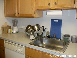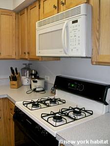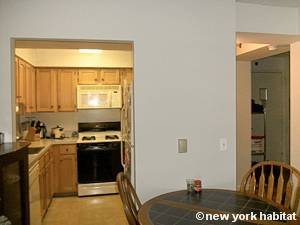 The kitchen and full bathroom (with bathtub/shower) are shared with the roommate. The rest of the apartment is also cooled by air conditioning. The separate kitchen is fully equipped with all the amenities needed for cooking and more, including the convenience of a dishwasher, microwave and food processor. There is a dining table in the living room for eating at home. The living room has two sitting areas, with a wall divider to separate the space.