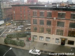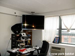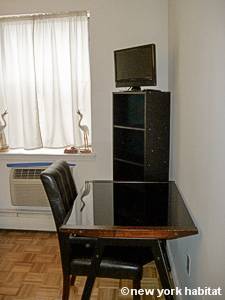 The second available bedroom (Bedroom 2), is smaller. Lined with bamboo floors, it is furnished with a with a double size bed, a desk, and a double size sofabed. There is a closet for storing your belongings and a television with cable access for entertainment. A window with eastern exposure allows in sunlight and give a view of the neighborhood, and there is also air conditioning available in this room.