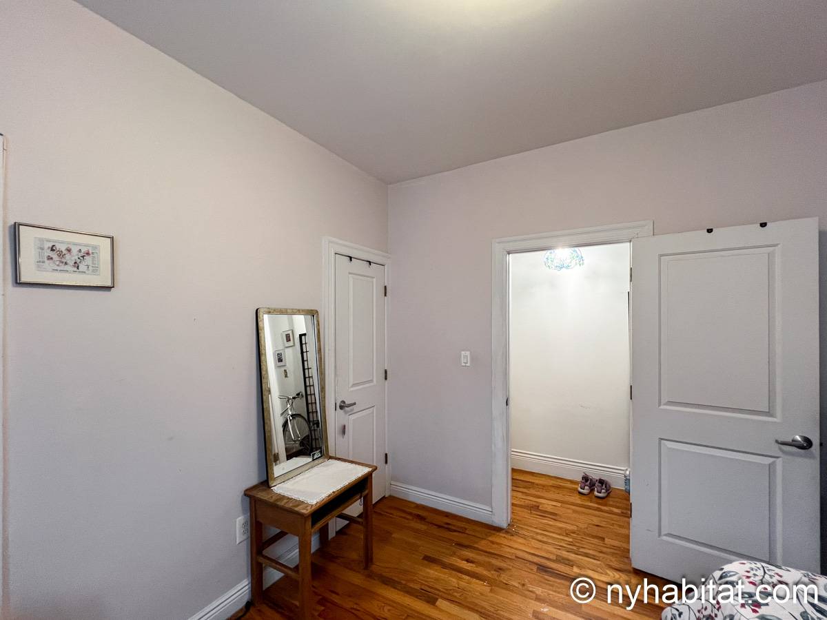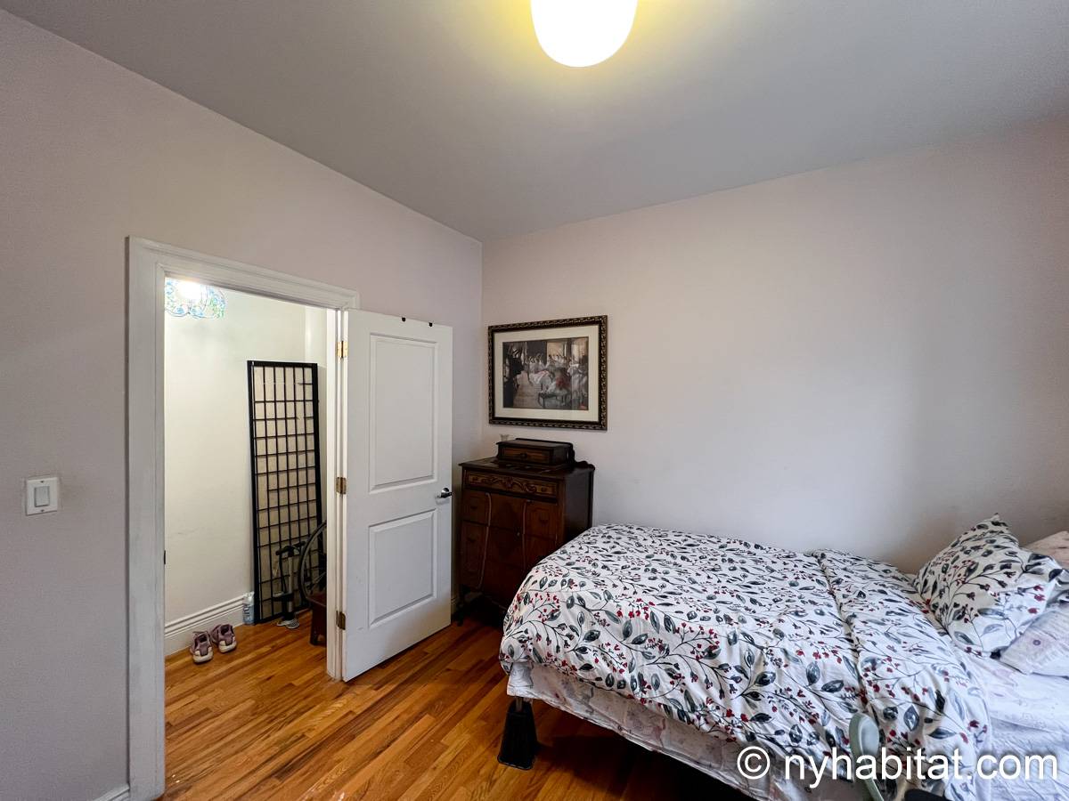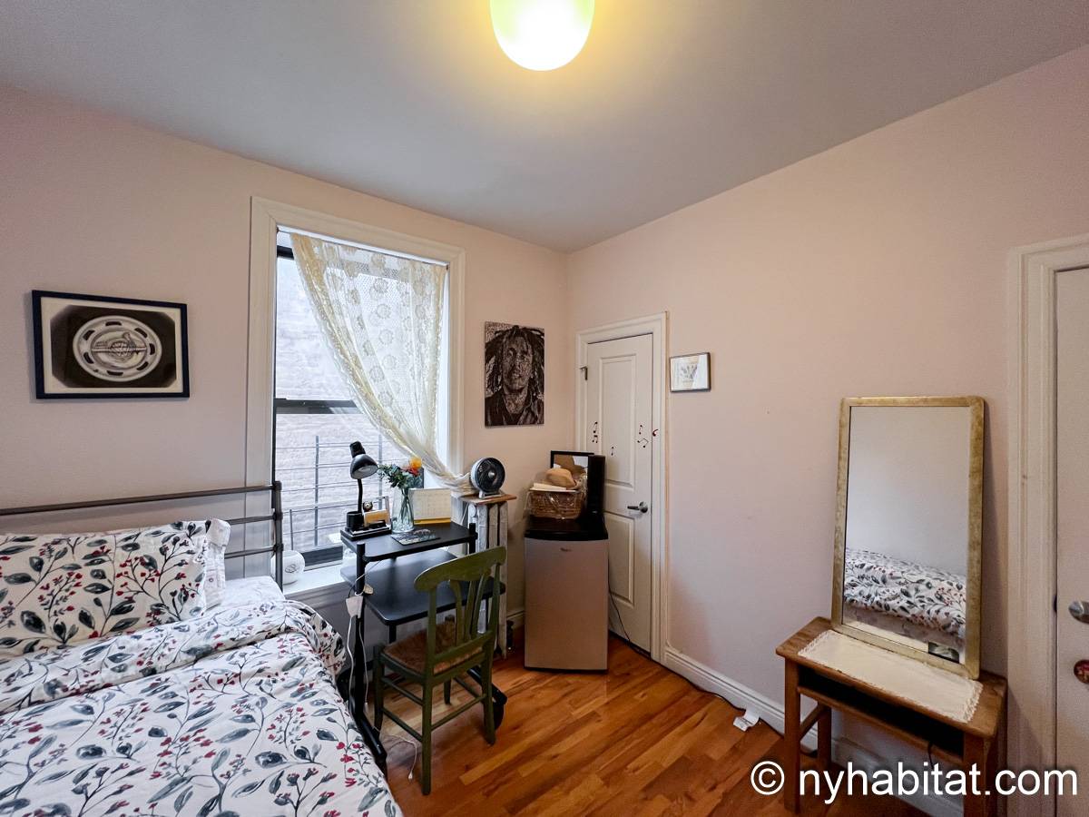 This furnished bedroom is in a shared apartment in Harlem, just off of the popular Lenox Avenue in uptown Manhattan, New York. The three-bedroom apartment is in a low-rise building with an elevator, found on the 4th floor. There is a buzzer/intercom system for easy entry for guests.